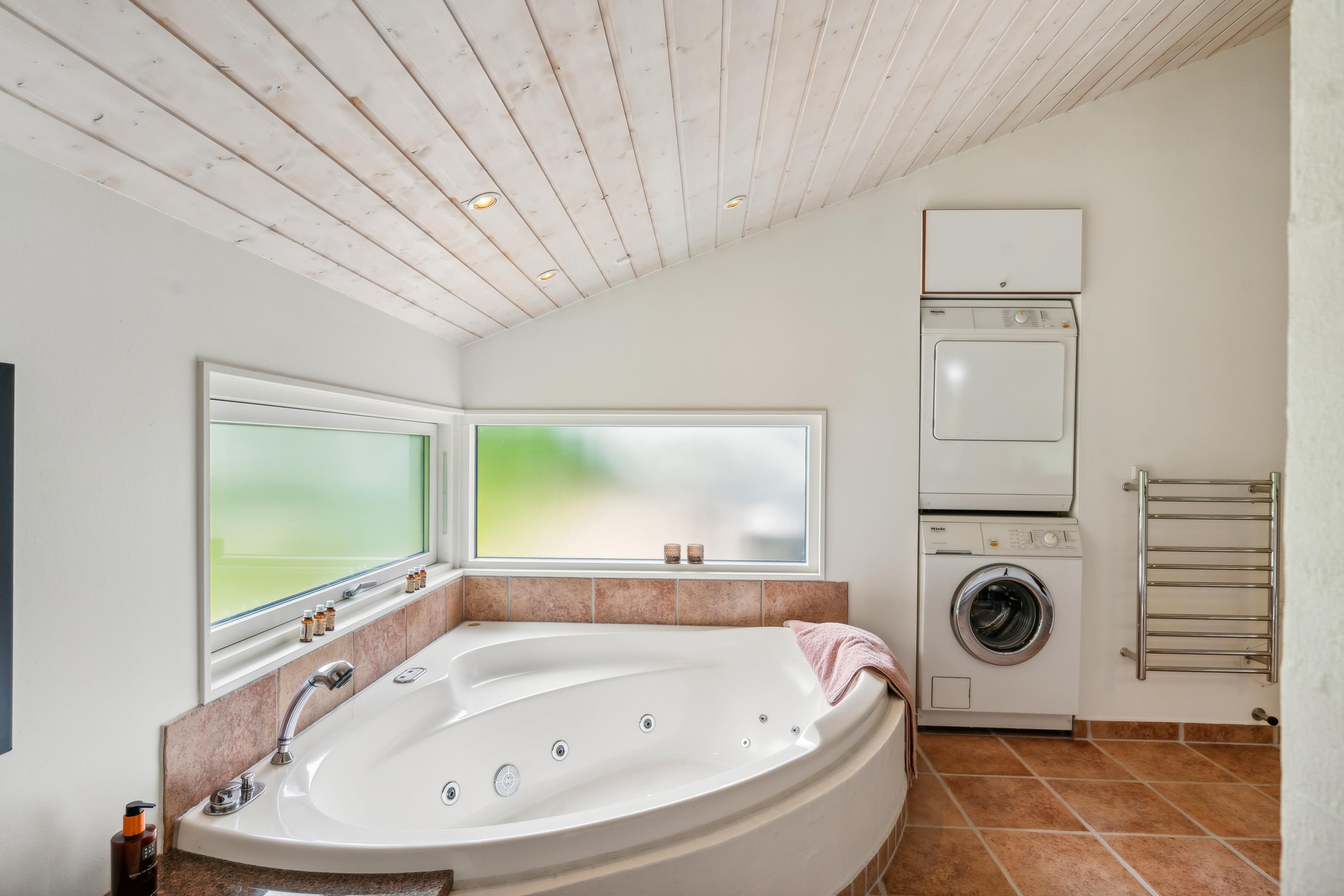 The house features a spacious and elegant bathroom with a spa bath, a shower, underfloor heating, and access to both a washing machine and a tumble dryer. Additionally, there is a second bathroom with a shower and underfloor heating. The sleeping arrangements consist of three beautifully decorated bedrooms, each with a double bed.