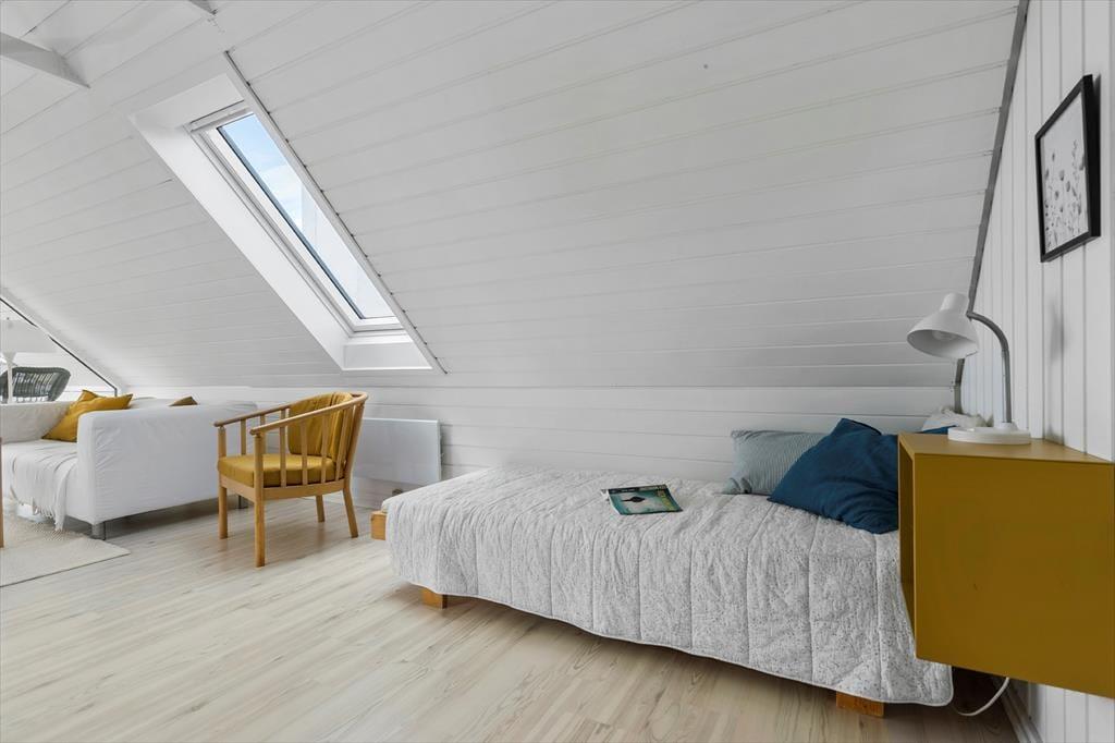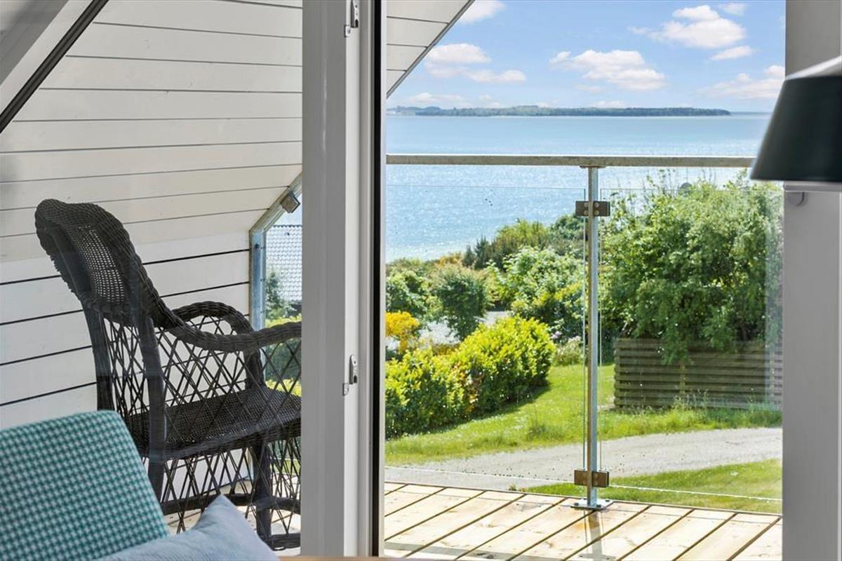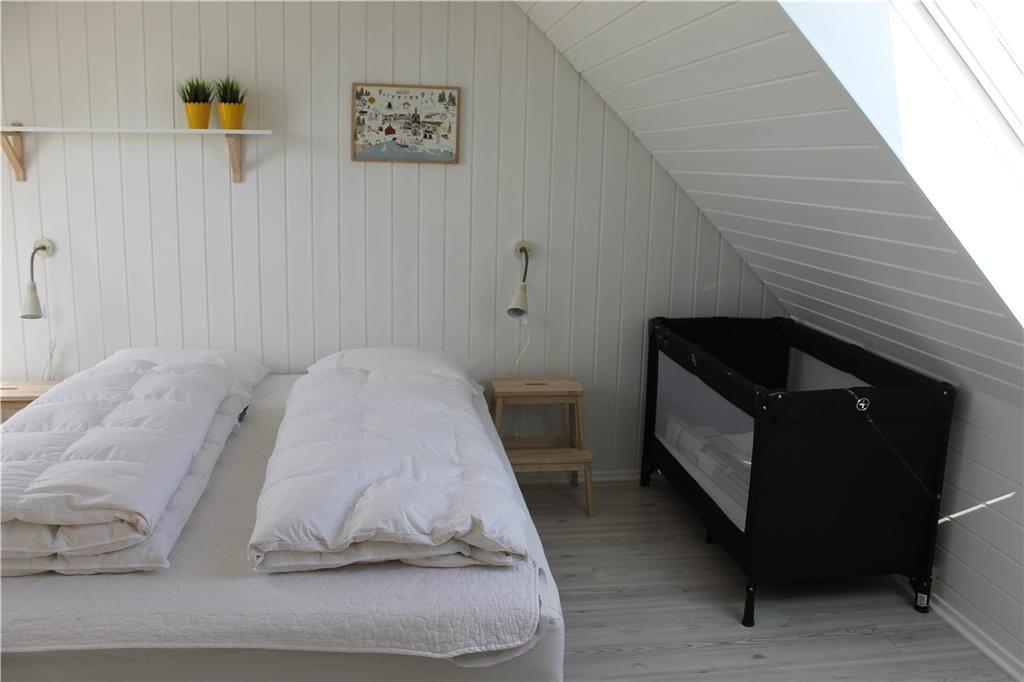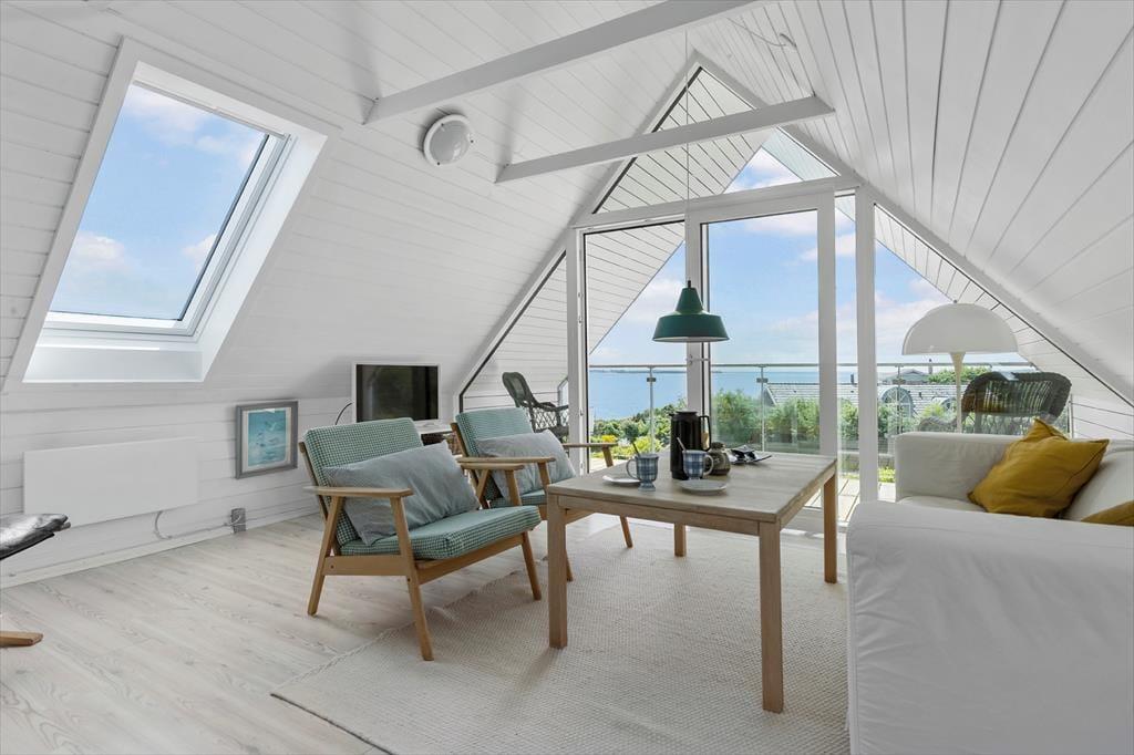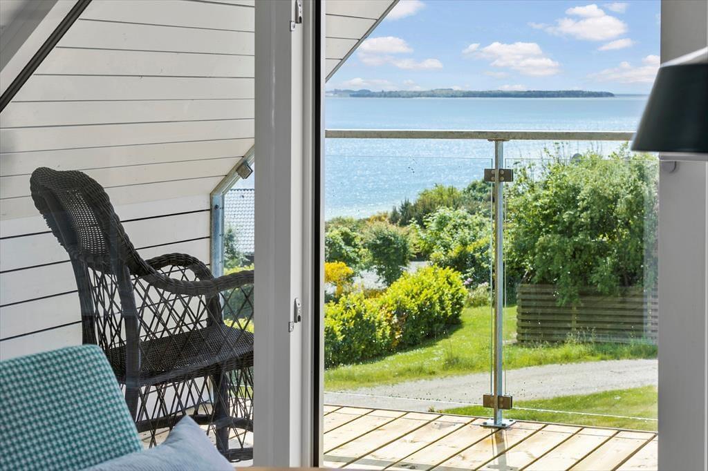 Im Obergeschoss befindet sich der gemütliche Wohnraum deines Urlaubsdomizils. Von hier aus kannst du hinaus auf den überdachten Balkon treten, auf dem dich die Aussicht über die Bucht unversehens in den Bann ziehen wird. Die Fensterpartie wurde in 2025 erneuert, so dass die fantastische Aussicht um so schöner genossen werden kann. Der dritte Schlafraum, der mit einem Doppelbett und einem Einzelbett eingerichtet ist, ist ebenfalls im Obergeschoss platziert. Für die kleinsten Gäste stehen ein Hochstuhl und ein Kinderbett bereit. Eine Internetverbindung ist vorhanden.