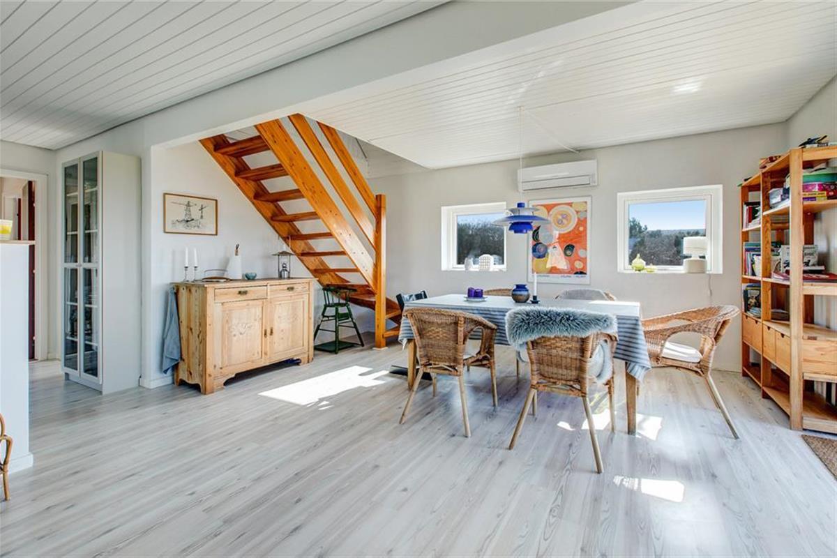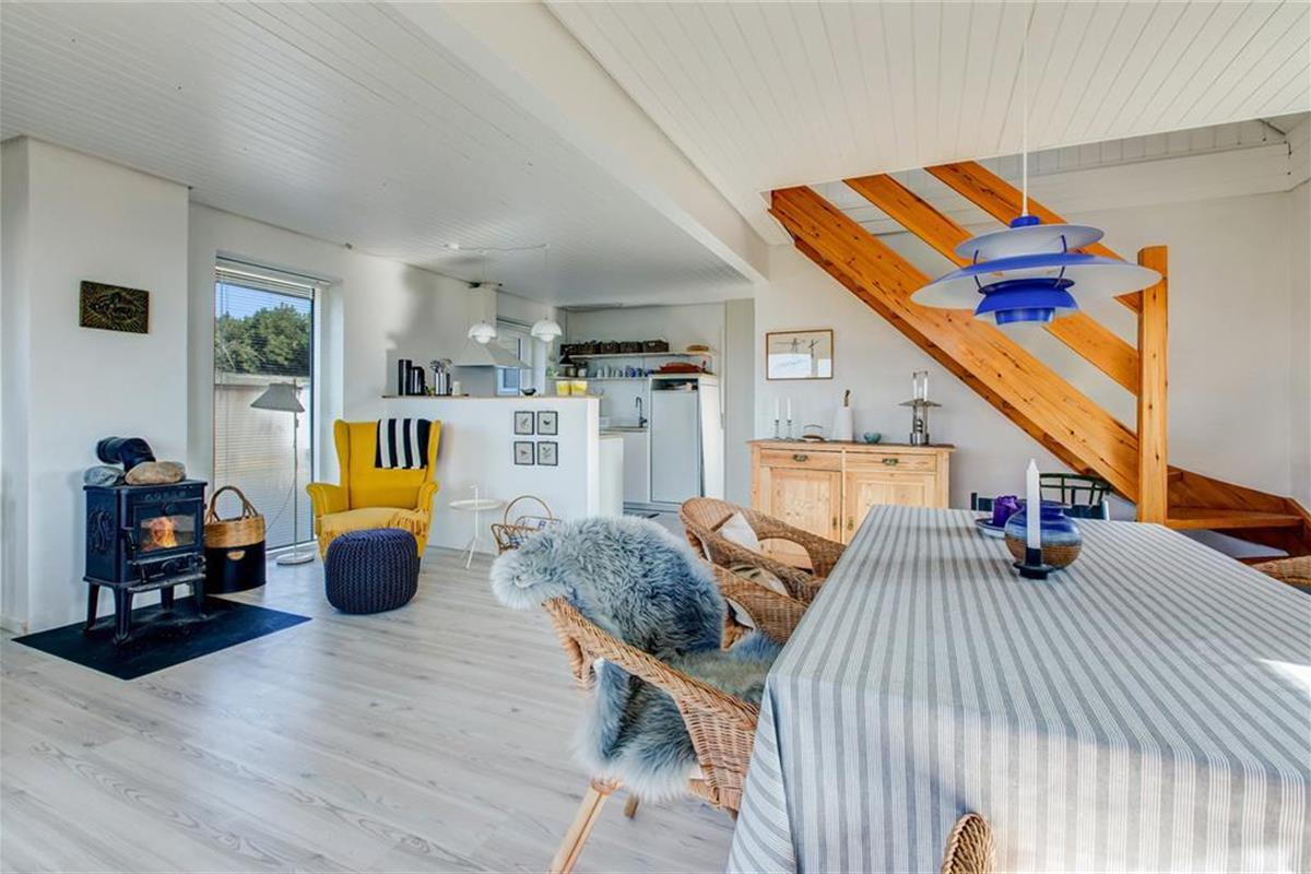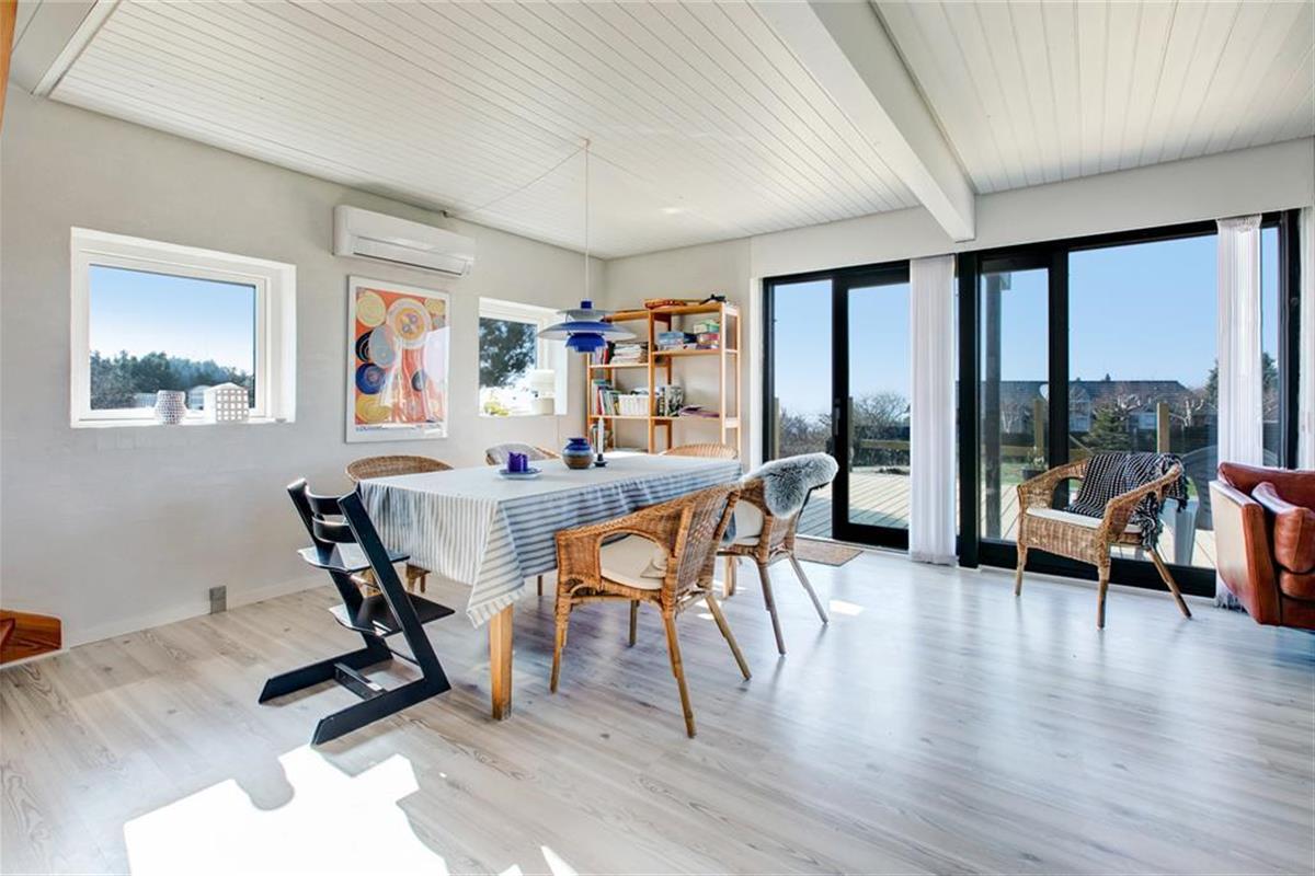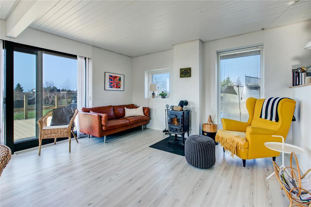 Mit fantastischem Meerblick heißt dich dieses gemütlich renovierte Ferienhaus willkommen. Bei der Einrichtung des zweigeschossigen Mietobjekts hat der Eigentümer großen Wert auf Komfort und beste Erholungsmöglichkeiten gelegt. Im Erdgeschoss empfängt dich eine Küche, die mit allem Notwendigen ausgestattet ist. Ein Geschirrspüler steht selbstverständlich zur Verfügung. Die Küche ist offen mit dem gemütlichen Esszimmer kombiniert, das mit einem Kaminofen und Tür zur großen Terrasse zu punkten weiß. Die wunderbare Aussicht auf die Ebeltoft Vig untermalt eure geselligen Runden und Mahlzeiten am Esstisch in schönster Weise. Das Erdgeschoss umfasst außerdem ein attraktives Badezimmer mit Duschnische und Fußbodenheizung und zwei Schlafräumen. Einer der Schlafräume verfügt über ein Einzelbett. Im zweiten Raum erwarten dich zwei Einzelbetten, die bei Bedarf zu einem Doppelbett zusammengeschoben werden können.