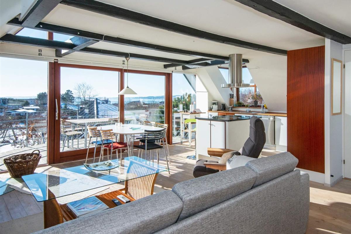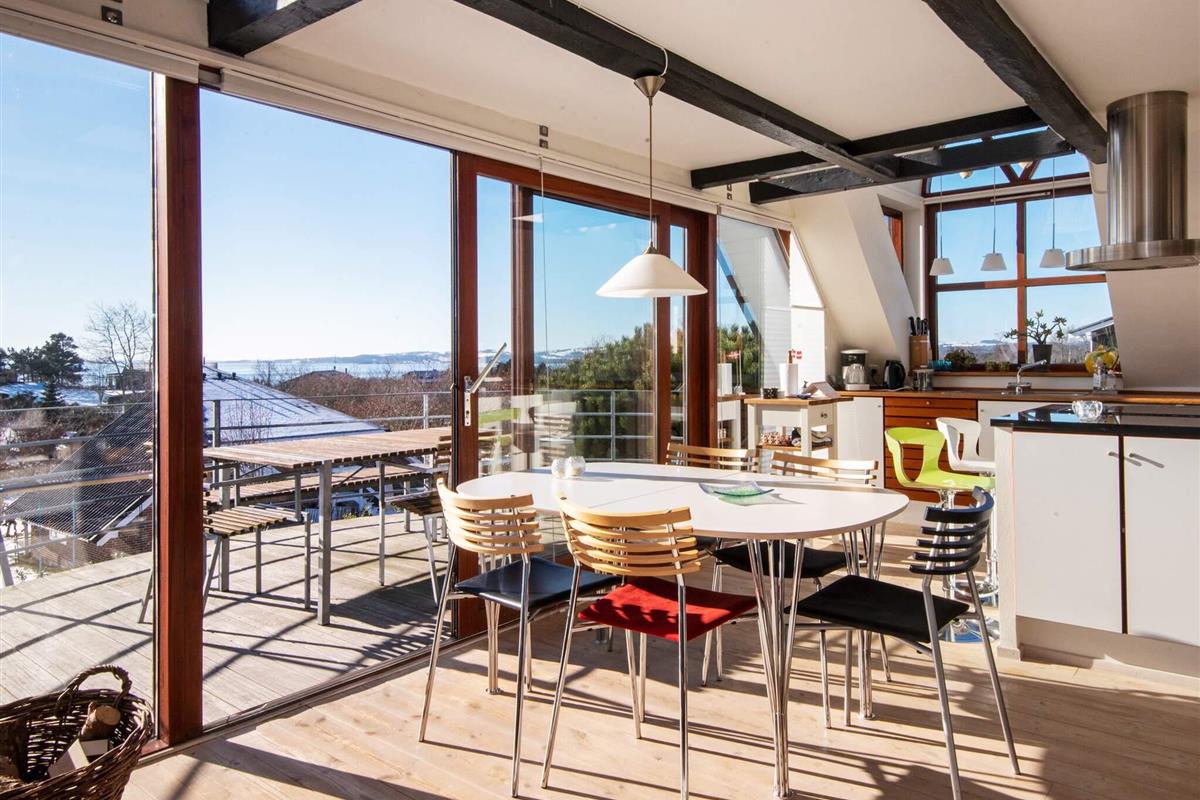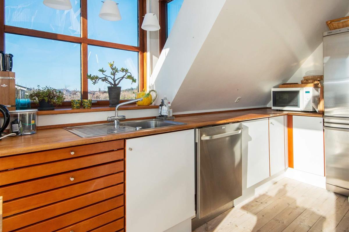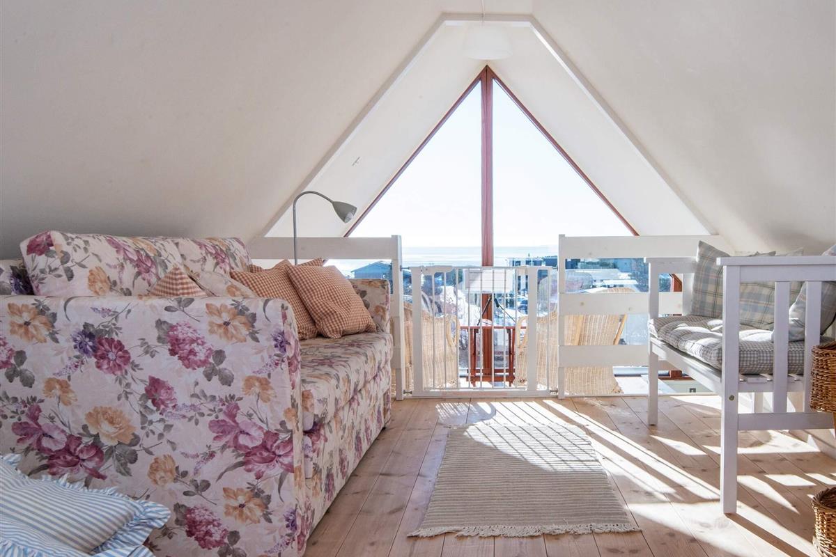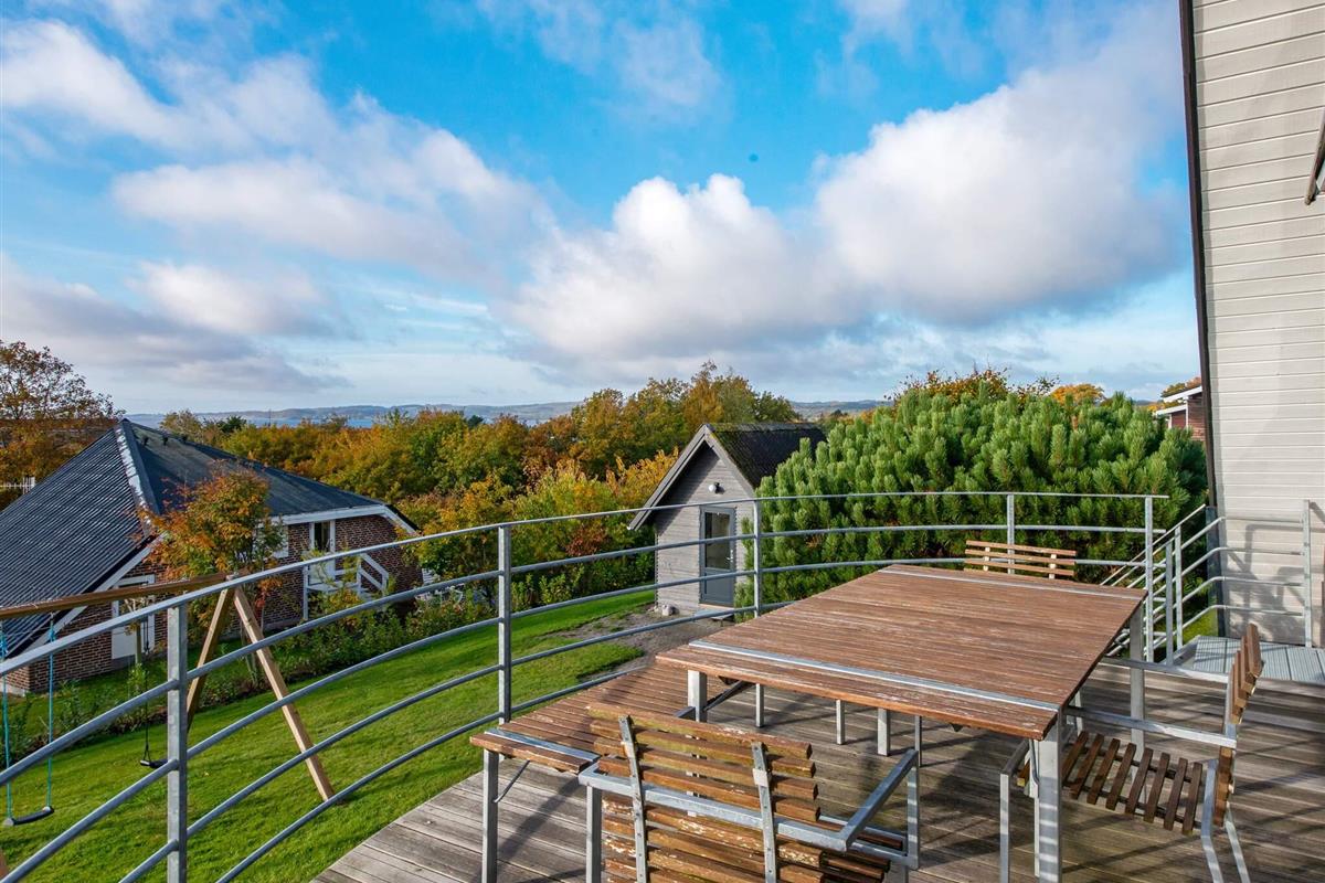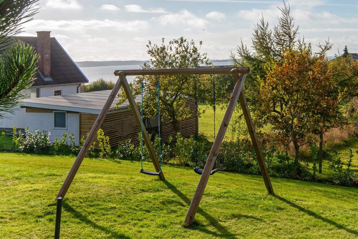 Die offen in den Wohnbereich integrierte Küche ist ein Plus für das Familienleben. Von dort gelangt man auch in die obere Etage, wo die Aussicht noch besser ist. Zum Haus gehört auch eine Holzveranda, wo man gut abgeschirmt Platz nehmen und sich entspannen kann. Kinder freuen sich bestimmt über die Schaukel auf dem Grundstück. An Sommerabenden kann im Garten gegrillt werden.
