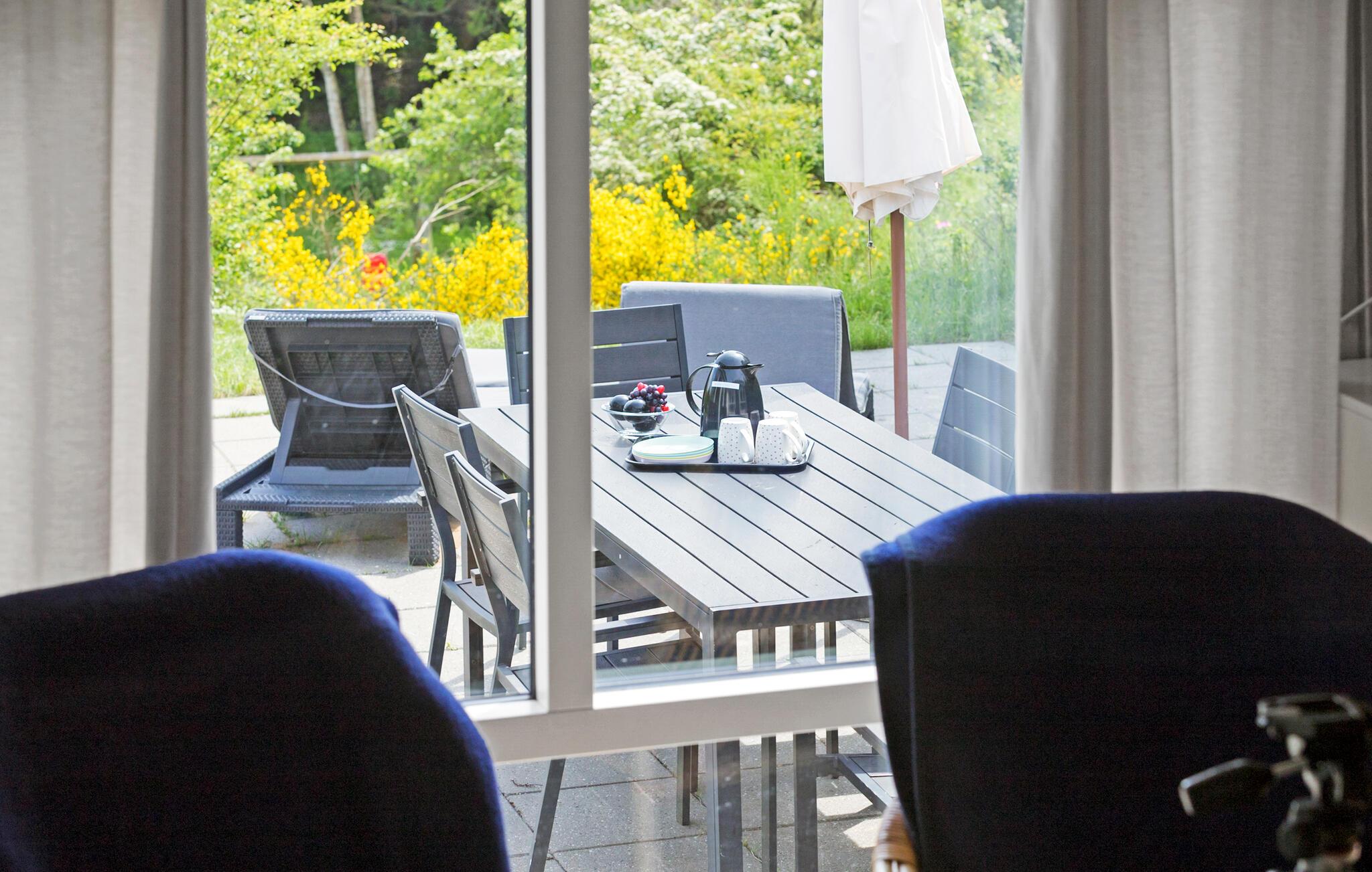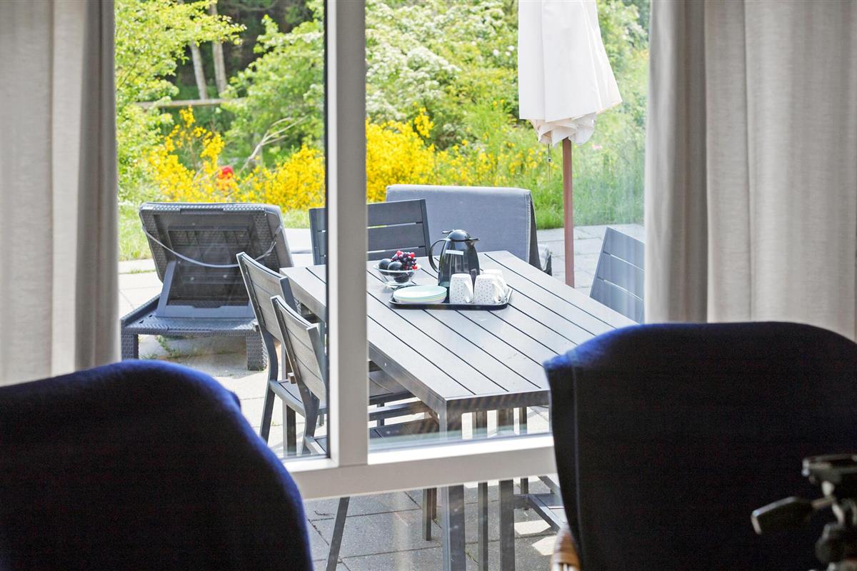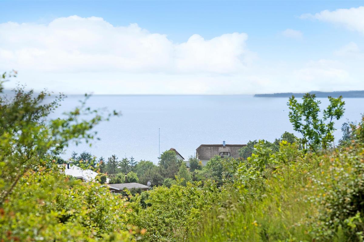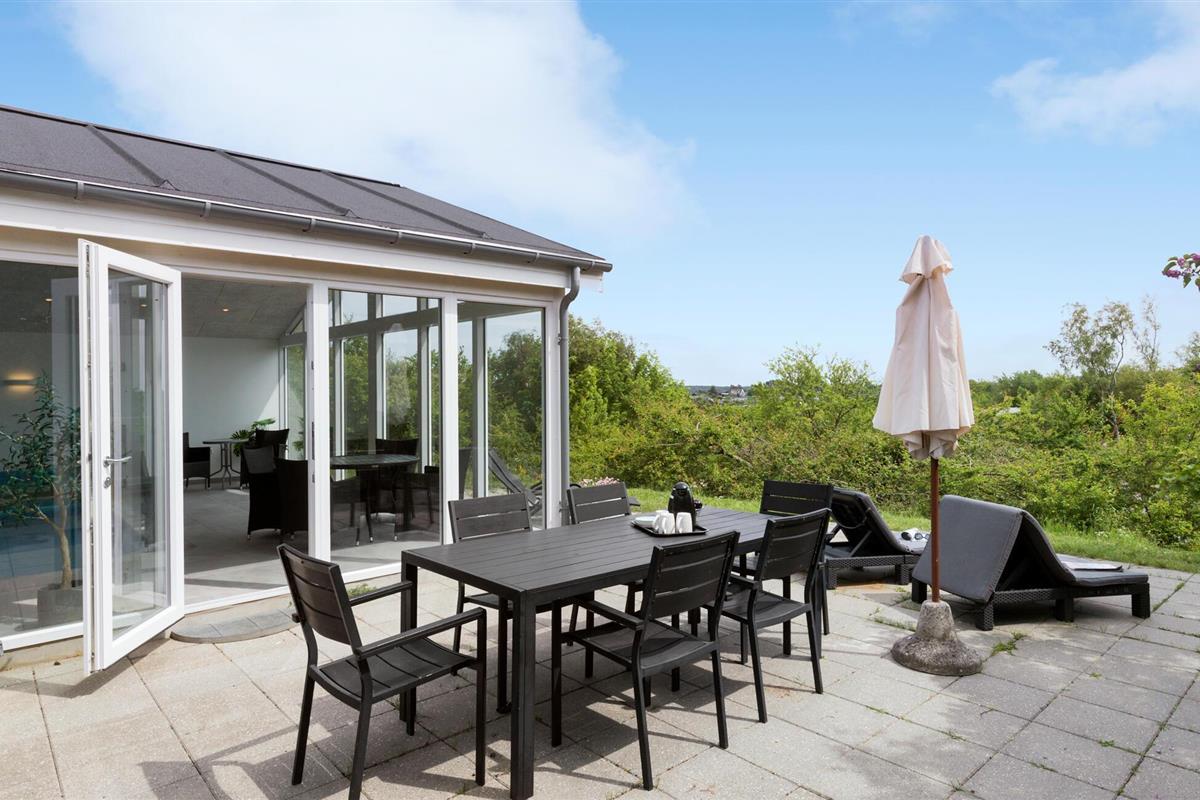Het terras met uitzicht op zee nodigt je uit om te genieten van de frisse zeelucht en de zon te zien ondergaan boven de baai van Ebeltoft.