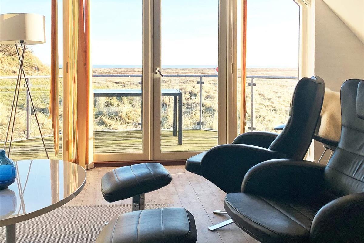 zur Verfügung. Der große Raum bietet auch Zugang zur Südterrasse des Hauses. Zudem führt vom Wohnbereich eine Treppe hinauf ins Dachgeschoss, wo es ein großes Wohnzimmer mit Balkon davor, der Ausblick zur herrlichen Dünenlandschaft bietet.