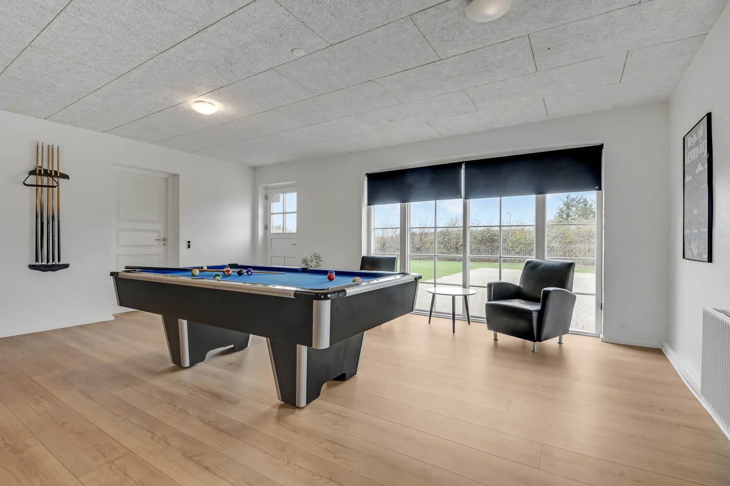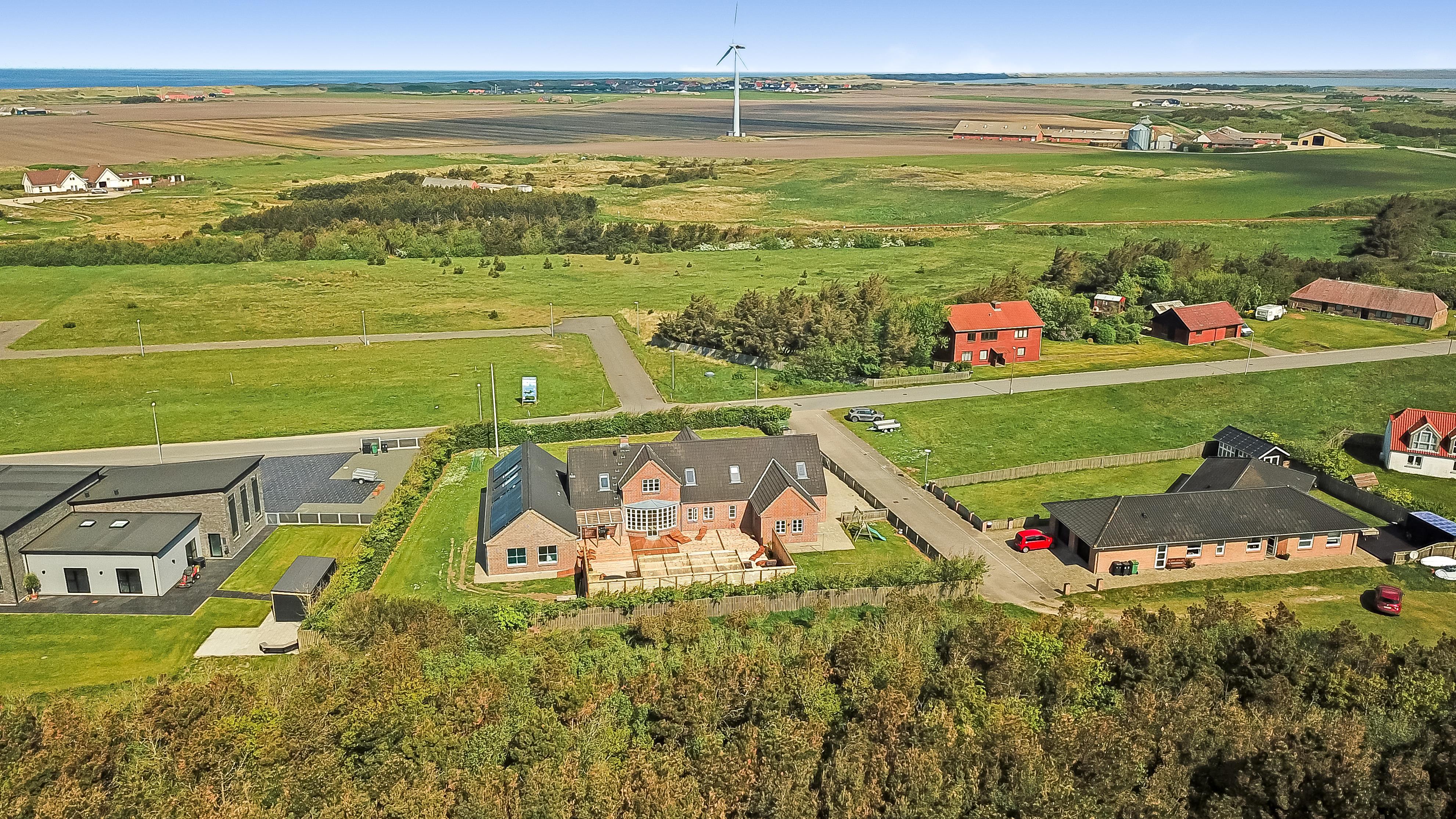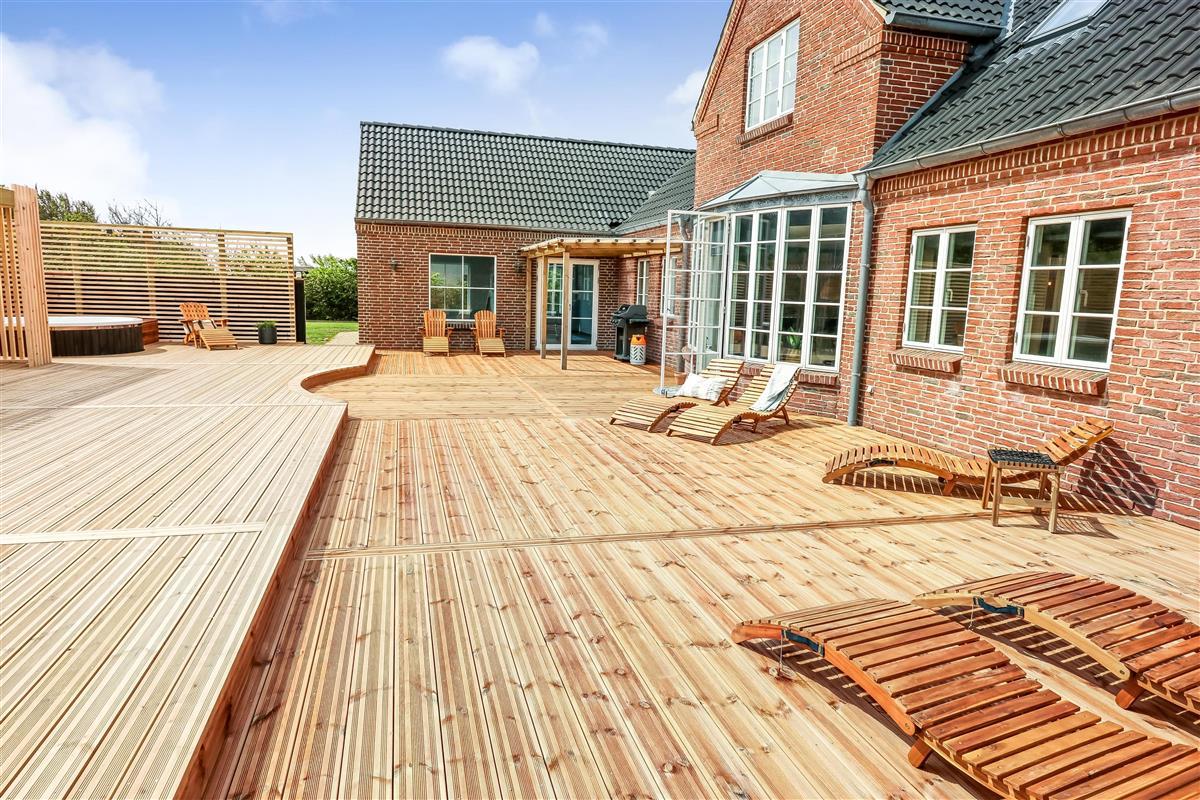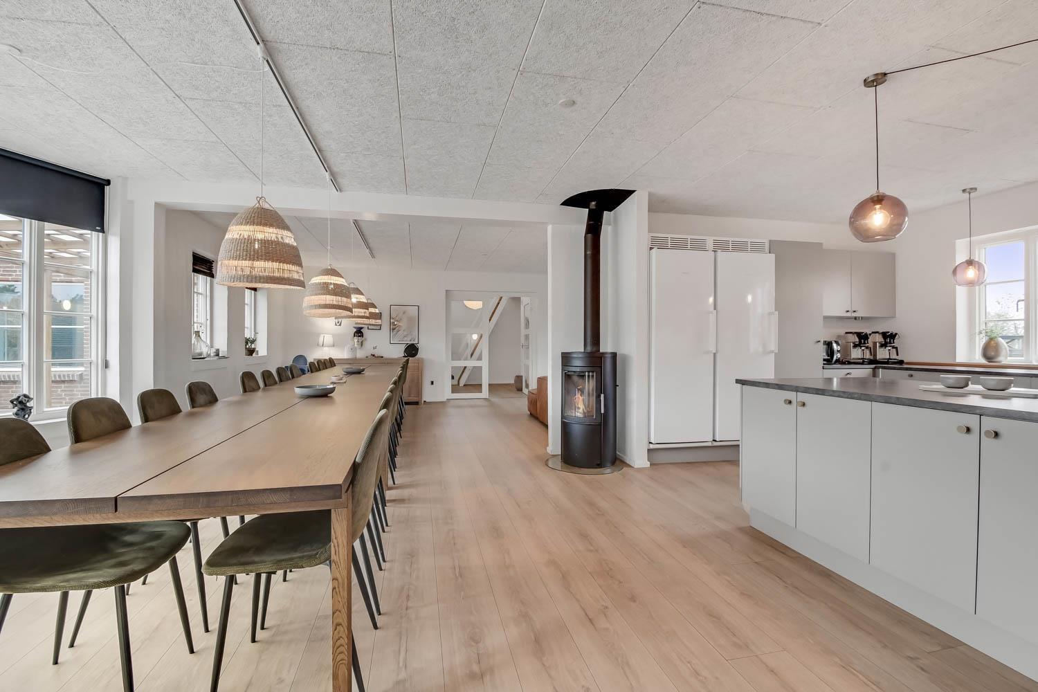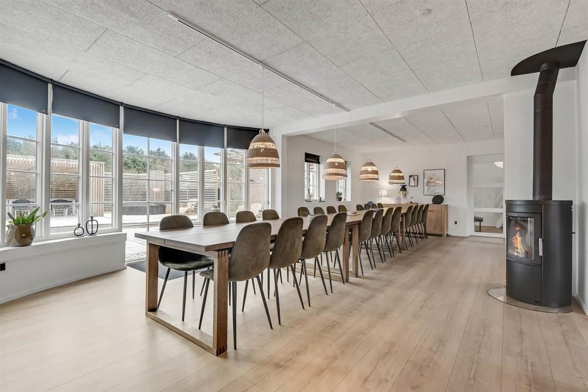 Das Ganzjahreshaus ist 550 m² groß und hat kostenfreies WLAN. Zentrum ist die große, offene Küche mit einem geräumigen Wohn- und Essbereich mit Fußbodenheizung. Hier bieten sich gute Möglichkeiten zum Entspannen. Die Küche ist komplett ausgestattet, sodass man für alle Bewohner ein wunderbares Abendessen zubereiten kann. Die Türen im Haus sind 90 cm breit. Sie können von der Wohnküche direkt ins Schlafzimmer gehen, was relativ behindertenfreundlich ist. In den schönen Möbeln können Sie sowohl dänisches als auch deutsches Programm auf dem Flachbildschirm-TV genießen oder DVD abspielen. An kühlen Abenden sorgt der Holzofen für zusätzliche Gemütlichkeit. Das Haus verfügt über einen geräumigen Wellnessbereich mit Sauna, einen großen Pool mit Rutsche und einen Whirlpool. Es gibt 4 Badezimmer, jedes mit Toilette, Dusche und Fußbodenheizung. Im Erdgeschoss befinden sich 4 Schlafzimmer für 8 Personen. Im Obergeschoss 5 Schlafzimmer für 10 Personen und ein großer Hems (Schlafboden) mit 6 weiteren Schlafplätzen. Hier gibt es auch ein weiteres schönes Wohnzimmer mit TV sowie ein Badezimmer mit einer Badewanne. Im Aktivitätsraum gibt es u. a. Billard, Tischkicker, Airhockey, Playstation 3 und Tischtennis. Das Haus ist als Energieoptimiertes Haus gemacht, da es mit Fernwärme aufgewärmt wird – was in Harboøre eine wesentlich billigere Aufwärmung als Strom ist. Im Moment ist der Preis für Fernwärme 2,50 kr. pro Einheit. Außerdem bezahlt man auch für Strom und Wasser. Kaution Wintersaison EUR 1000 und Sommersaison EUR 700. Wenn Sie ein Elektroauto oder einen Plug-in-Hybrid haben, verfügt das Haus über eine Ladebox ab. ca 1.6.2023. Als Mieter haben Sie freien Zutritt zur Haboøre Centret.