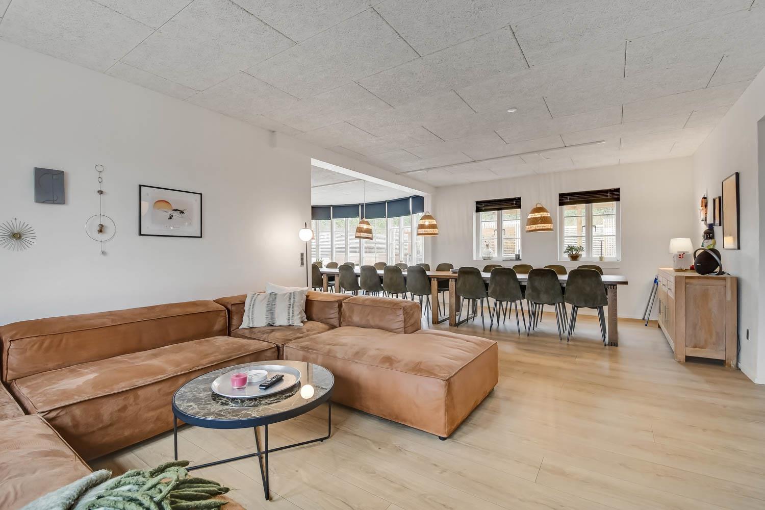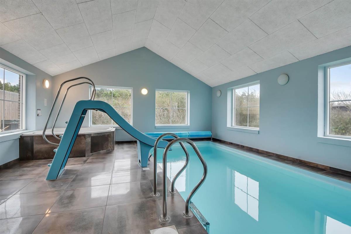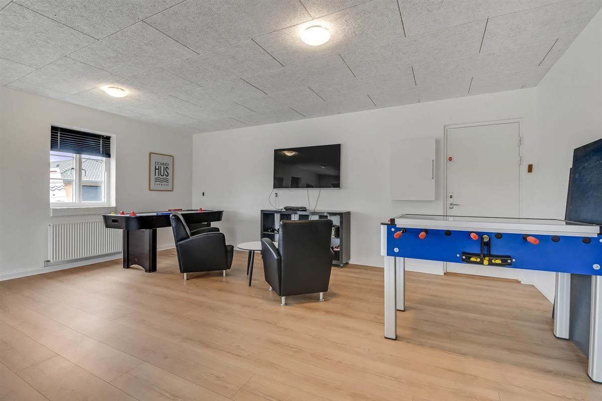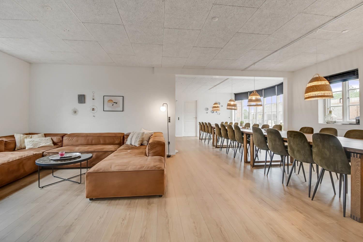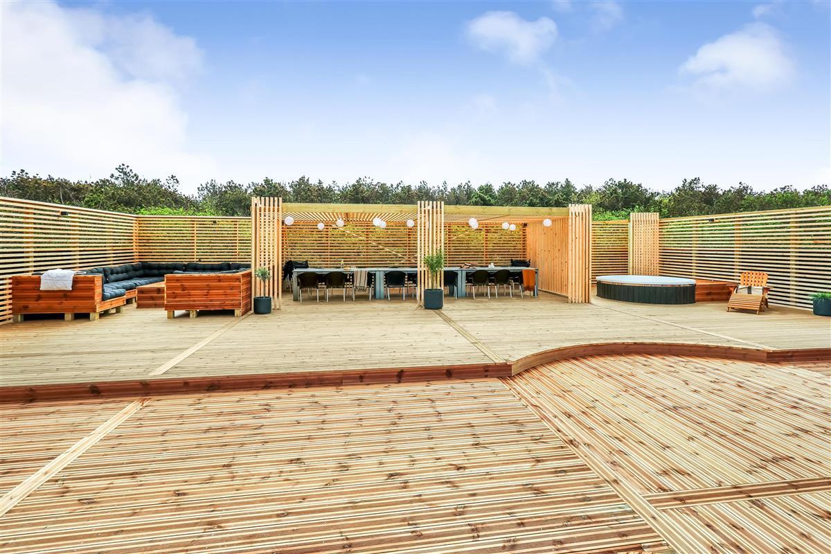Das Ganzjahreshaus ist 550 m² groß und hat kostenfreies WLAN. Zentrum ist die große, offene Küche mit einem geräumigen Wohn- und Essbereich mit Fußbodenheizung. Hier bieten sich gute Möglichkeiten zum Entspannen. Die Küche ist komplett ausgestattet, sodass man für alle Bewohner ein wunderbares Abendessen zubereiten kann. Die Türen im Haus sind 90 cm breit. Sie können von der Wohnküche direkt ins Schlafzimmer gehen, was relativ behindertenfreundlich ist. In den schönen Möbeln können Sie sowohl dänisches als auch deutsches Programm auf dem Flachbildschirm-TV genießen oder DVD abspielen. An kühlen Abenden sorgt der Holzofen für zusätzliche Gemütlichkeit. Das Haus verfügt über einen geräumigen Wellnessbereich mit Sauna, einen großen Pool mit Rutsche und einen Whirlpool. Es gibt 4 Badezimmer, jedes mit Toilette, Dusche und Fußbodenheizung. Im Erdgeschoss befinden sich 4 Schlafzimmer für 8 Personen. Im Obergeschoss 5 Schlafzimmer für 10 Personen und ein großer Hems (Schlafboden) mit 6 weiteren Schlafplätzen. Hier gibt es auch ein weiteres schönes Wohnzimmer mit TV sowie ein Badezimmer mit einer Badewanne. Im Aktivitätsraum gibt es u. a. Billard, Tischkicker, Airhockey, Playstation 3 und Tischtennis. Das Haus ist als Energieoptimiertes Haus gemacht, da es mit Fernwärme aufgewärmt wird – was in Harboøre eine wesentlich billigere Aufwärmung als Strom ist. Im Moment ist der Preis für Fernwärme 2,50 kr. pro Einheit. Außerdem bezahlt man auch für Strom und Wasser. Kaution Wintersaison EUR 1000 und Sommersaison EUR 700. Wenn Sie ein Elektroauto oder einen Plug-in-Hybrid haben, verfügt das Haus über eine Ladebox ab. ca 1.6.2023. Als Mieter haben Sie freien Zutritt zur Haboøre Centret.