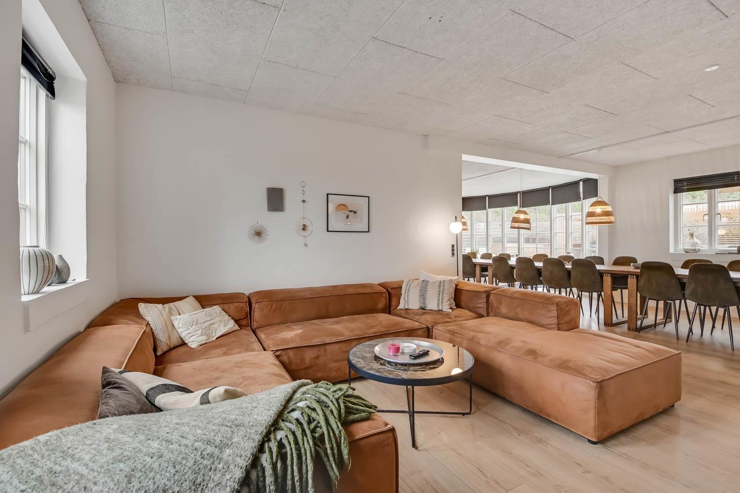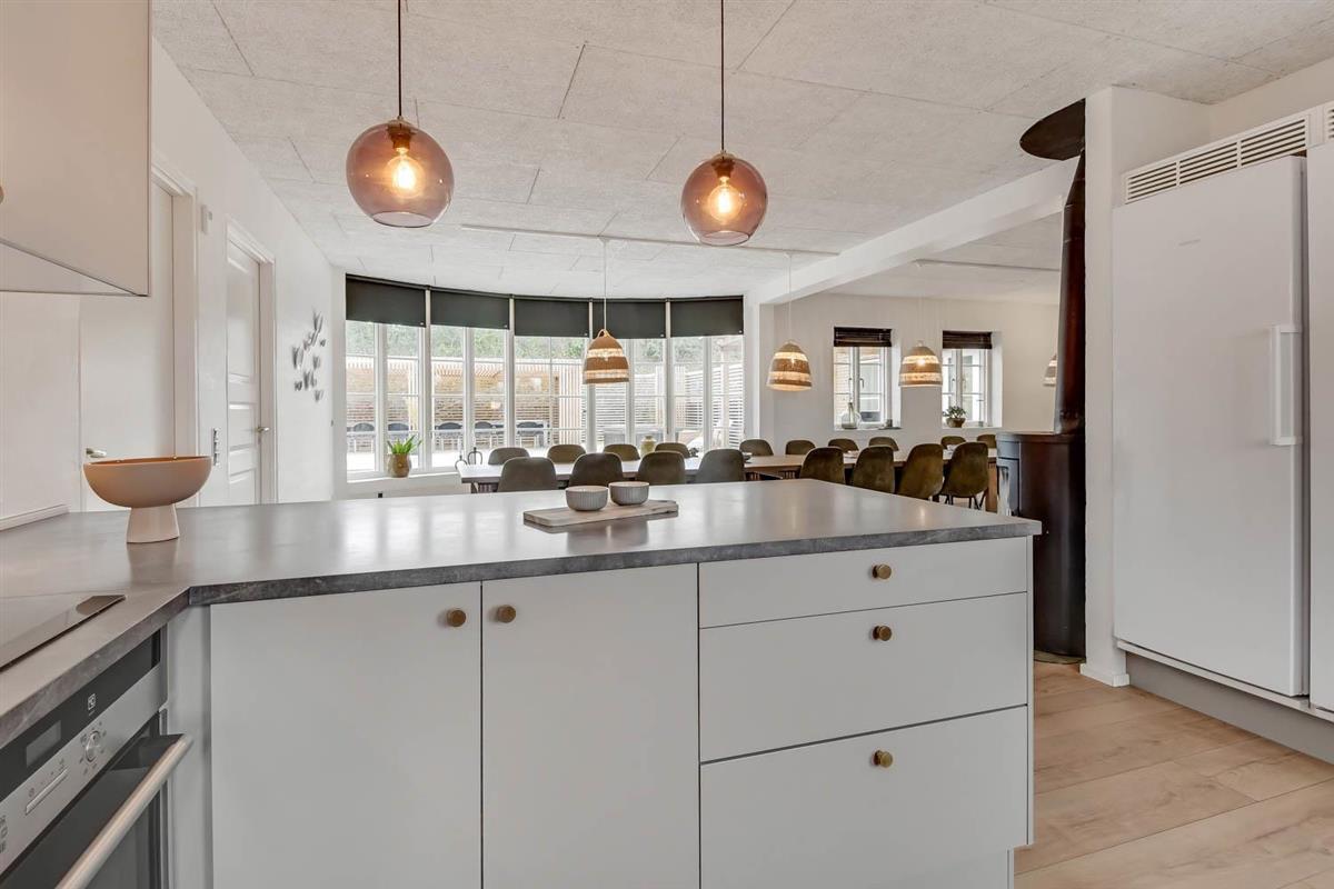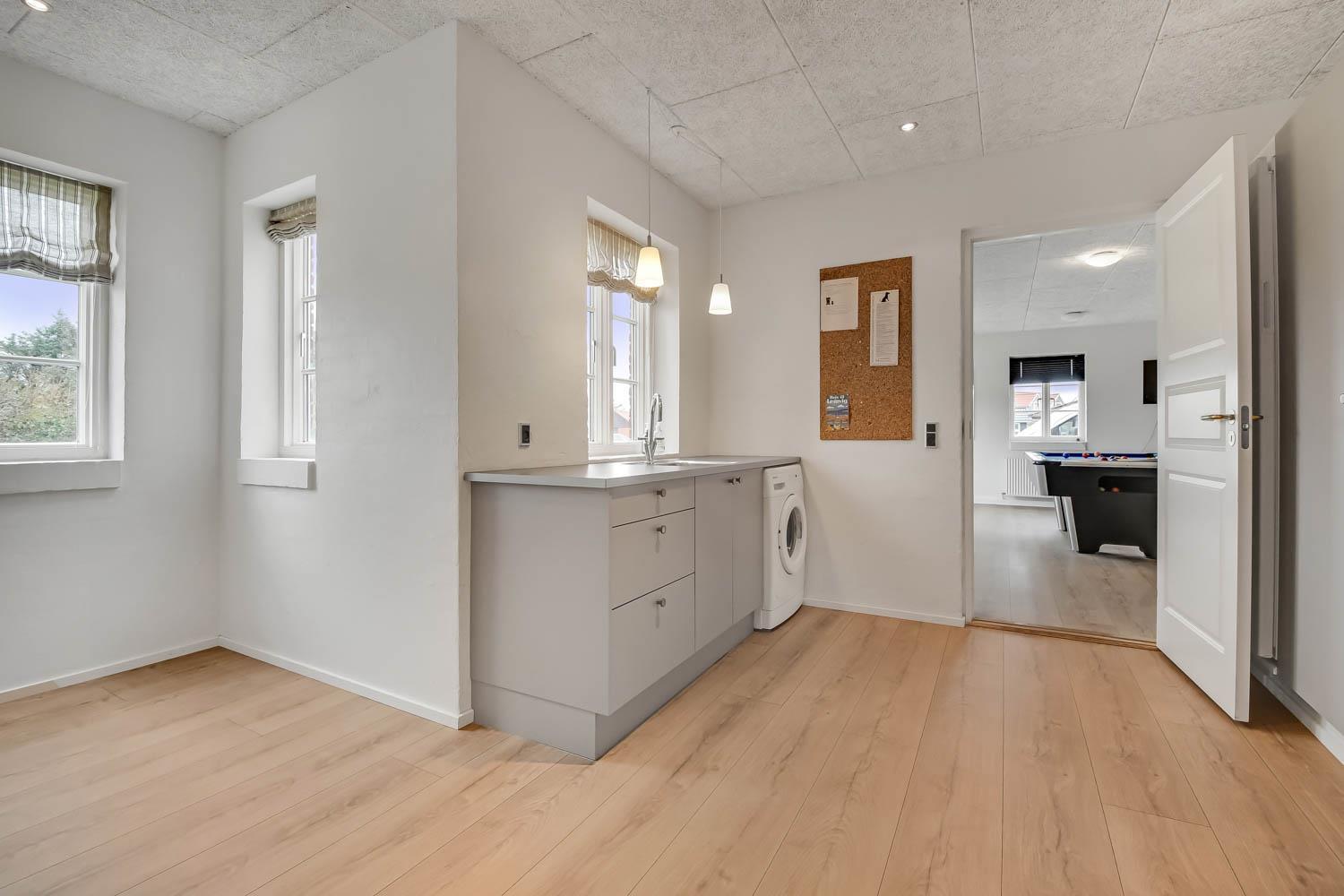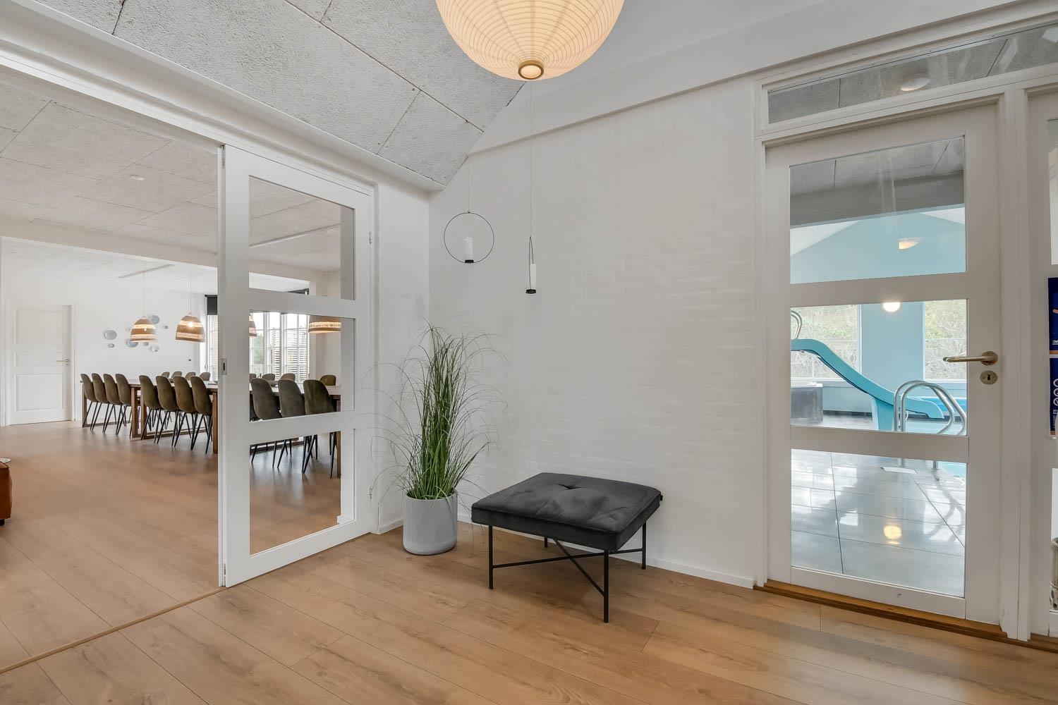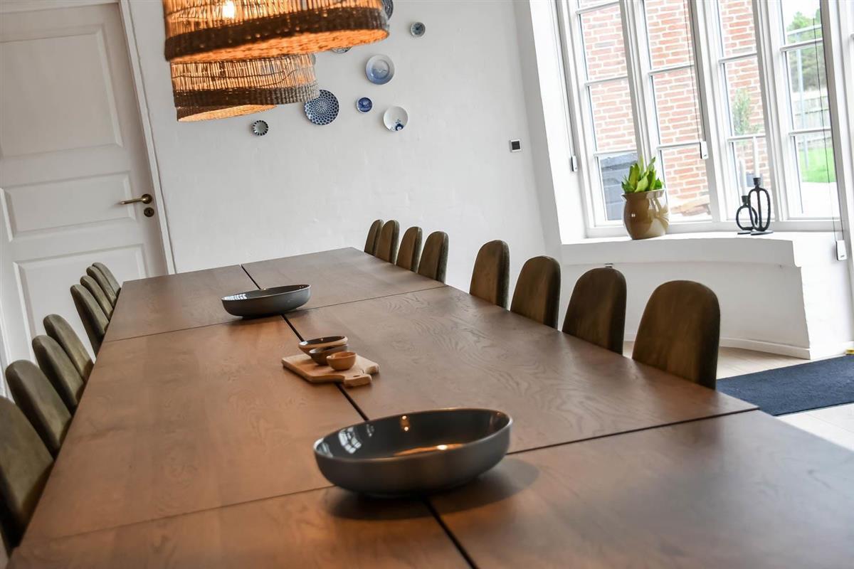 Das Ganzjahreshaus ist 550 m² groß und hat kostenfreies WLAN. Zentrum ist die große, offene Küche mit einem geräumigen Wohn- und Essbereich mit Fußbodenheizung. Hier bieten sich gute Möglichkeiten zum Entspannen. Die Küche ist komplett ausgestattet, sodass man für alle Bewohner ein wunderbares Abendessen zubereiten kann. Die Türen im Haus sind 90 cm breit. Sie können von der Wohnküche direkt ins Schlafzimmer gehen, was relativ behindertenfreundlich ist. In den schönen Möbeln können Sie sowohl dänisches als auch deutsches Programm auf dem Flachbildschirm-TV genießen oder DVD abspielen. An kühlen Abenden sorgt der Holzofen für zusätzliche Gemütlichkeit. Das Haus verfügt über einen geräumigen Wellnessbereich mit Sauna, einen großen Pool mit Rutsche und einen Whirlpool. Es gibt 4 Badezimmer, jedes mit Toilette, Dusche und Fußbodenheizung. Im Erdgeschoss befinden sich 4 Schlafzimmer für 8 Personen. Im Obergeschoss 5 Schlafzimmer für 10 Personen und ein großer Hems (Schlafboden) mit 6 weiteren Schlafplätzen. Hier gibt es auch ein weiteres schönes Wohnzimmer mit TV sowie ein Badezimmer mit einer Badewanne. Im Aktivitätsraum gibt es u. a. Billard, Tischkicker, Airhockey, Playstation 3 und Tischtennis. Das Haus ist als Energieoptimiertes Haus gemacht, da es mit Fernwärme aufgewärmt wird – was in Harboøre eine wesentlich billigere Aufwärmung als Strom ist. Im Moment ist der Preis für Fernwärme 2,50 kr. pro Einheit. Außerdem bezahlt man auch für Strom und Wasser. Kaution Wintersaison EUR 1000 und Sommersaison EUR 700. Wenn Sie ein Elektroauto oder einen Plug-in-Hybrid haben, verfügt das Haus über eine Ladebox ab. ca 1.6.2023. Als Mieter haben Sie freien Zutritt zur Haboøre Centret.