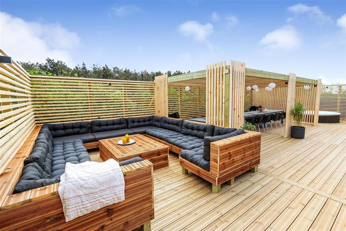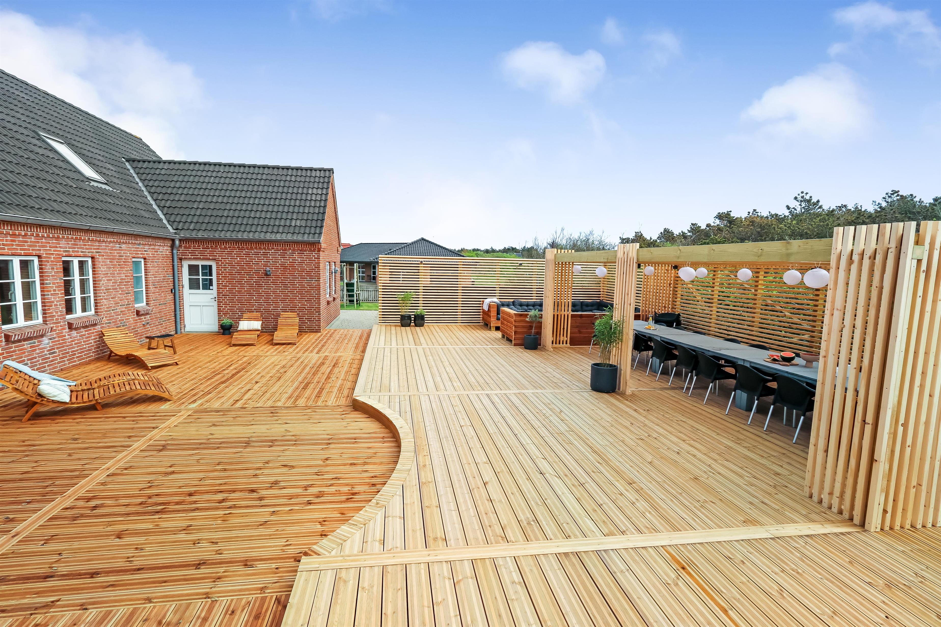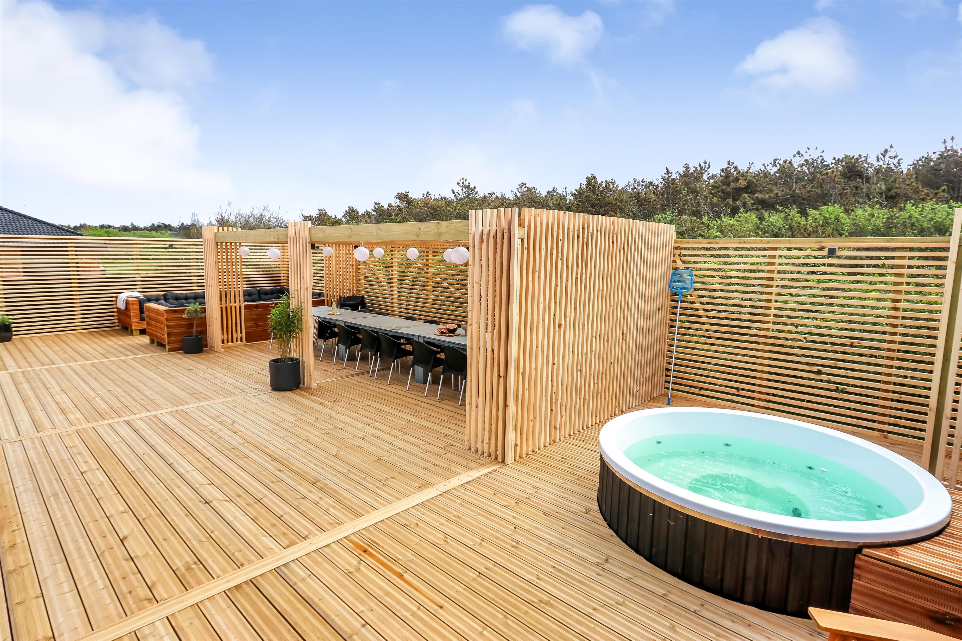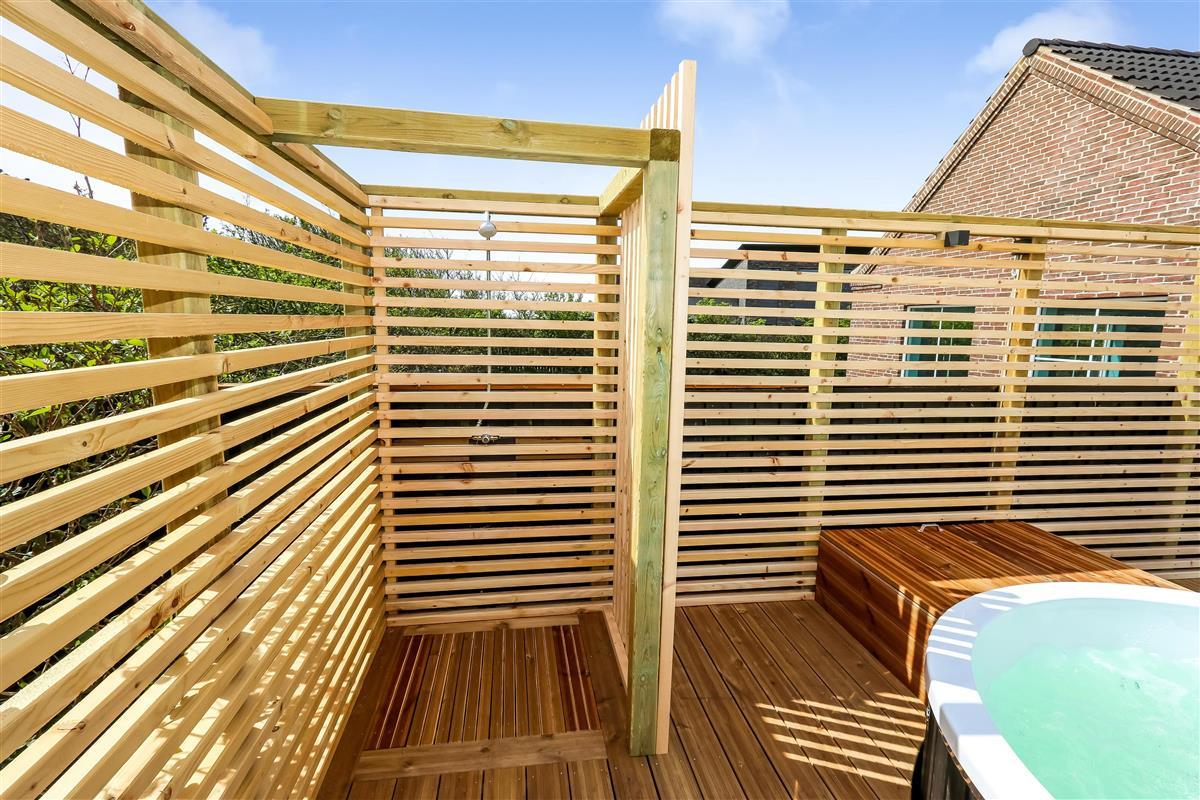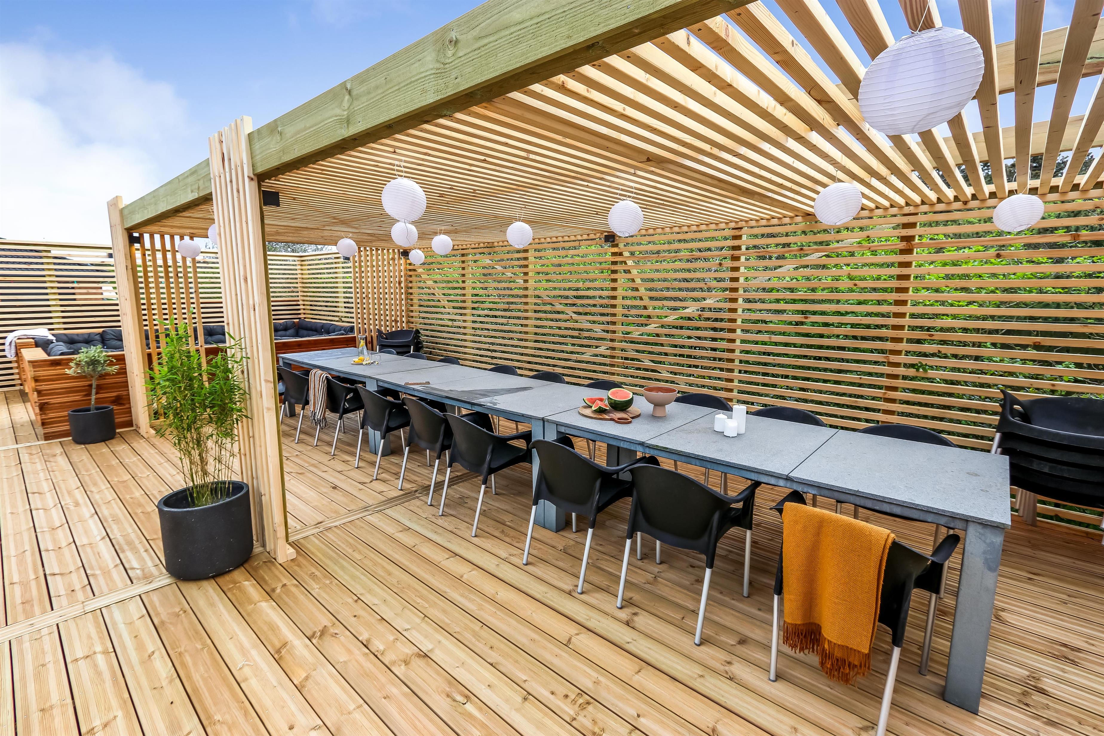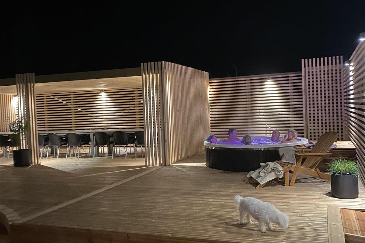 Zentral gelegen auf einem vollständig eingezäunten, gepflegten Grundstück in der Nähe von Einkaufsmöglichkeiten, Restaurants und nur 800 m von der Nordsee entfernt. Die Außenbereiche sind ein Kapitel für sich. Große, gepflegte Terrassen mit Gartenmöbeln. Hinter dem Haus befindet sich eine komplett neu errichtete Holzterrasse, die eine "südländische" Atmosphäre schafft. Es gibt Lounge-Sets, Liegestühle, eine Pergola mit großem Gartentisch und Stühlen, einen Bereich mit einer Außendusche und einen tiefgesetzten Whirlpool für 4-6 Personen - der perfekte Ort, um das Leben im Freien zu genießen. Eingezäuntes Grundstück mit vielen windgeschützten Stellen zum Sonnen. Für Kinder gibt es einen Spielturm mit Schaukeln. Schließen Sie die Tür zum Garten und genießen Sie es den Haustieren und Kindern auf dem geschlossenen Grundstück beim Toben zuzusehen. Das perfekte Haus von hoher Qualität mit viel Platz und mit bis zu 24 Personen bewohnbar.