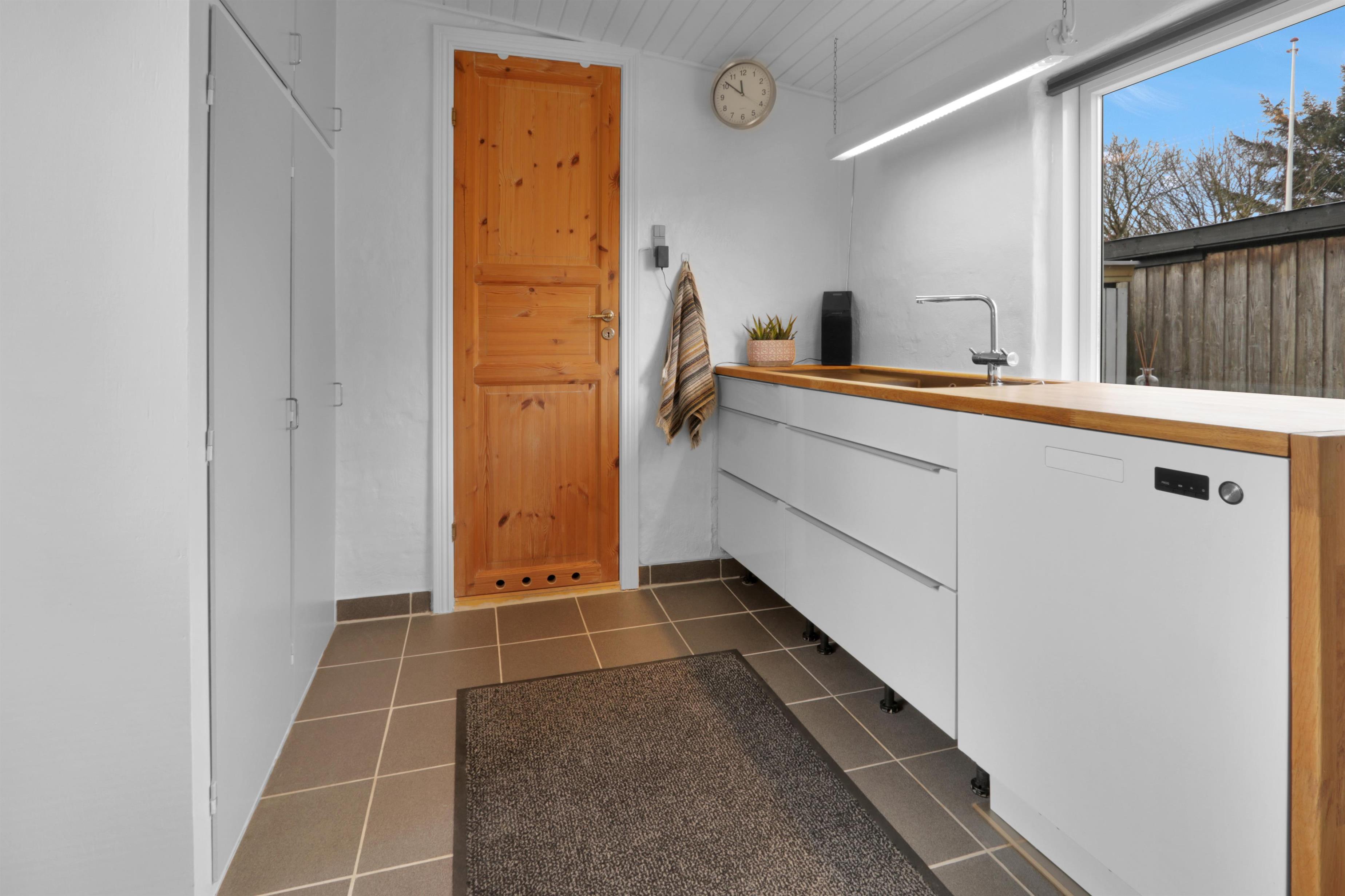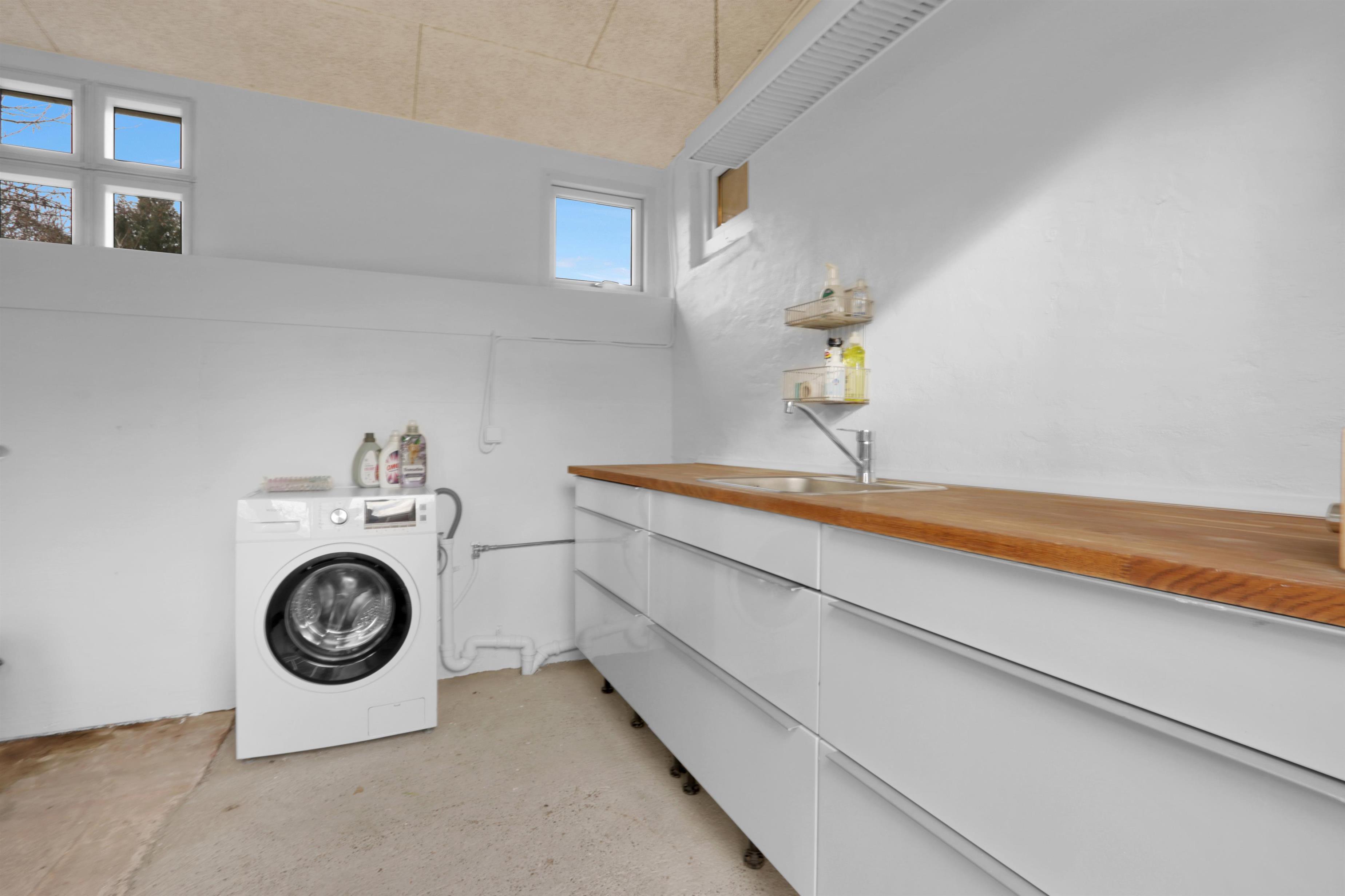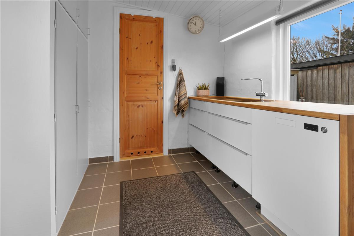 Der gut durchdachte Hauswirtschaftsraum bietet zusätzliche Arbeitsfläche, ein Waschbecken und eine praktische Waschmaschine.