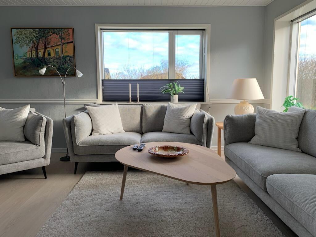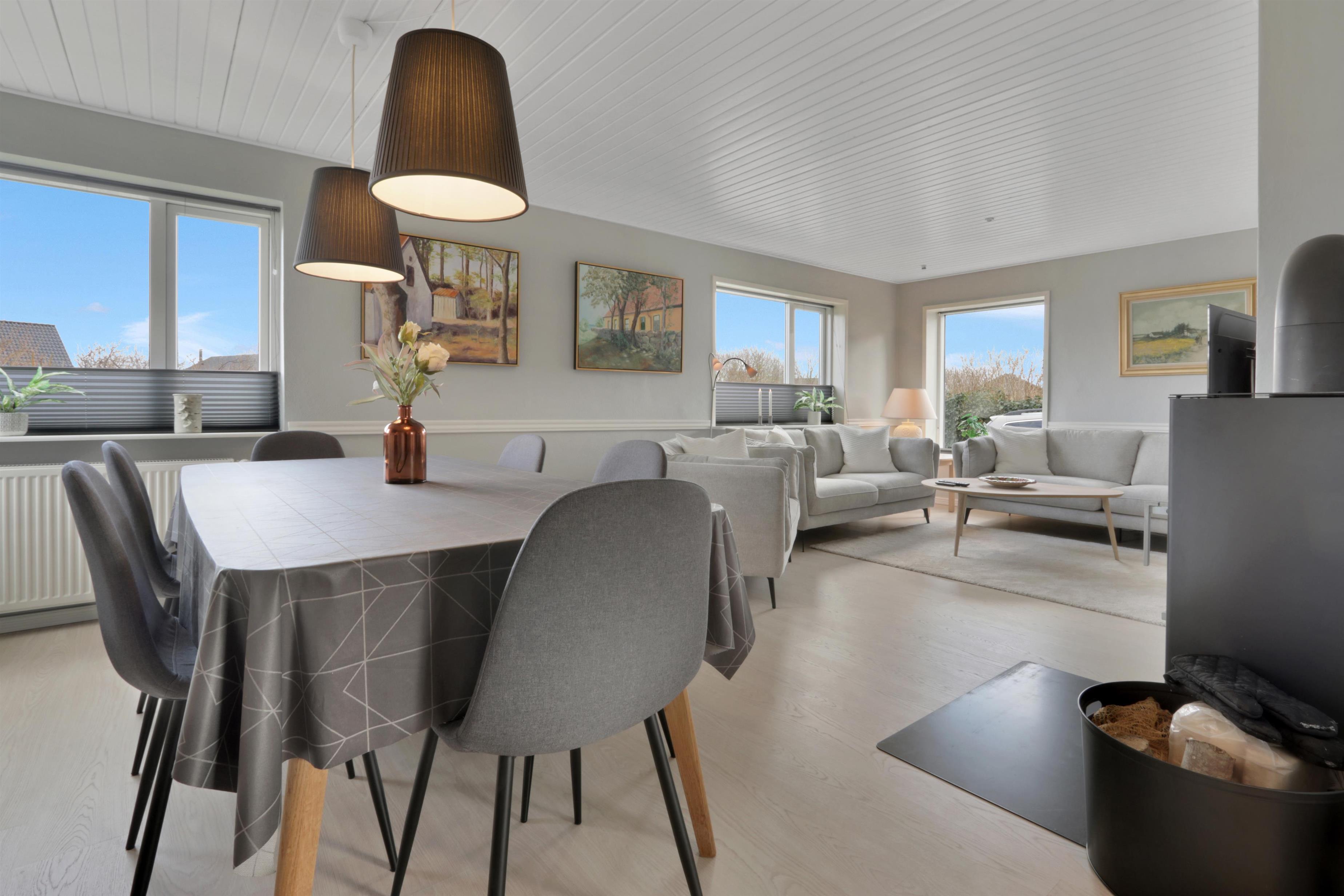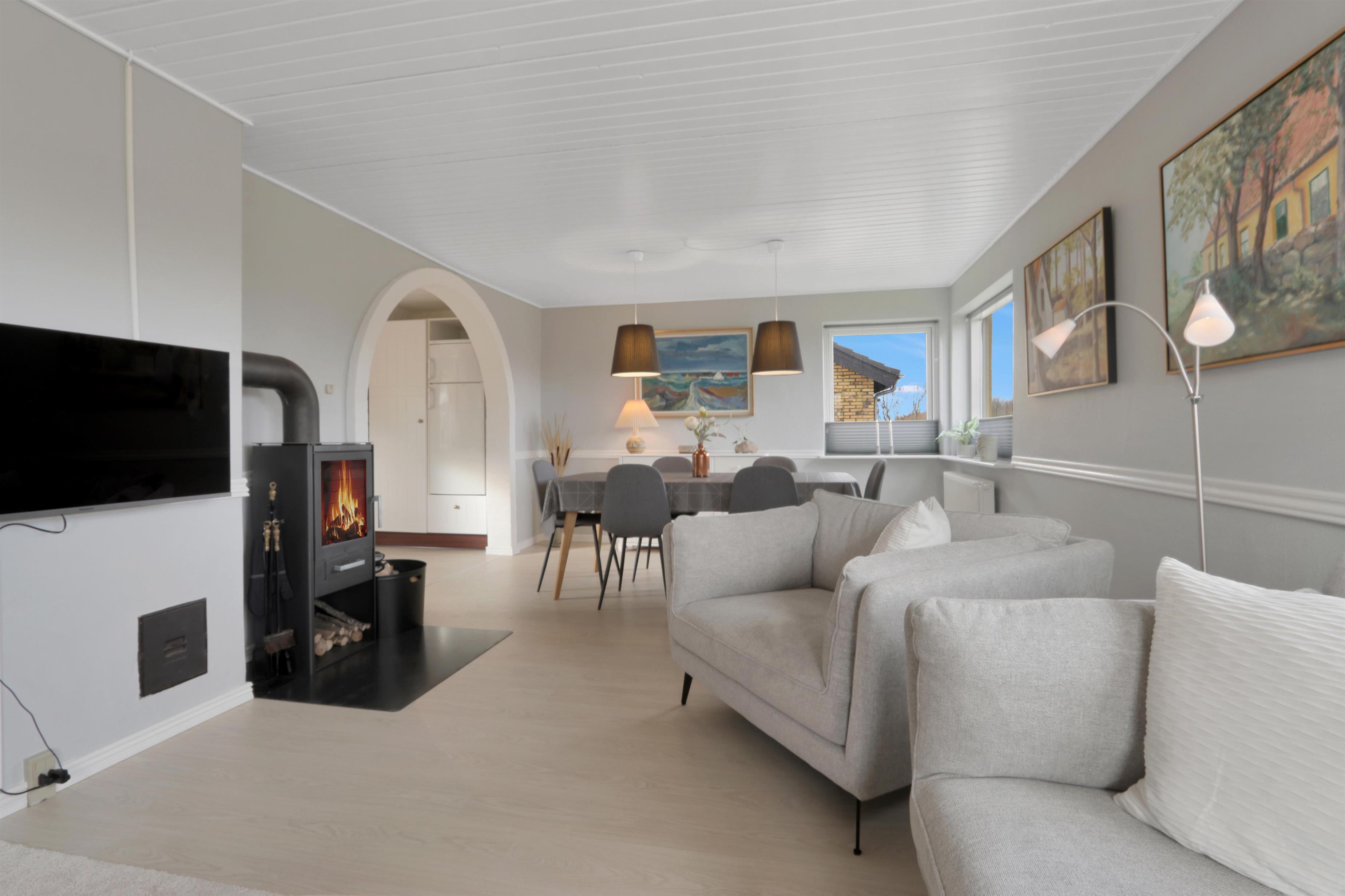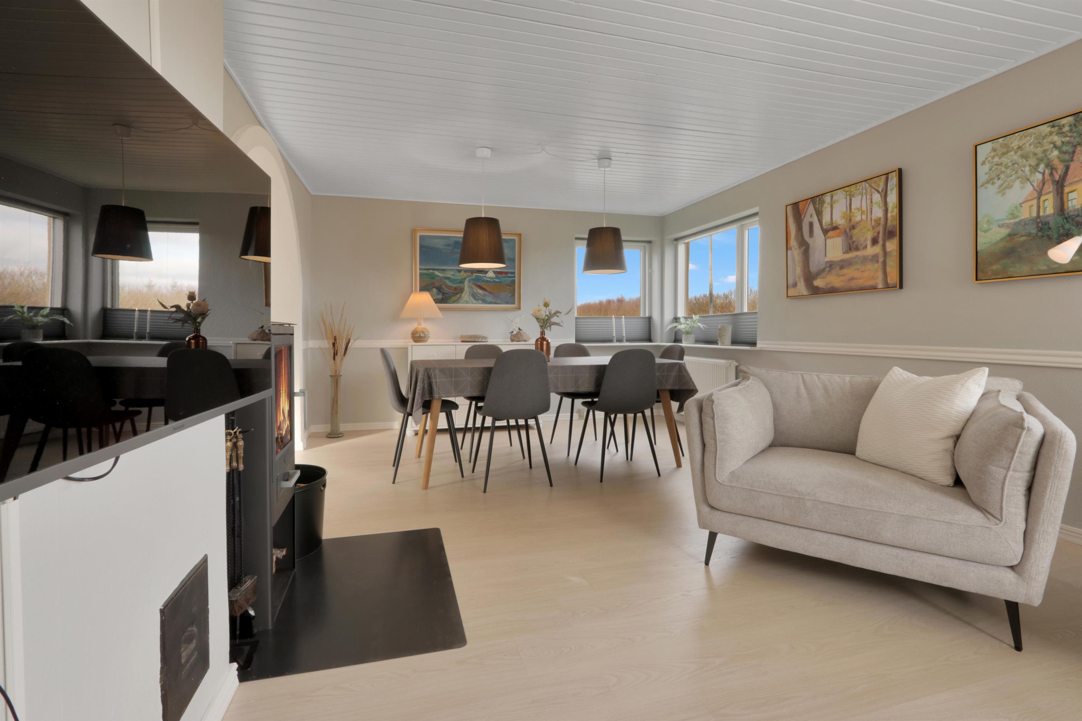 Dieses wunderschöne Ferienhaus wurde im Laufe von 2023 renoviert und ist schön hell und einladend. Das Wohnzimmer bildet das Herzstück des Hauses und bietet viel Platz für gemeinsame Stunden und Gemütlichkeit. Hier findest du einen stilvollen Essbereich, eine komfortable Sofaecke und einen stimmungsvollen Kaminofen, der die Abende besonders gemütlich macht. Der Fernseher verfügt über dänische und deutsche Kanäle, und mit Chromecast kannst du deine eigenen Streamingdienste nutzen.