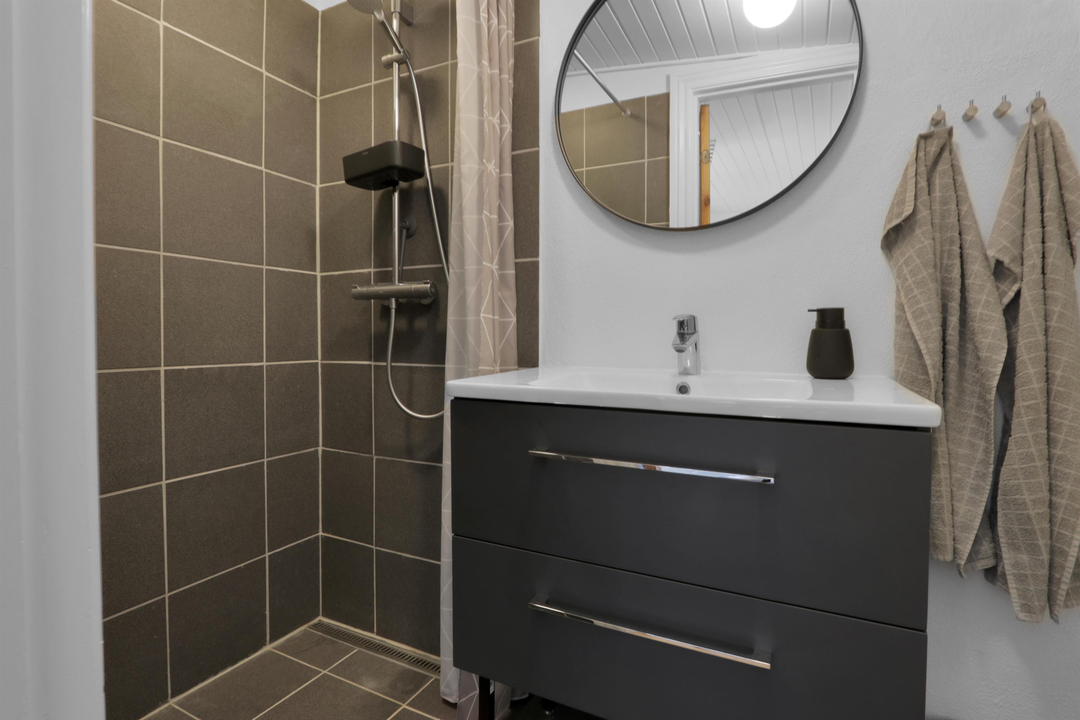 Das Badezimmer wurde modern renoviert und verfügt über Fußbodenheizung, eine Toilette, eine Dusche und ein Waschbecken.