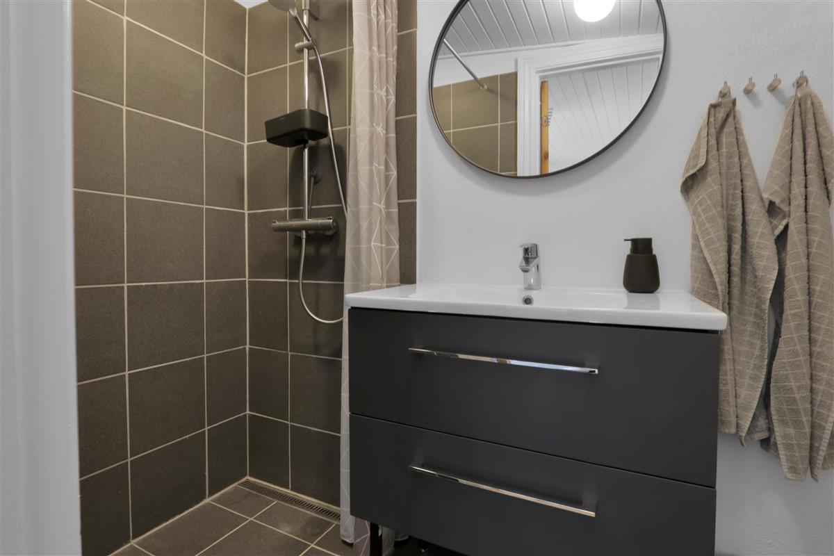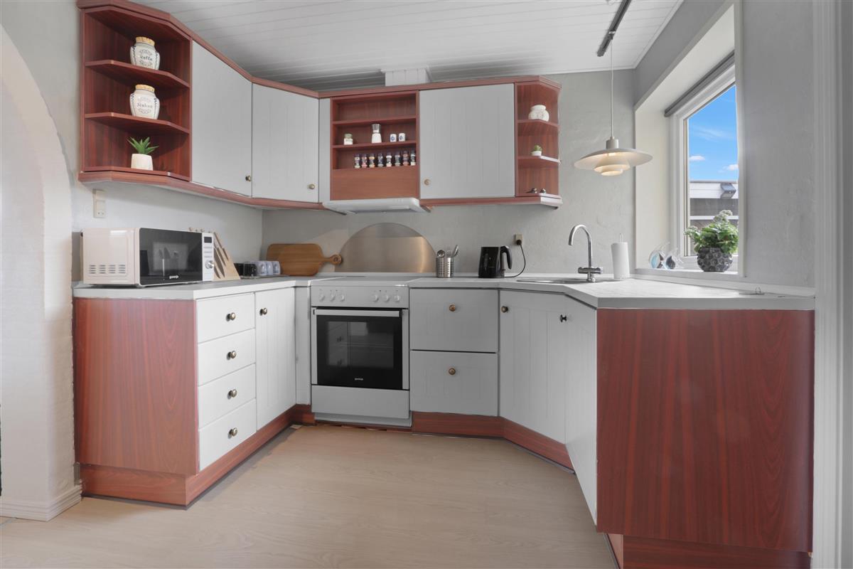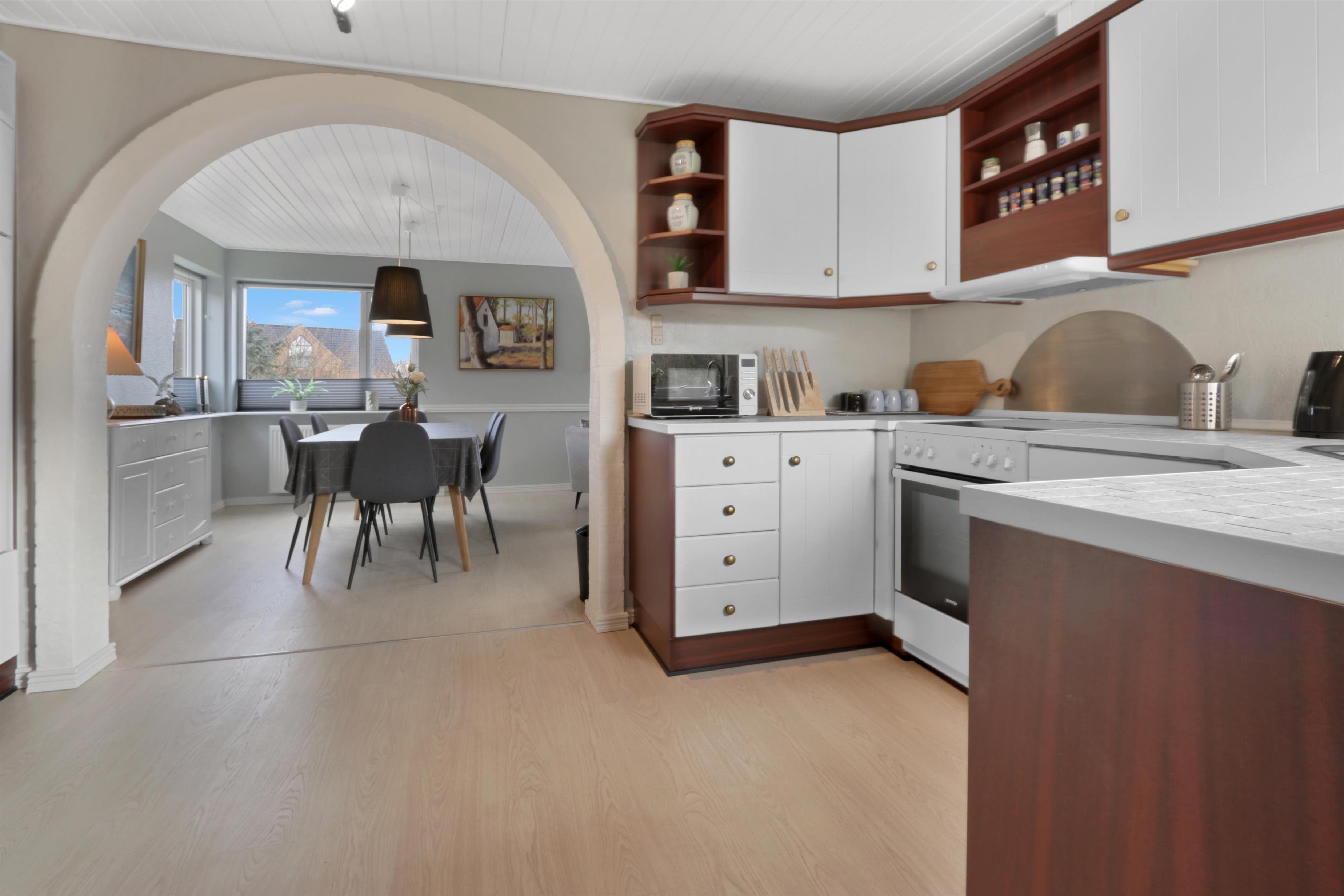 Die Küche liegt direkt neben dem Essbereich und ist sowohl schön als auch funktional ausgestattet. Sie bietet alles, was du brauchst: eine Spülmaschine, ein Glaskeramik-Kochfeld, eine Abzugshaube sowie einen Kühl-/Gefrierschrank.