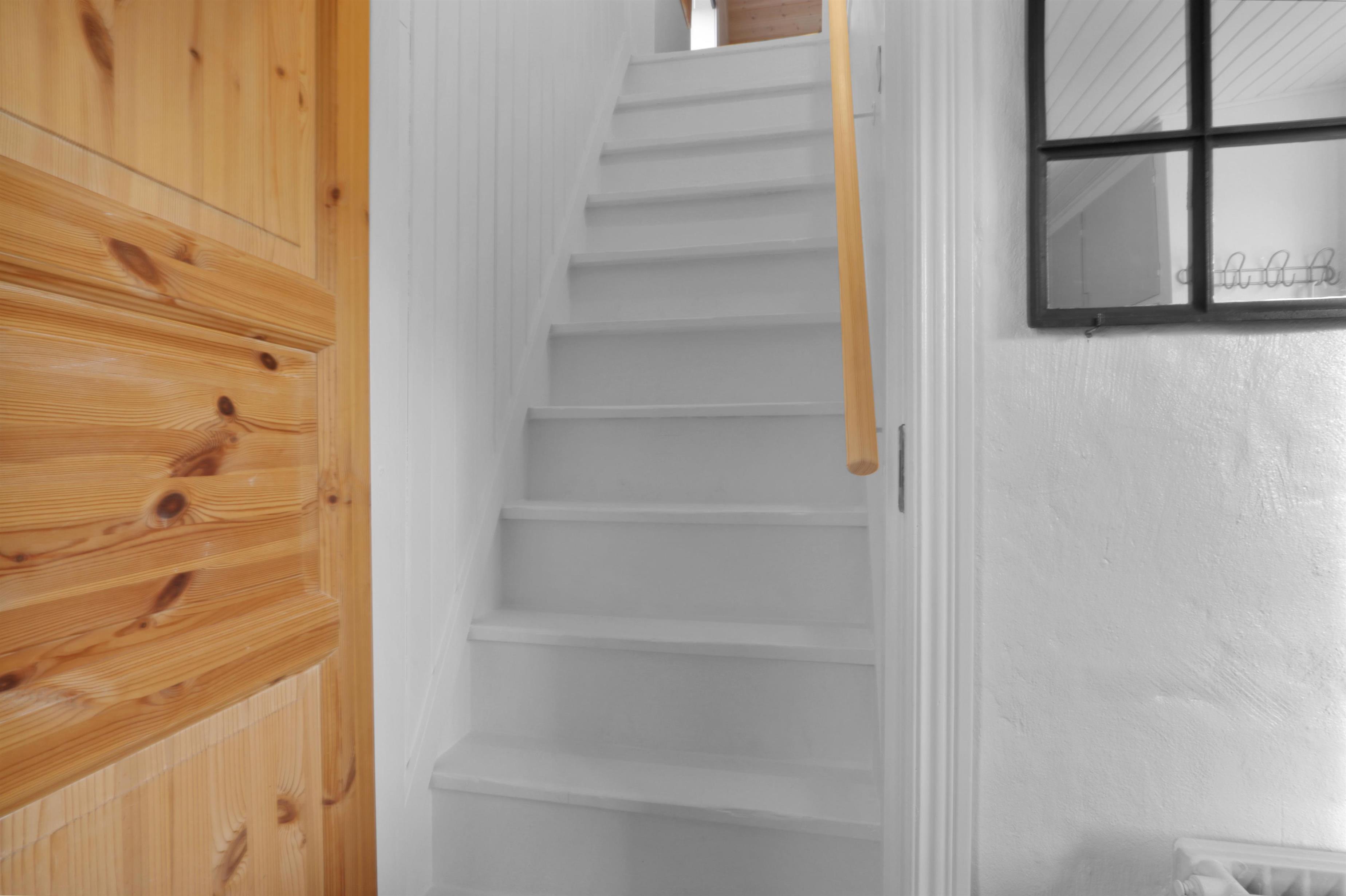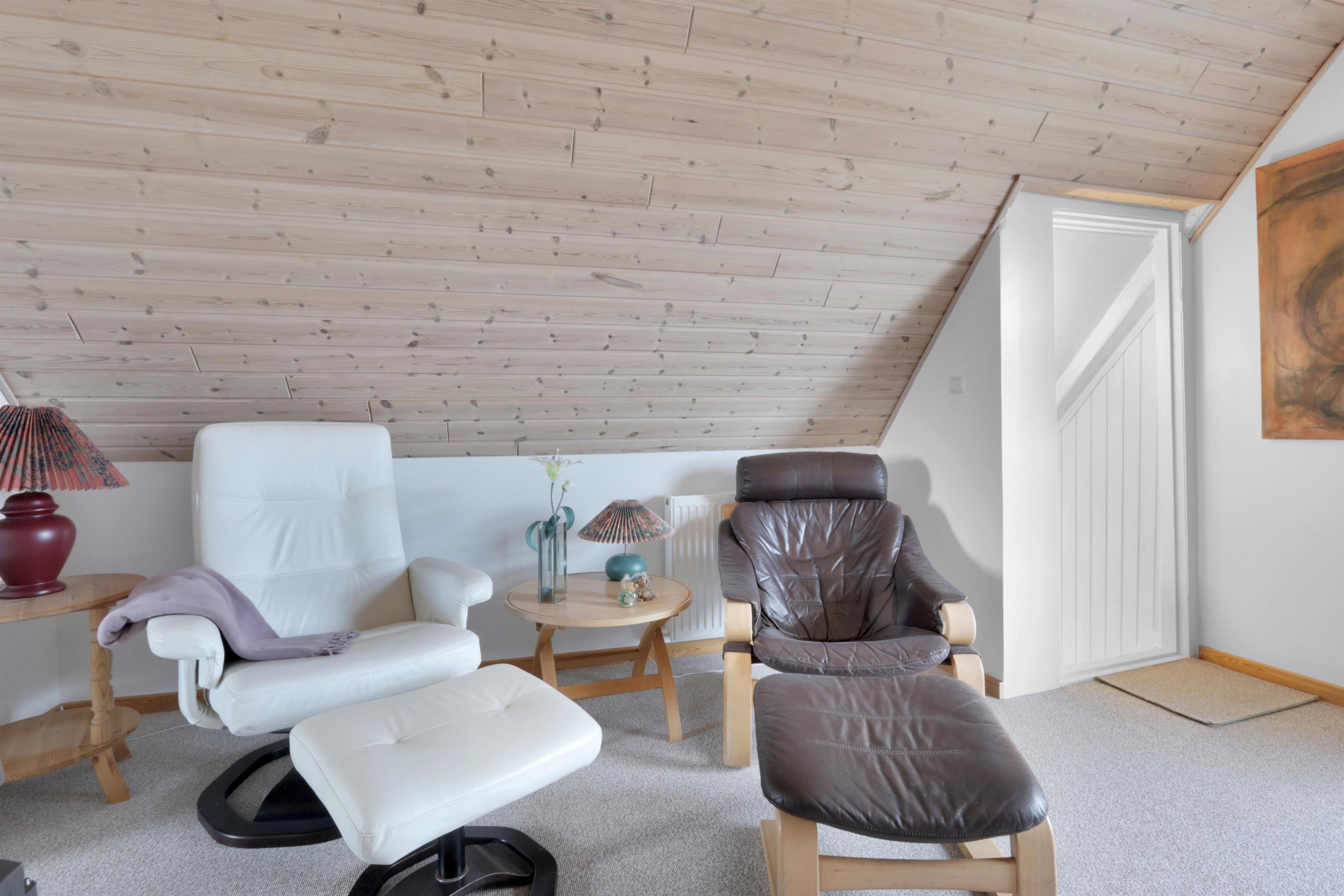 Vom Flur aus führt eine charmante, aber steile Treppe in das Obergeschoss, wo ein gemütliches extra Wohnzimmer auf dich wartet. Hier kannst du dich in gepolsterten Möbeln und Fernseher entspannen. Auf derselben Etage befindet sich auch ein schönes Schlafzimmer mit einem Doppelbett. Ein weiteres Schlafzimmer mit Doppelbett liegt im Erdgeschoss.