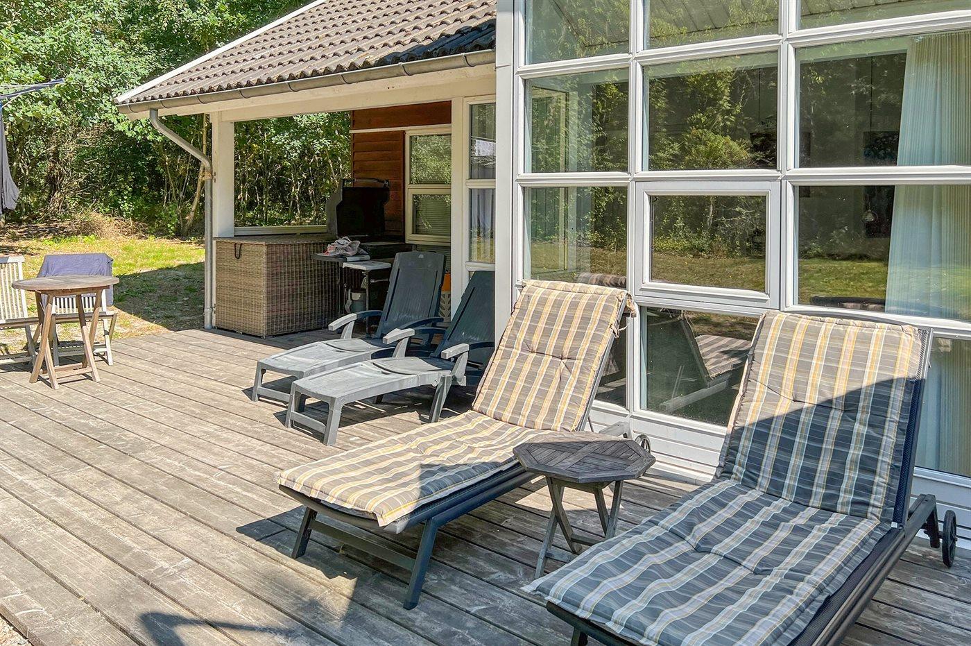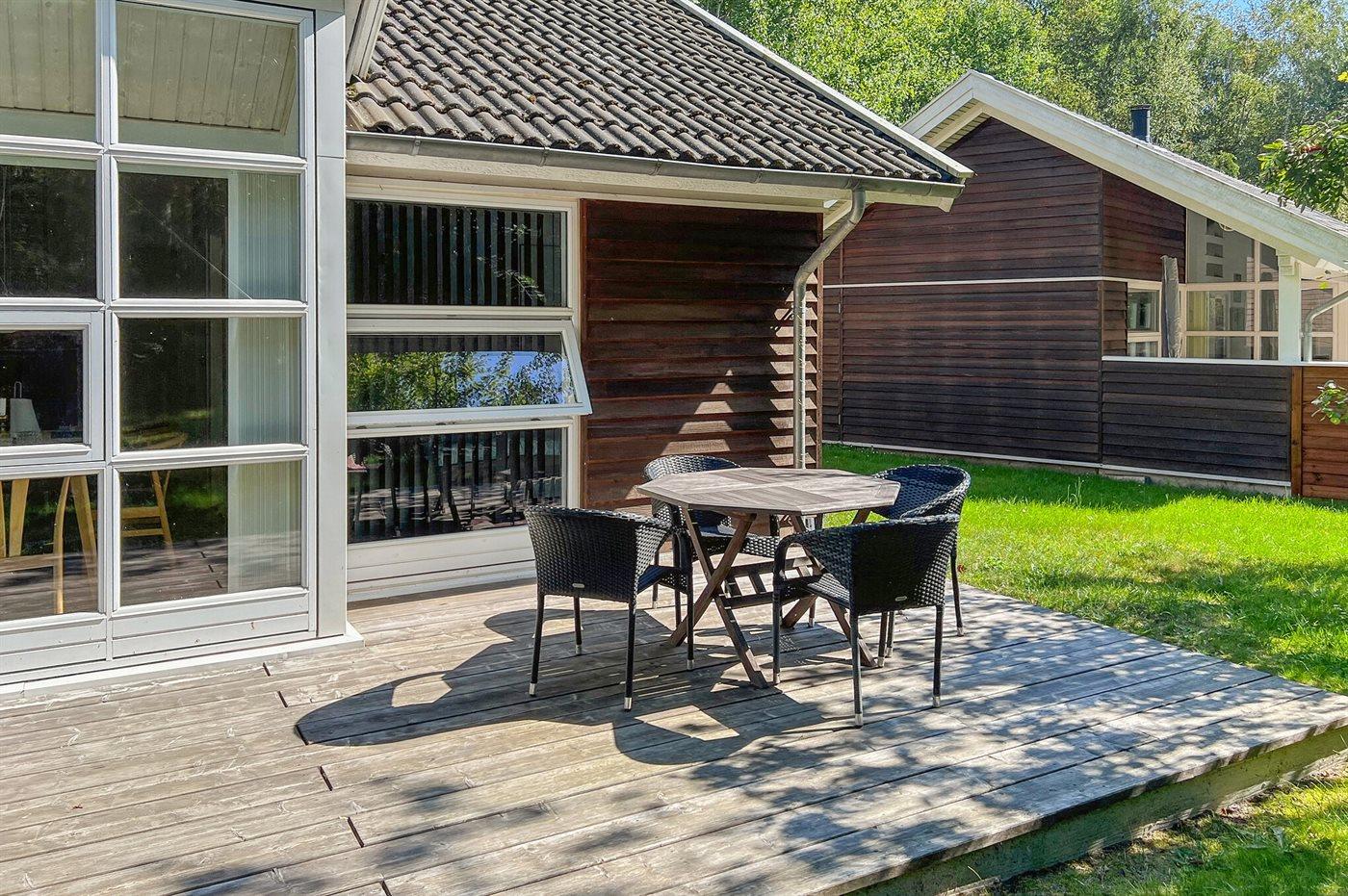 De vakantiewoning is gelegen op een 500 m² groot grond in bos/park. Afstand tot de zee 1200 m. Dichtstbijzijnde winkel 3000 m. Er is een golfbaan op een afstand van 8000 m. Bij de vakantiewoning hoort 30 m² terras. Daarnaast is er een 10 m² groot overdekt terras. Gereedschapsruimte. Parkeerplaats bij het huis.