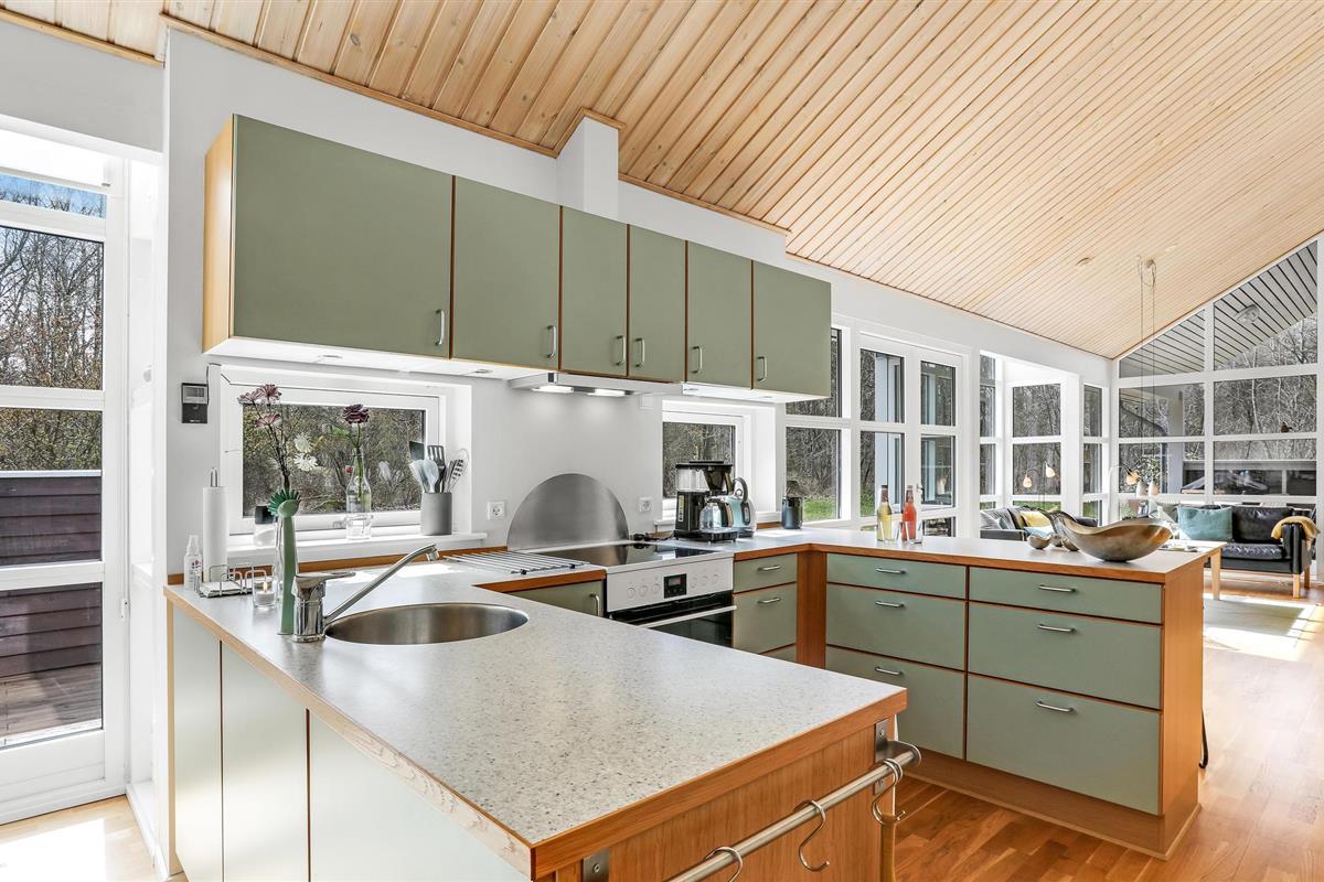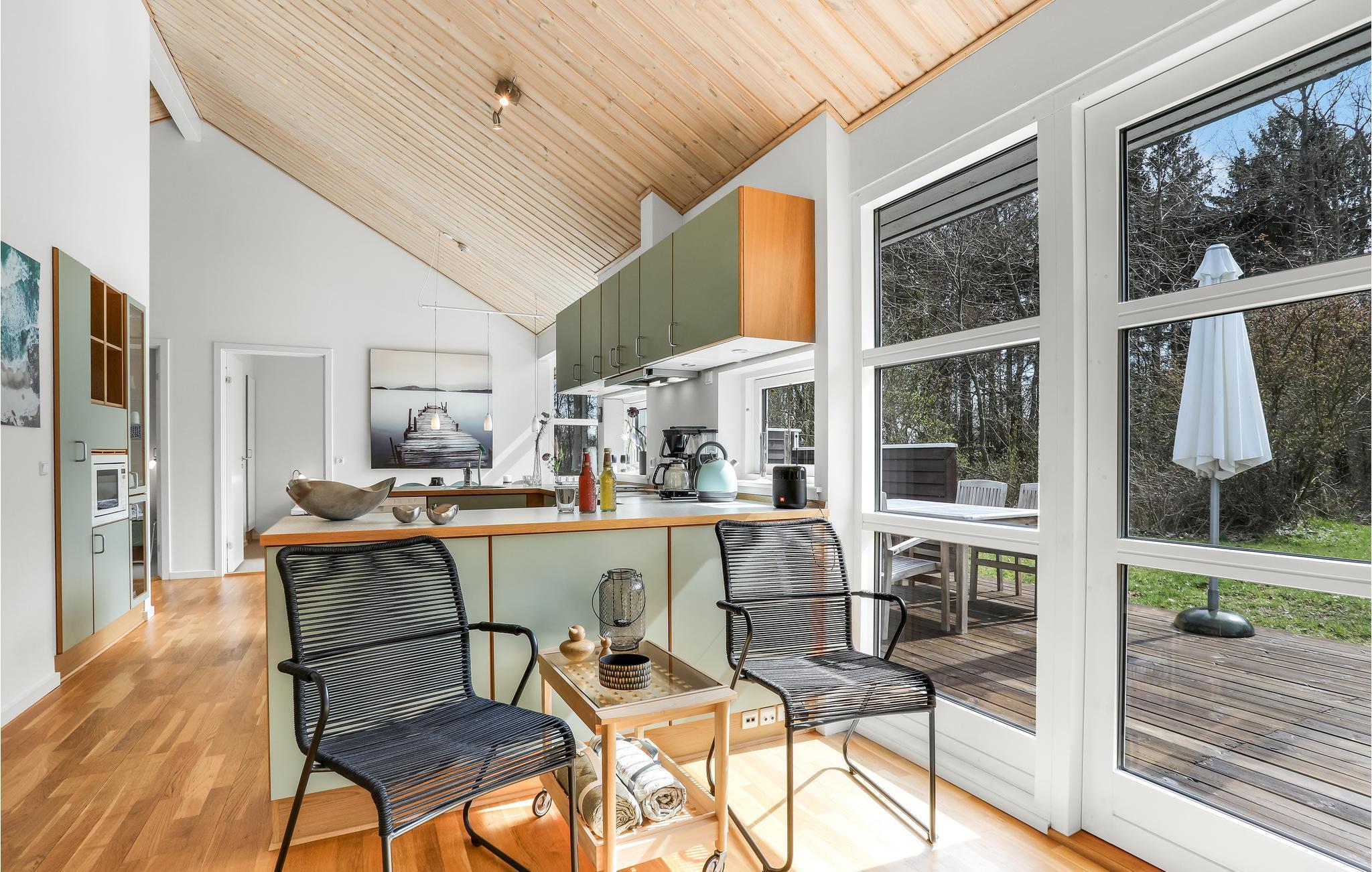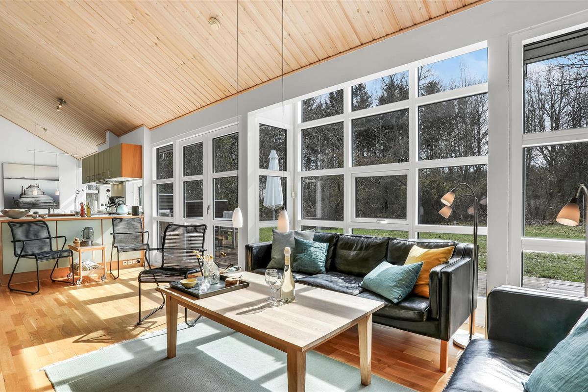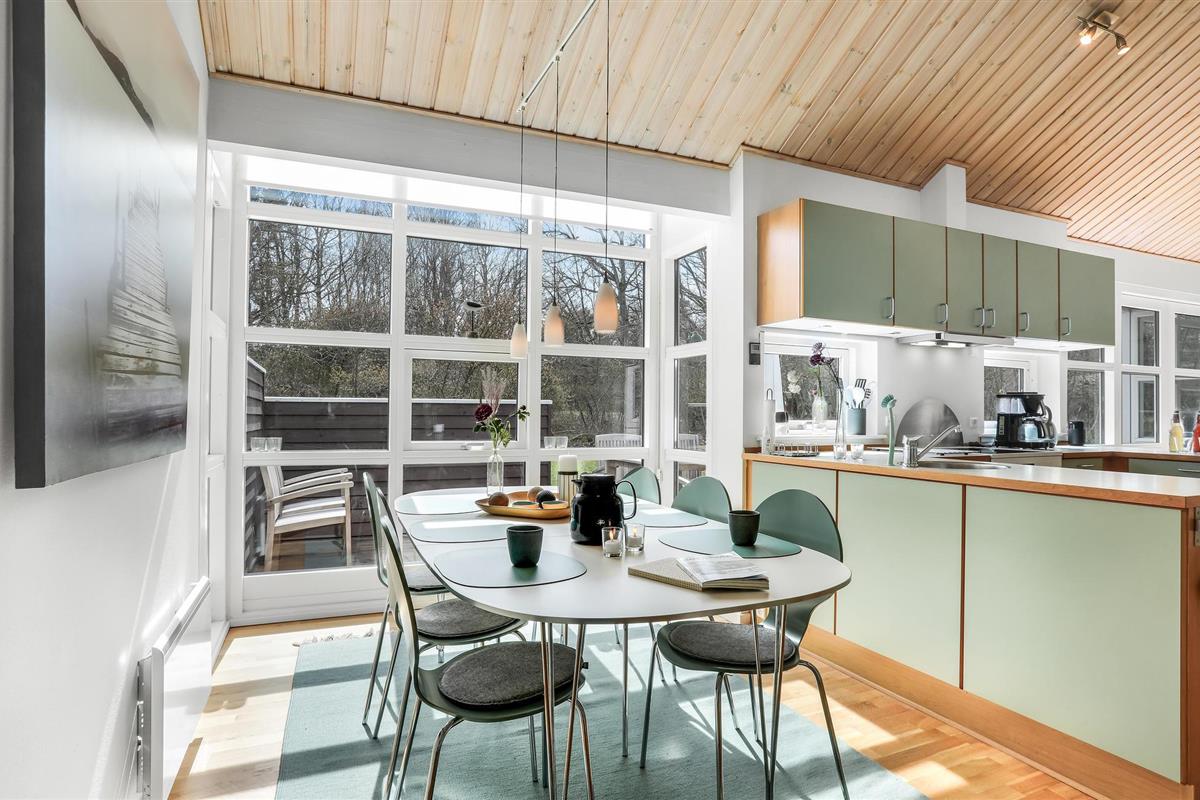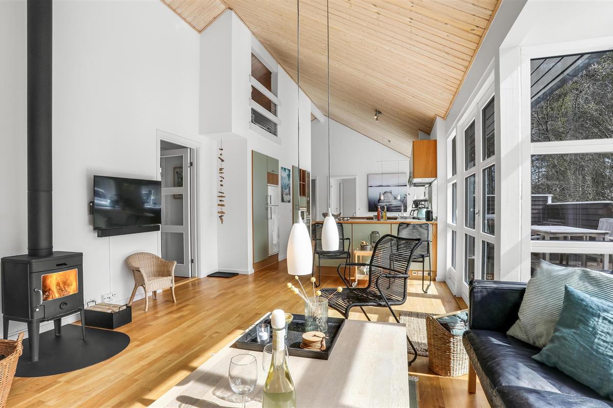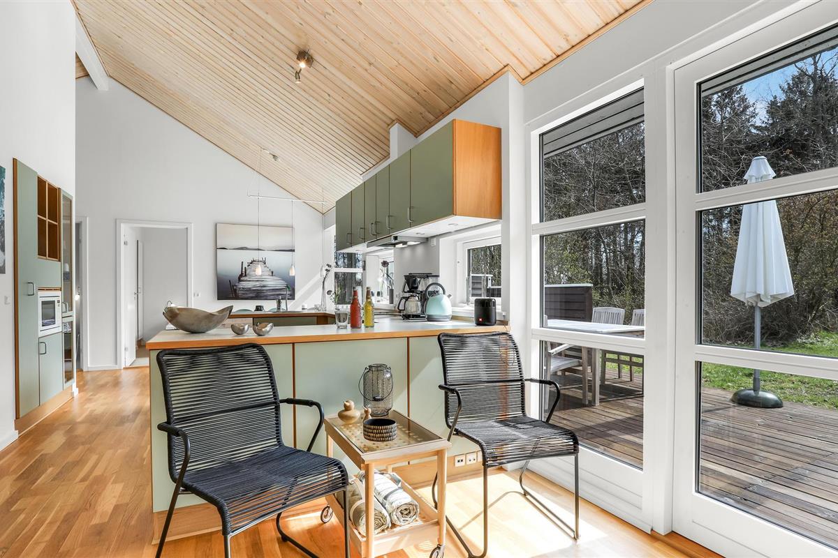 Het huis verwelkomt u met een mooie, lichte en ruime woonkamer met een aangenaam uitzicht op het bos, en met toegang tot het terras. Dit is gedeeltelijk overdekt en verleidt u met gezellige zitjes om samen te komen, te spelen of te eten - De eethoek naast de zeer goed uitgeruste en open keuken biedt de kok de mogelijkheid om in het beste gezelschap vakantiemaaltijden te bereiden.