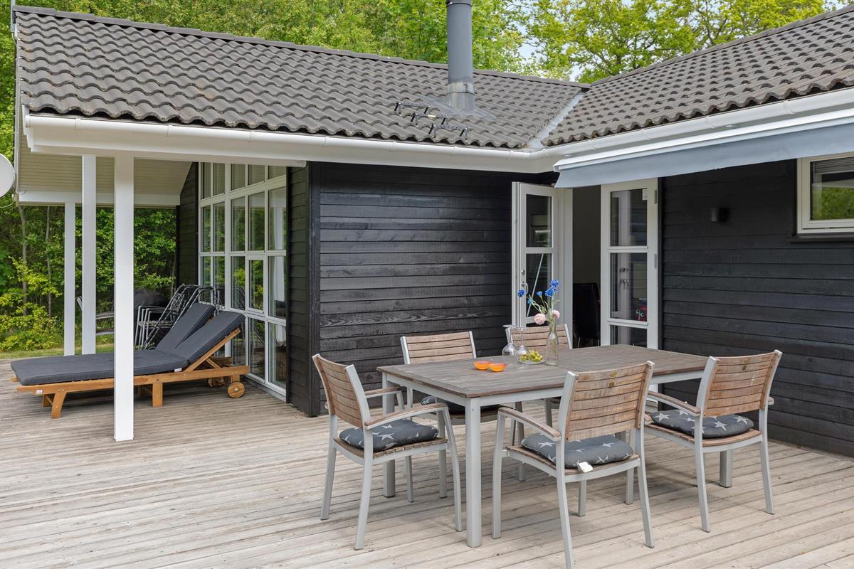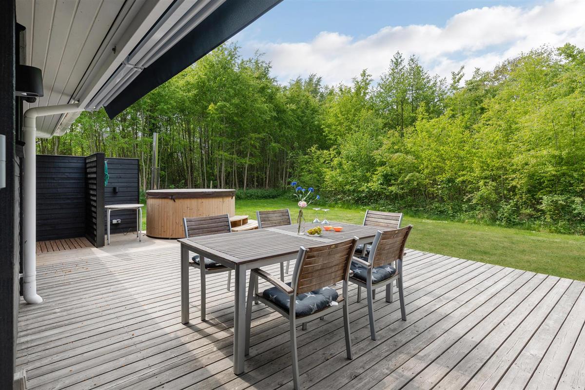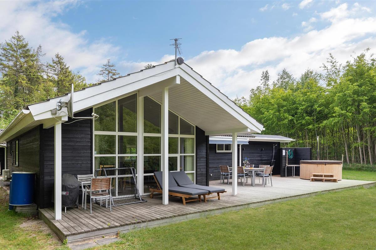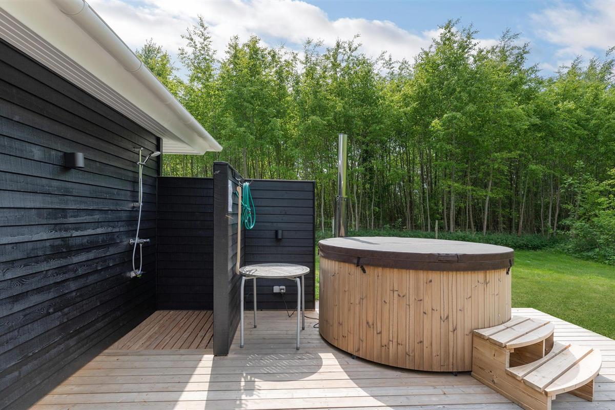 Luxe houten vakantiehuis bij Hasle Lystskov met open keuken, terras en hot tub, perfect voor een ontspannen familievakantie.