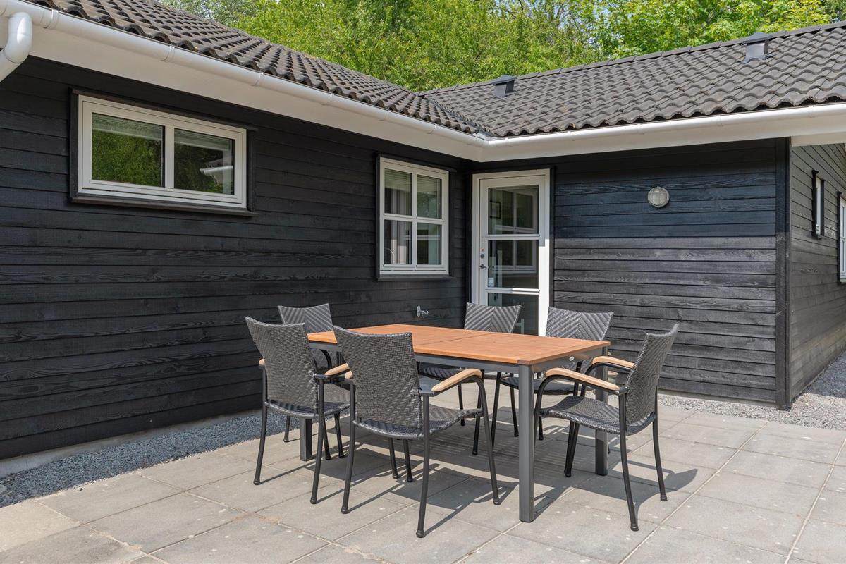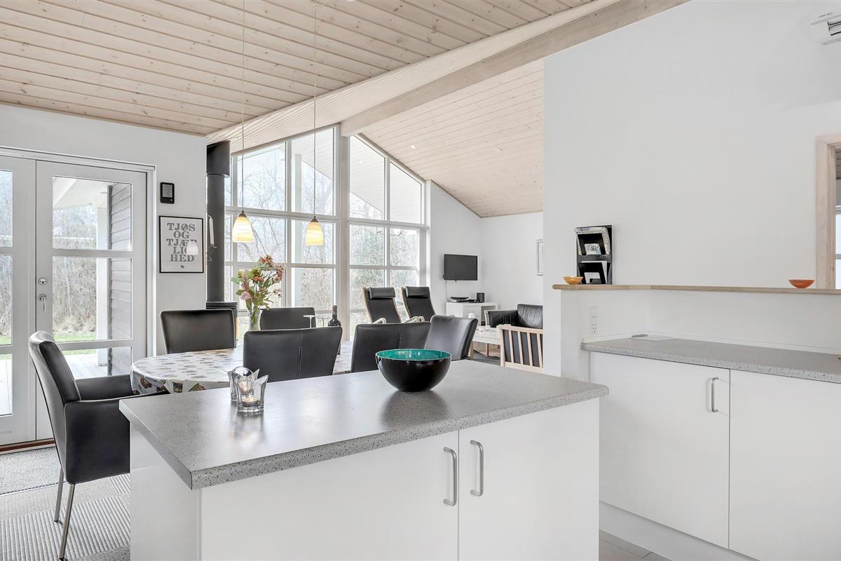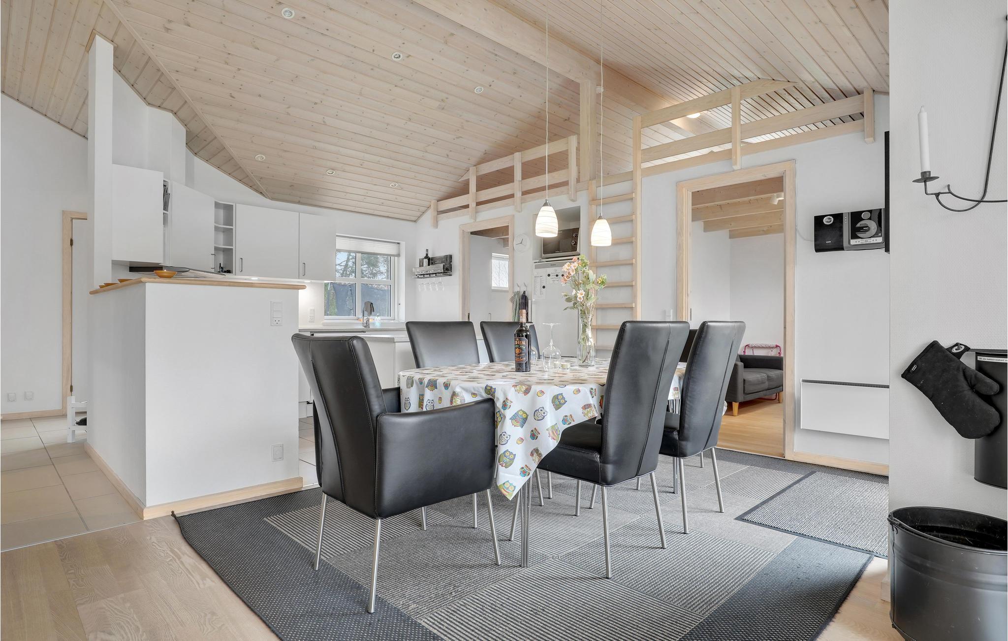 Luxe houten vakantiehuis bij Hasle Lystskov met open keuken, terras en hot tub, perfect voor een ontspannen familievakantie.