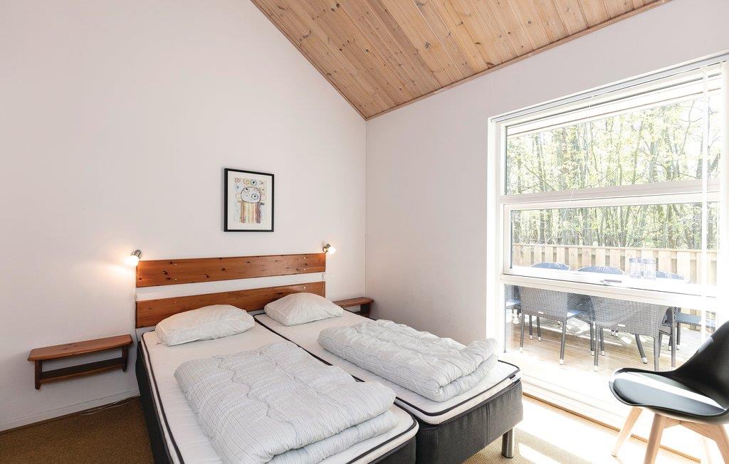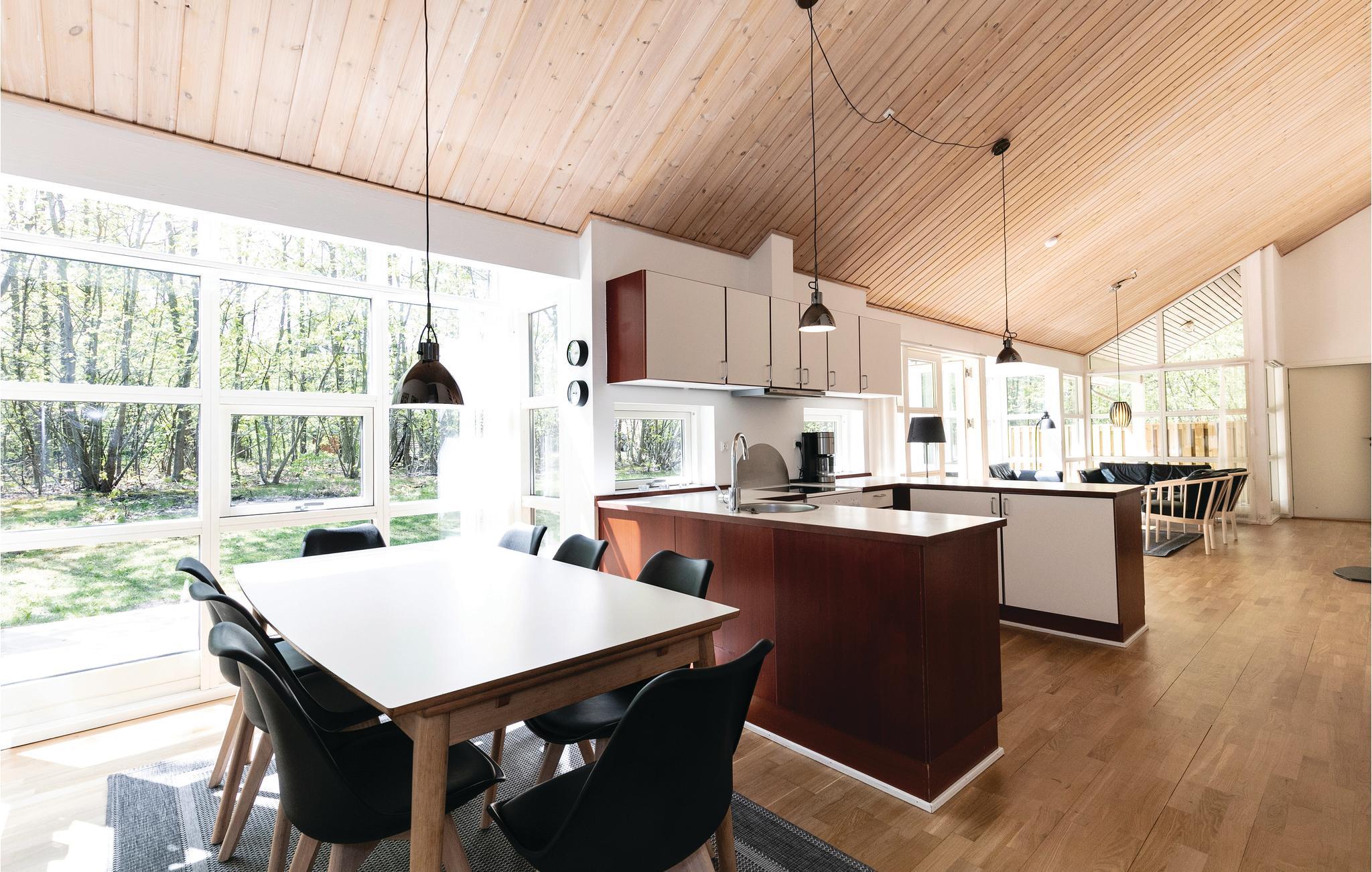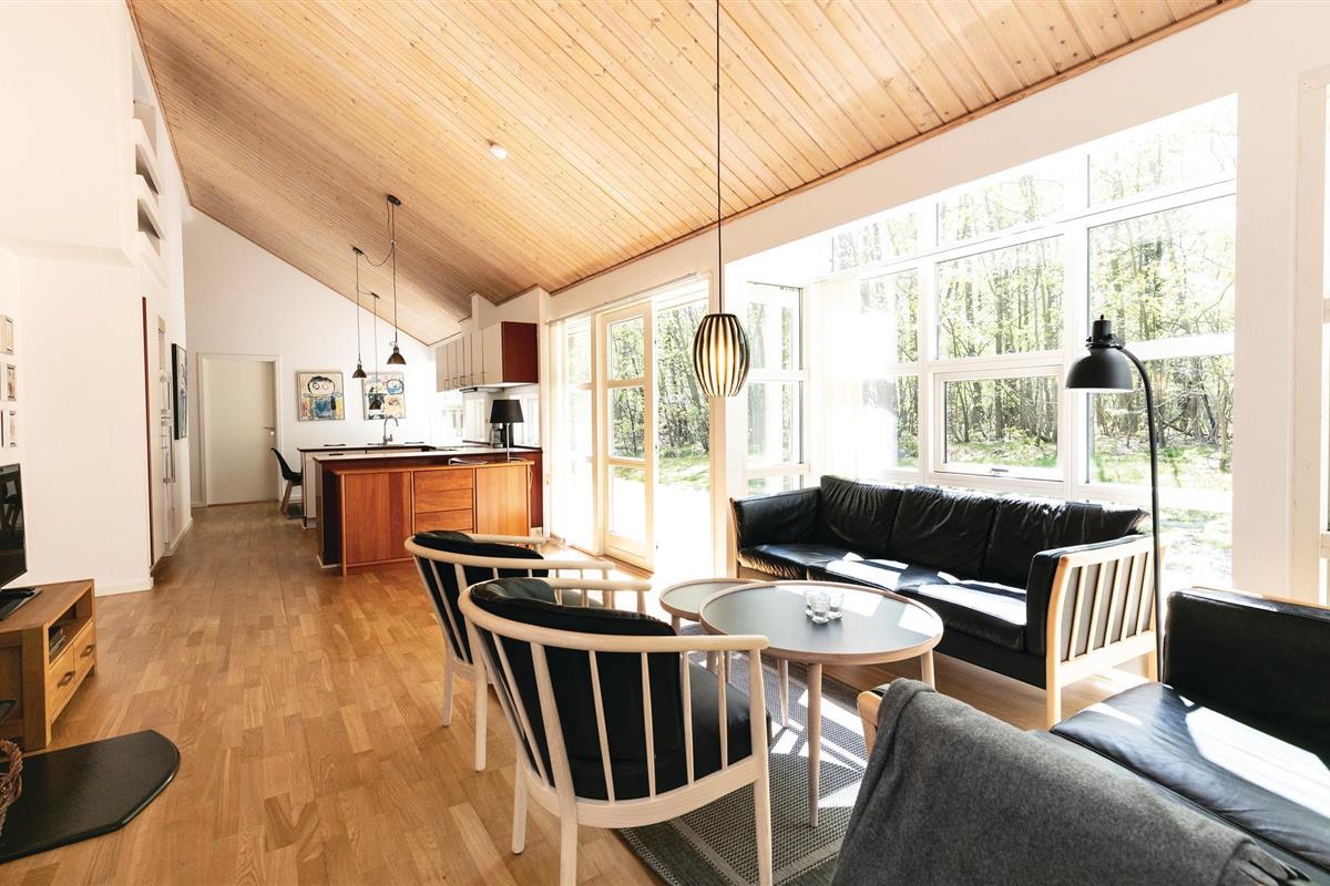 Bosidylle vlak bij het strand Het bospark 'Rubinsøen' ligt in het noordwesten van Bornholm, ten zuiden van Hasle en slechts 10 km ten noorden van de eilandhoofdstad Rønne. Een prachtig natuurgebied bestaande uit een rustgevend bosgebied en vlakbij een heerlijk breed en kindvriendelijk zandstrand. Niet ver van het bospark ligt 'Rubinsø' (Robijnmeer). De oorsprong van dit meer gaat terug tot de tijd dat hier steenkool werd gewonnen. Diep onder de grond werd een waterader gevonden, waardoor het meer in zeer korte tijd ontstond. Tegenwoordig kunt u hier vissen op snoek en andere vissen. Visvergunningen zijn ter plaatse tegen betaling verkrijgbaar. In dit vakantieparadijs, midden in het schaarse bos en niet ver van Rubinsø, werden in 1999 deze eersteklas, volledig nieuw ontworpen en in hun architectuur unieke vakantiehuisjes van hoge kwaliteit gebouwd. De individuele huisjes, losjes gerangschikt in groepen van twee, zijn qua inrichting en uitrusting harmonieus op elkaar afgestemd en zijn uiterst comfortabel. Ook de whirlpool is ontworpen met het oog op comfort. Hij is uitgerust voor 2 personen en belooft een hemelse onderwatermassage na een saunagang. Bornholm - het schatten- en fietseiland Bornholm is een Dorado voor actieve vakantiegangers, vooral voor gasten die het eiland per fiets willen ontdekken. Het spoorwegnet van het eiland, dat vele jaren geleden werd gesloten, is ontwikkeld tot een fantastisch netwerk van fietspaden en is de laatste jaren voortdurend uitgebreid. En er is zoveel te ontdekken. Naast de unieke ronde kerken, voormalige vestingkerken uit de 11e eeuw, kom je altijd de opvallende schoorstenen tegen van de witgekalkte haringrokerijen die oprijzen tot in de blauwe lucht. De geur van vers gerookte haring ('Bornholmer') doet je watertanden. Proef deze lekkernij. Natuurbelevenis eiland Bornholm Bornholm, met zijn milde klimaat dat het hele jaar door duurt, biedt zoveel unieke dingen om te doen en te zien die nergens anders in Scandinavië te vinden zijn: Van superstranden met het fijnste zand bij Dueodde in het zuiden tot de schilderachtige klifkust met indrukwekkende kustformaties in het noorden. En boven alles uittorenend op de noordelijke punt zijn de imposante ruïnes van kasteel Hammershus, de oudste in zijn soort in Scandinavië. Kleine afstanden tot vele belevenissen: - Rønne ca. 10 km - Sandvig ca. 15 km - Gudhjem ca. 20 km - Nyker ca. 8 km - Hasle ca. 1 km Kwaliteit eengezinswoningen met veel comfort op een prachtige boslocatie, alle slaapkamers met 2-pers. of 1-pers. bedden (elk 2 pers.), 2-pers. whirlpool, goede kamerindeling, groot zonneterras. Deur 80 cm breed! Bospark Rubinsøen ligt ten zuiden van Hasle en op slechts 500-1.000 m van een kindvriendelijk zandstrand. Deze kwaliteits huisjes zijn gebouwd in 1999-2004 met een grootte van 117m2 hout op 1250 m2 bos/natuur percelen elk. De 42 m2 grote woonkamer, met lichtovergoten
