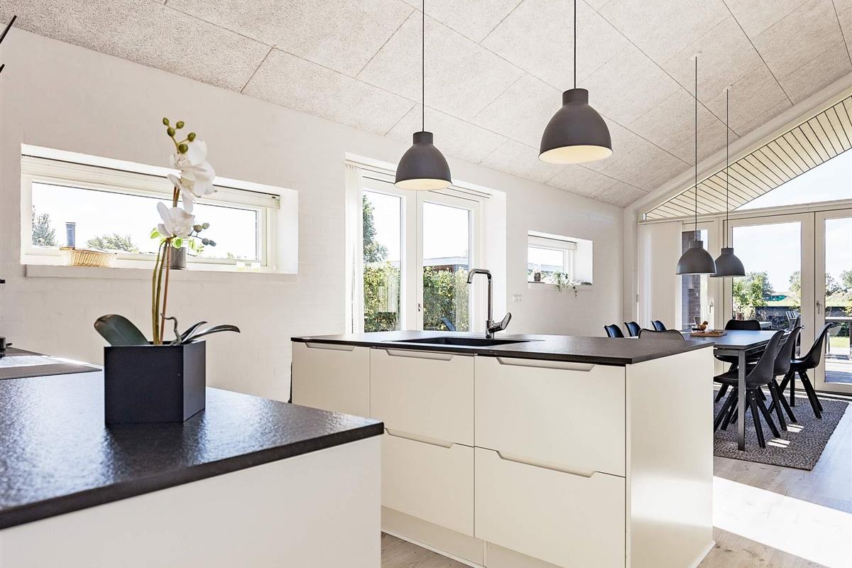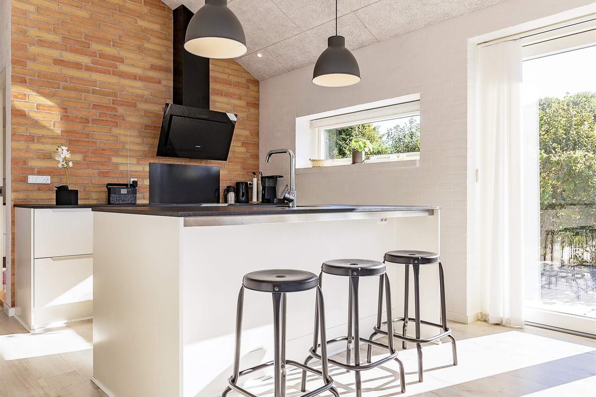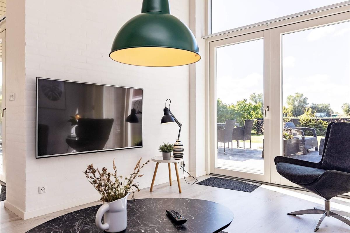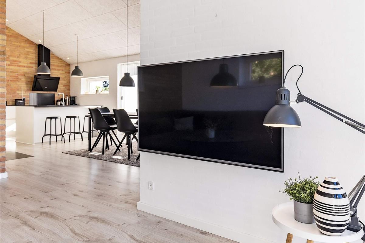 Ein großer Küchen-/Wohnbereich mit Essecke bildet den Mittelpunkt des Hauses, ideal für Familien. Durch die großen Panorama-Fenster im Wohnbereich hat man freien Ausblick ins Grüne ringsum, zudem trägt hier die offene Zimmerdecke zu einem luftigen Wohnambiente bei. Davor liegt die große Terrassenfläche, die das Haus quasi umschließt. WLAN im Haus. Zudem gibt es einen Holzofen und angenehme Fußbodenheizung, gespeist durch eine energieeffiziente Wärmepumpe, um die Nebenkosten zu reduzieren. Zwei der drei Schlafzimmer im Haus habenvdirekten Zugang nach draußen. TV im Kinderzimmer mit integriertem DVD-Spieler. Zudem helles Bad mit Fußbodenheizung und modernem Standard.