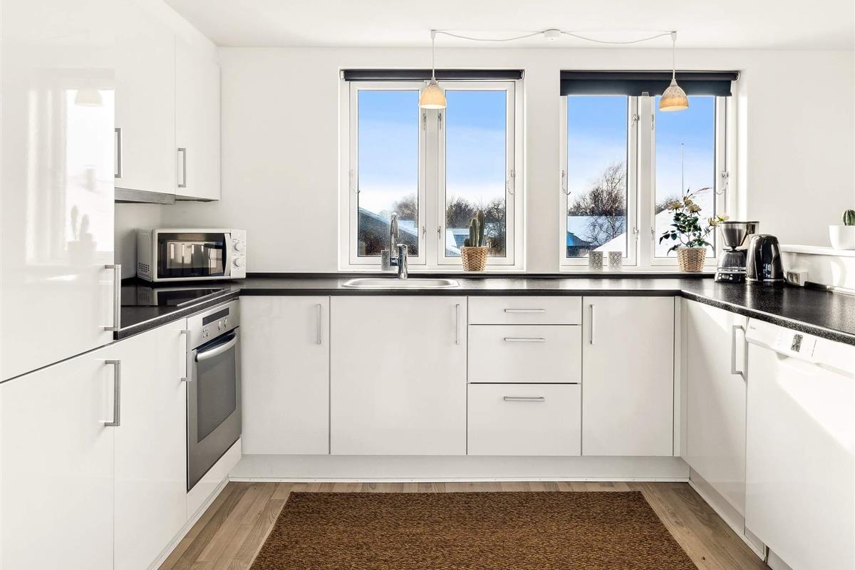 Køkken: El-komfur, køle-frys, mikroovn, kaffemaskine, opvaskemask.
