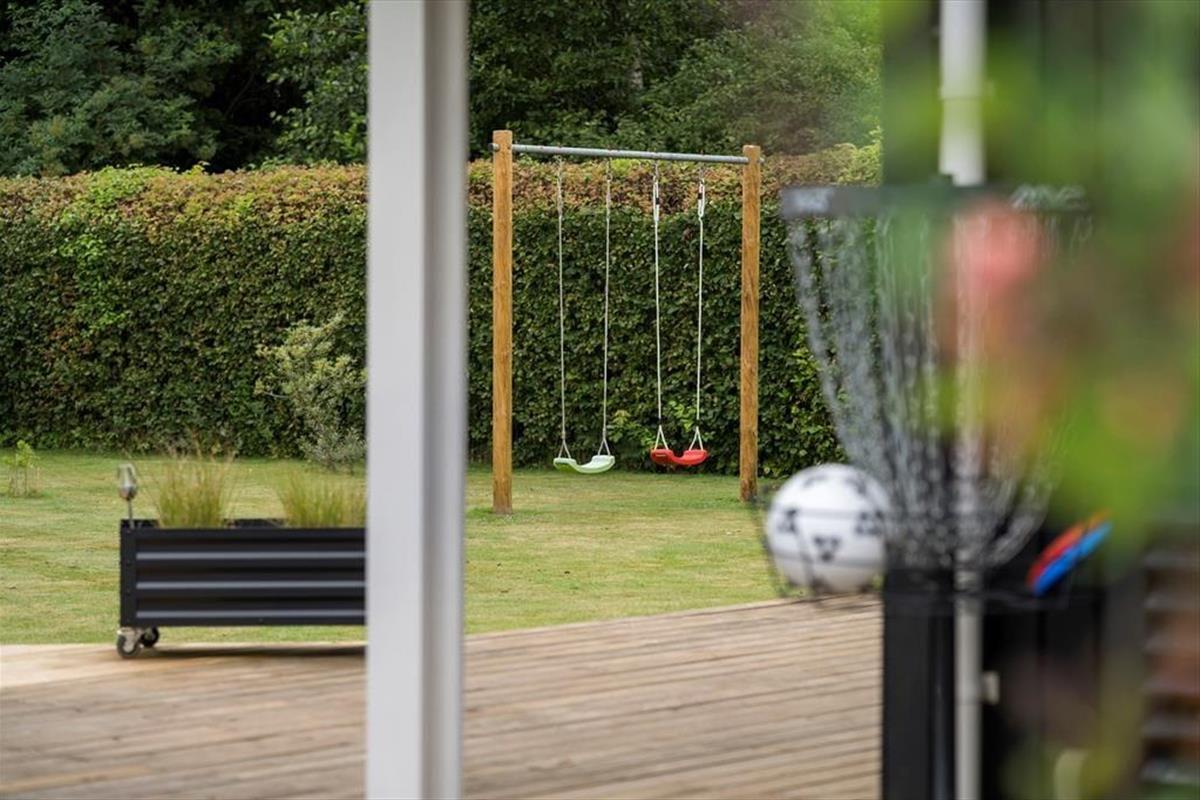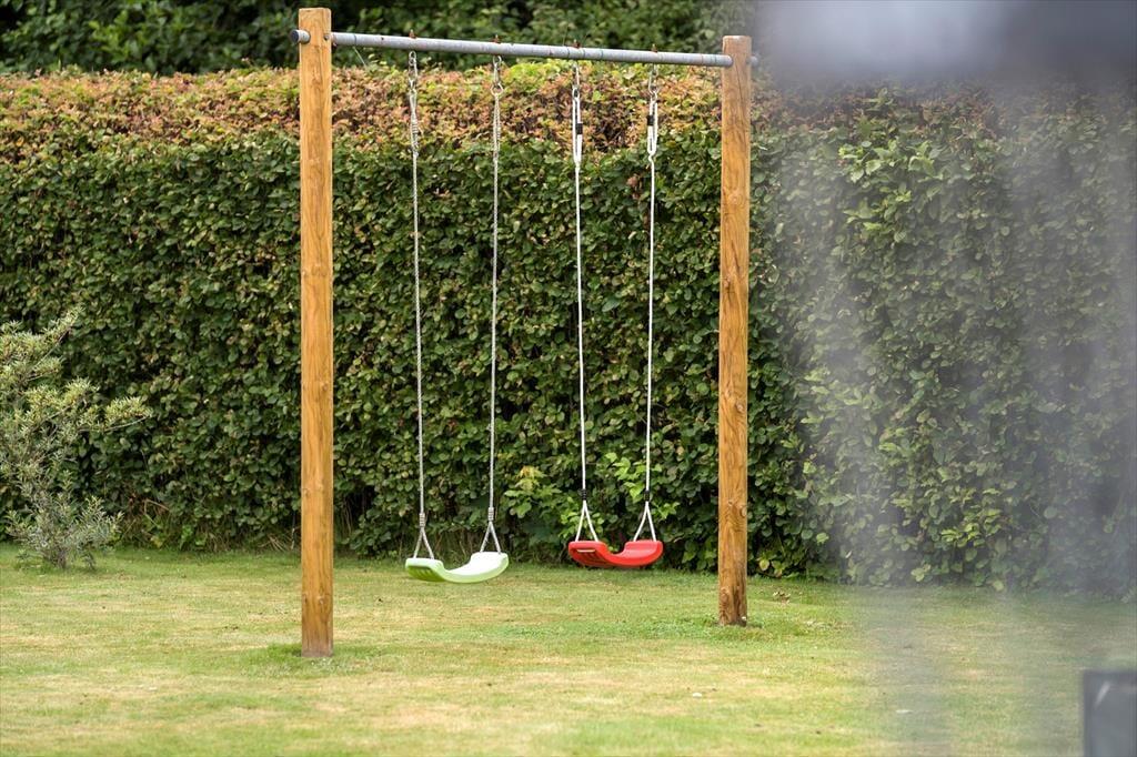Op het gazon staat een dubbele schommel voor de kinderen. Bij de carport staat een buitenkeuken en spoelbak met koud water.