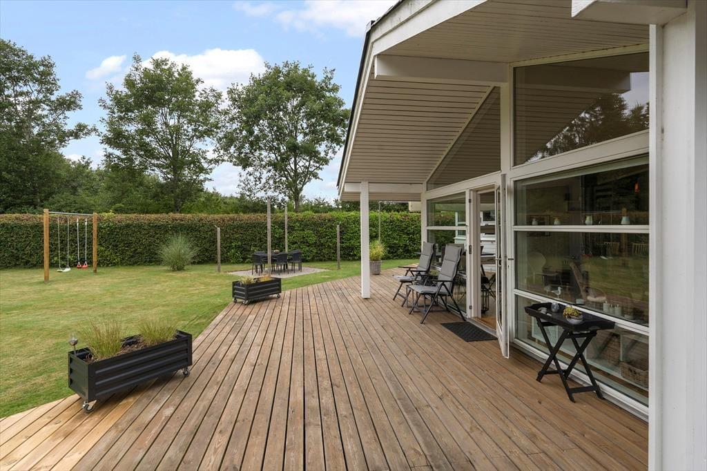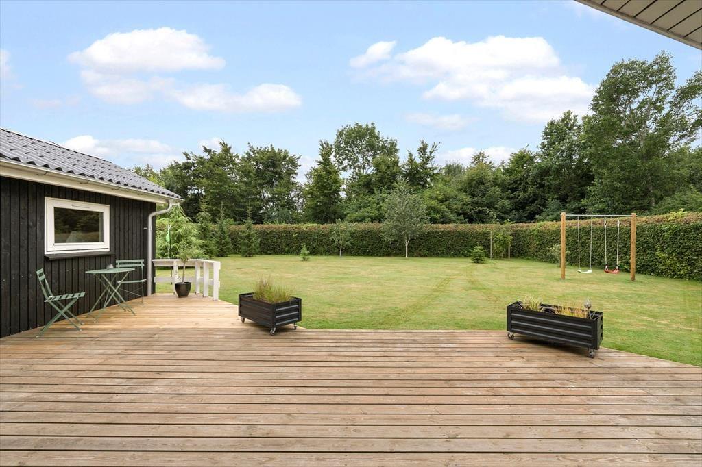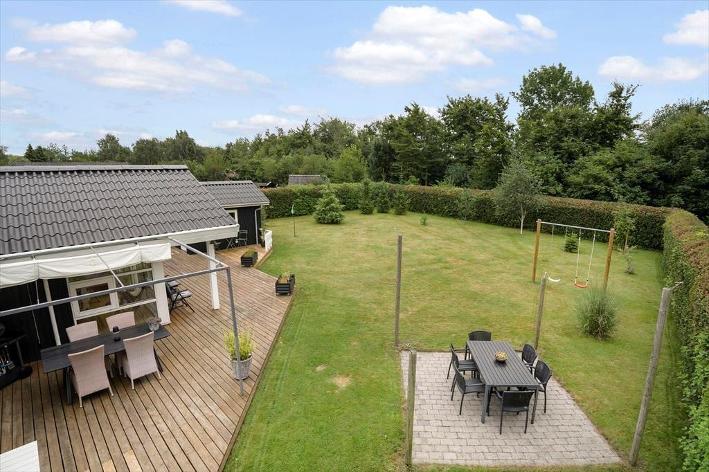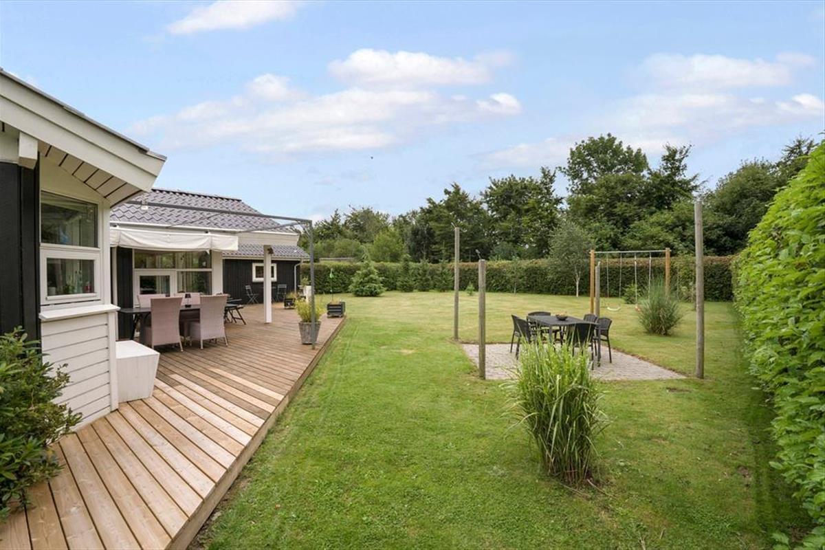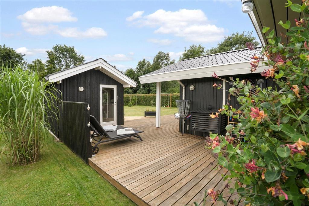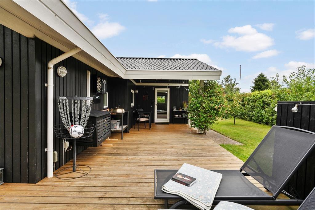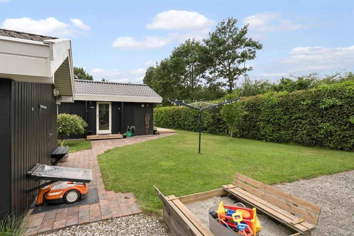 Mooi en goed onderhouden vakantiehuis, gelegen in het populaire vakantiepark Hasmark, op slechts 300 meter van het strand. Het huis heeft een entree, een goed ingerichte keuken die in open verbinding staat met de eetkamer en de woonkamer met houtkachel, energiebesparende warmtepomp en schuin plafond. De woning bevat 3 goede slaapkamers, een extra toilet en een grote badkamer met whirlpool, sauna en wasmachine. Vanaf het terras is er directe toegang tot een goed bijgebouw met nog 2 bedden. In het huis is er ook een vide met matrassen. Vanuit zowel de woonkamer als de eetkamer is er toegang tot een groot, nieuw houten terras van ca. 90 m2 met verschillende gezellige hoekjes en naar de tuin met een groot gazon dat uitnodigt tot balspelen en spelen.