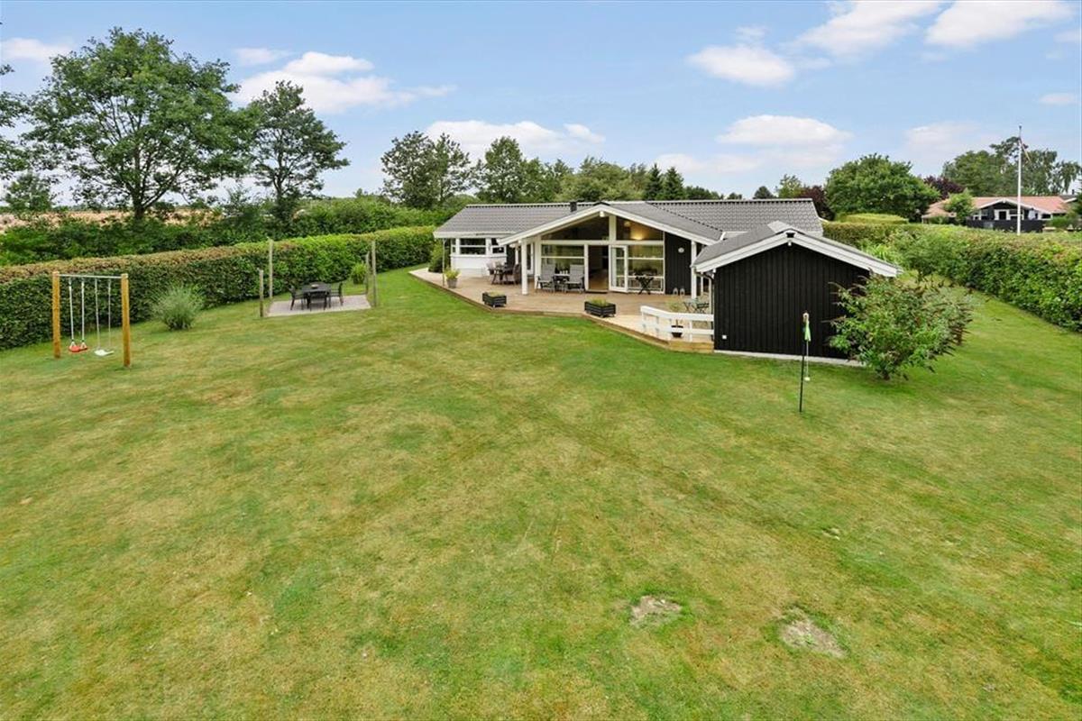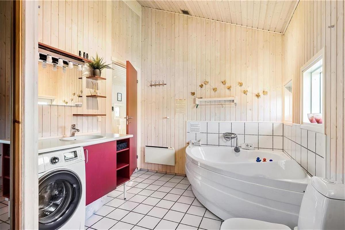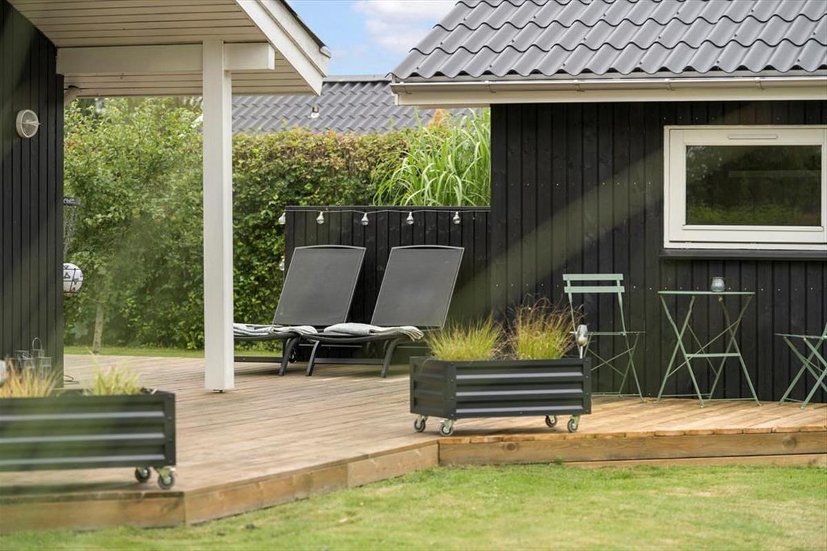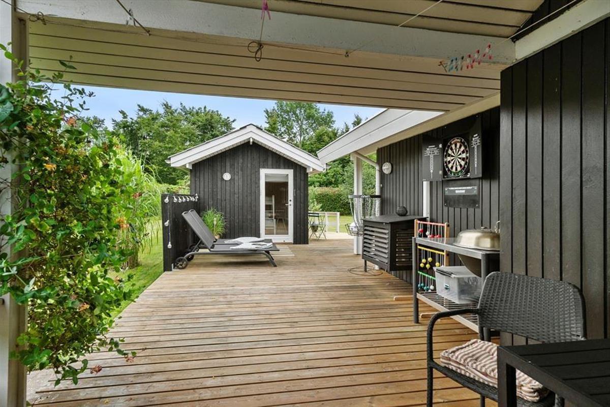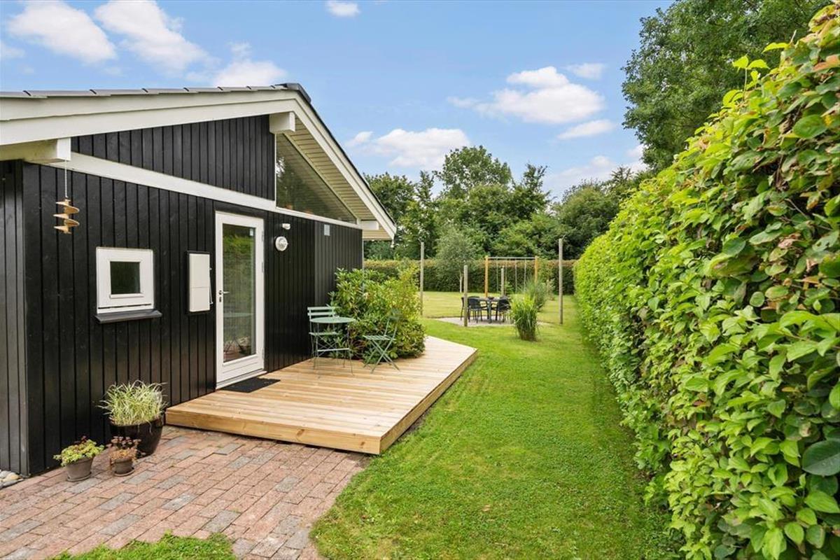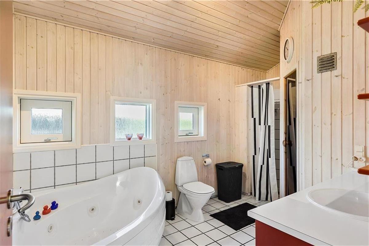 Mooi en goed onderhouden vakantiehuis, gelegen in het populaire vakantiepark Hasmark, op slechts 300 meter van het strand. Het huis heeft een entree, een goed ingerichte keuken die in open verbinding staat met de eetkamer en de woonkamer met houtkachel, energiebesparende warmtepomp en schuin plafond. De woning bevat 3 goede slaapkamers, een extra toilet en een grote badkamer met whirlpool, sauna en wasmachine. Vanaf het terras is er directe toegang tot een goed bijgebouw met nog 2 bedden. In het huis is er ook een vide met matrassen. Vanuit zowel de woonkamer als de eetkamer is er toegang tot een groot, nieuw houten terras van ca. 90 m2 met verschillende gezellige hoekjes en naar de tuin met een groot gazon dat uitnodigt tot balspelen en spelen.