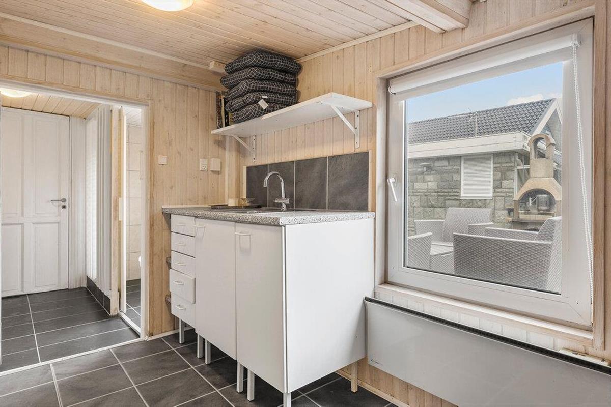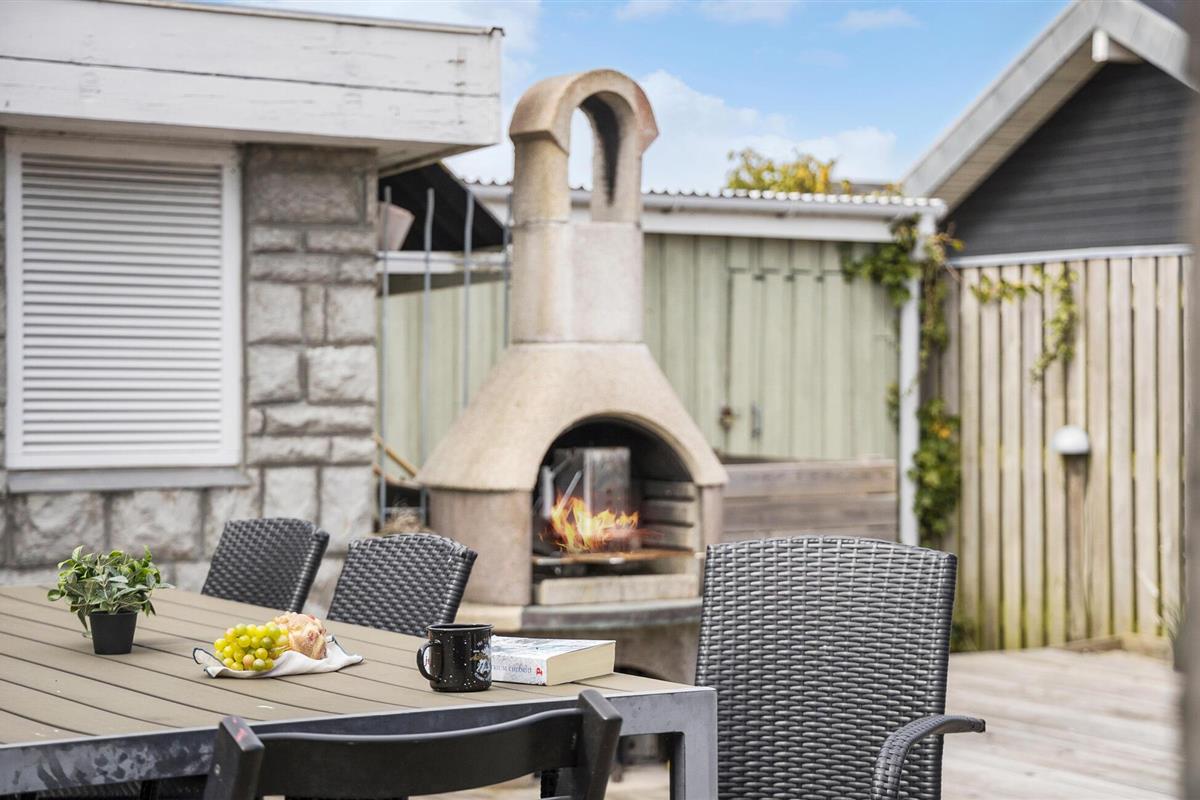 Stap naar buiten en geniet van het volledig beschutte houten terras dat het huis omringt, waar je niet alleen kunt barbecueën maar ook pizza's kunt bakken in de steenoven.