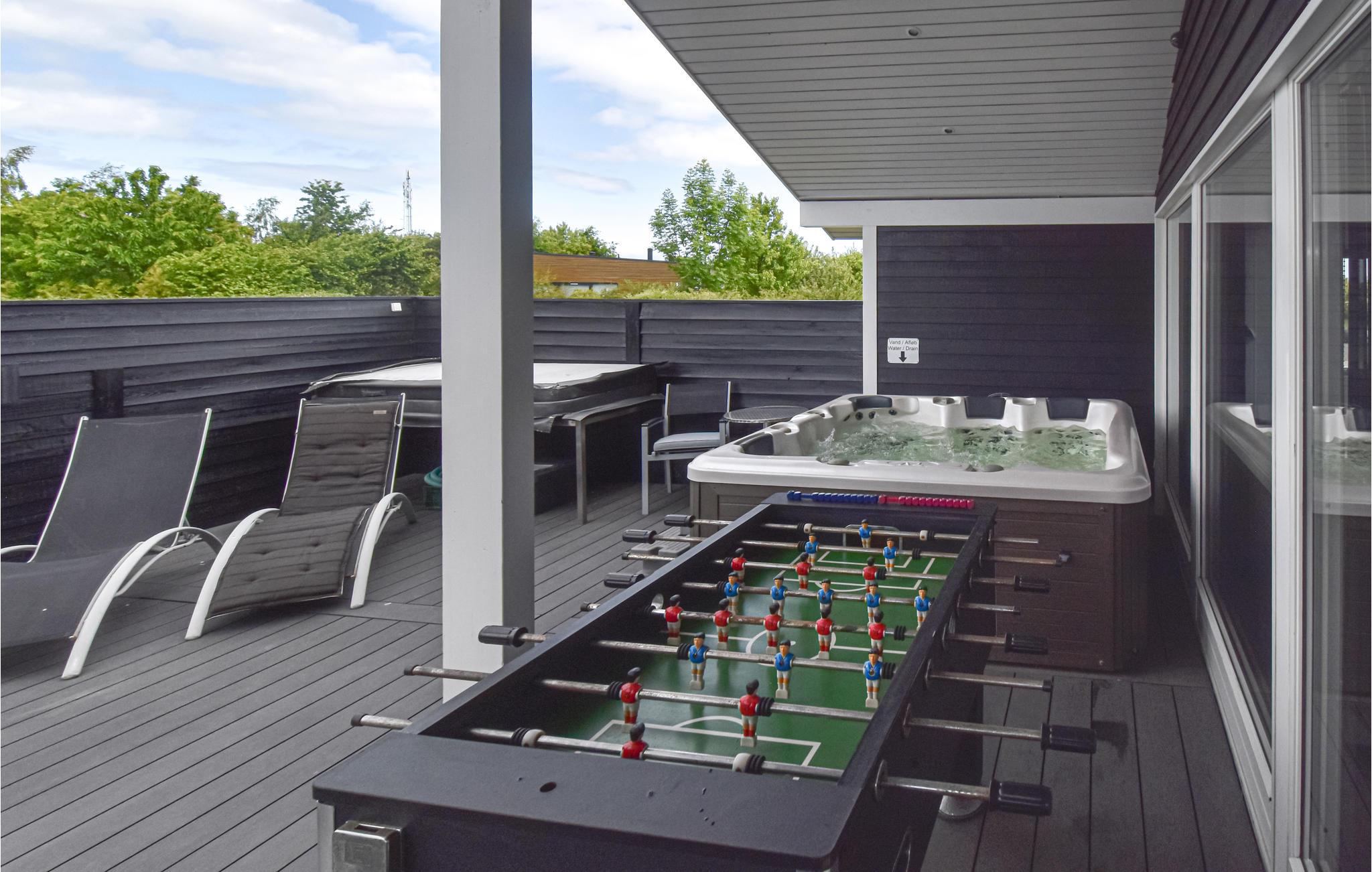 Open de openslaande deuren en breid je leefruimte uit naar buiten. Comfortabel tuinmeubilair, ligstoelen en een eettafel voor lange zomeravonden wachten op je op het grote, gedeeltelijk overdekte houten terras. Ontspan in de grote hot tub in de buitenlucht of daag jezelf uit aan de tafelvoetbaltafel. Terwijl de kinderen springen op de trampoline, schommelen of spelen in de tuin, kun jij genieten van de rust en stilte van het goed onderhouden gazon.