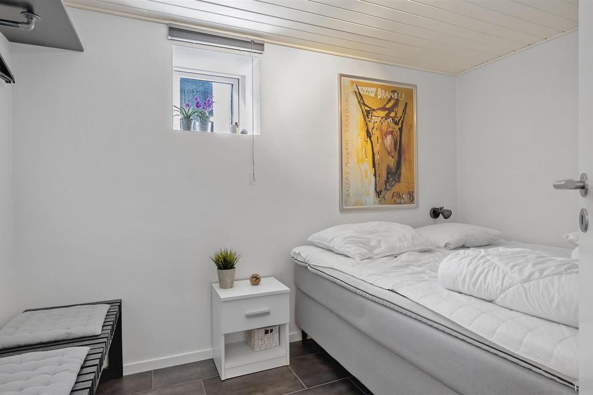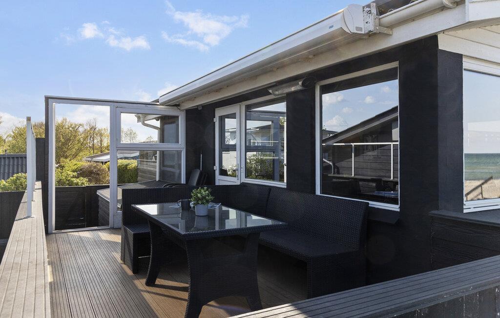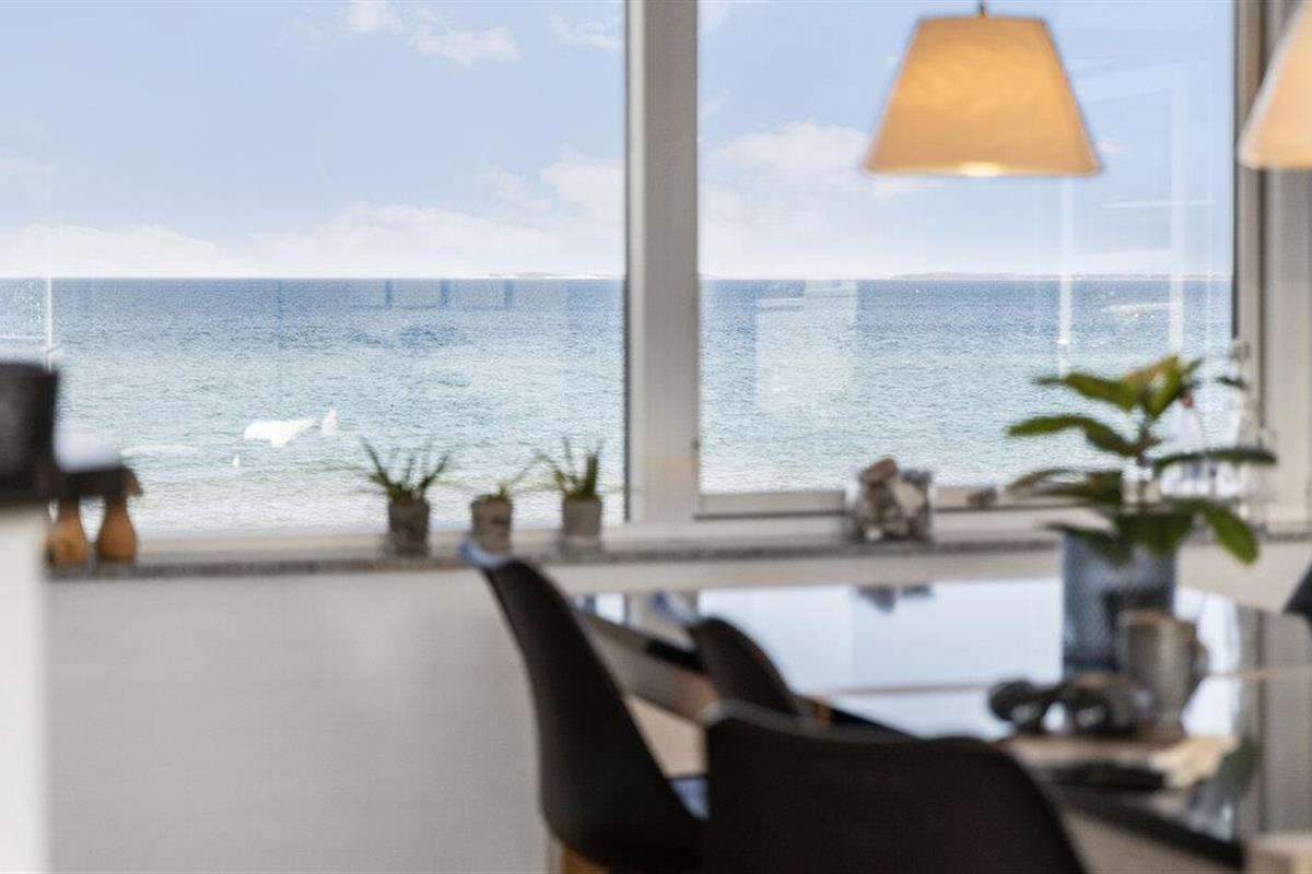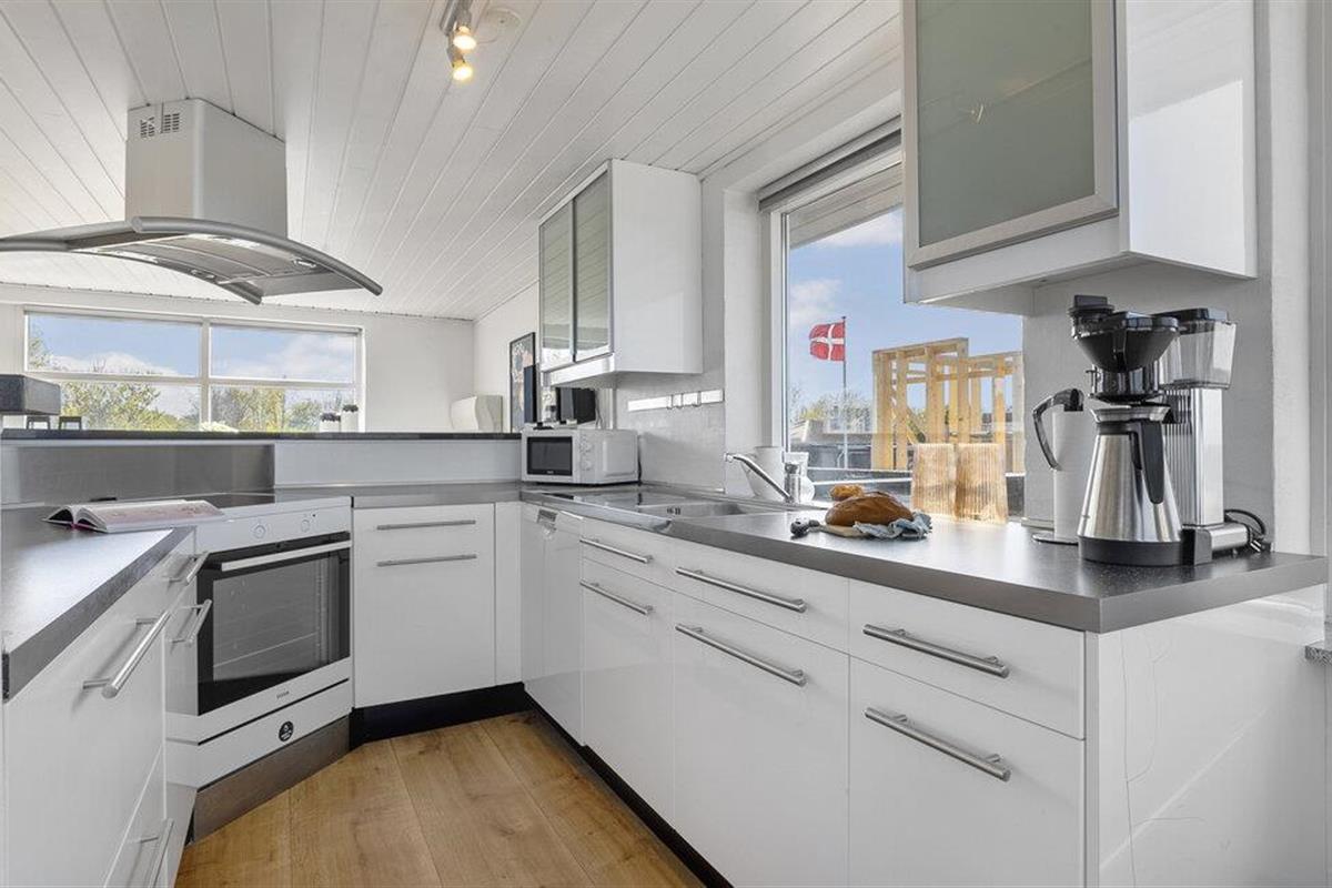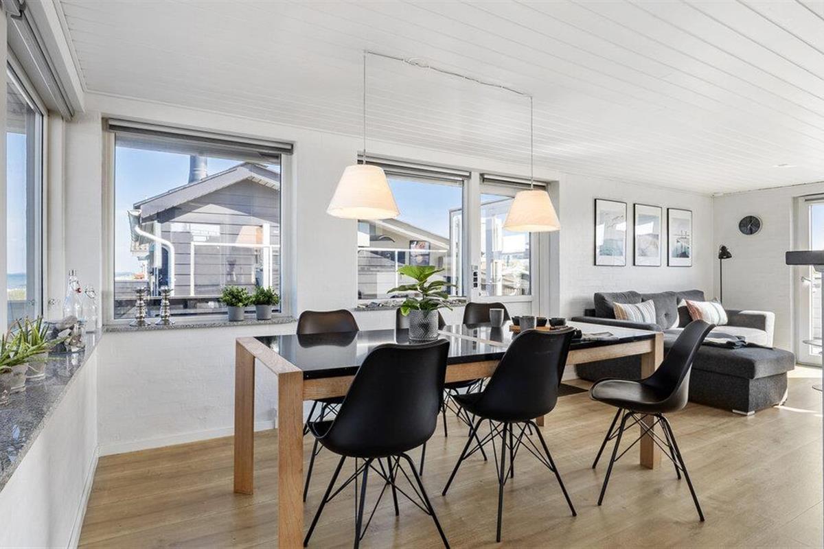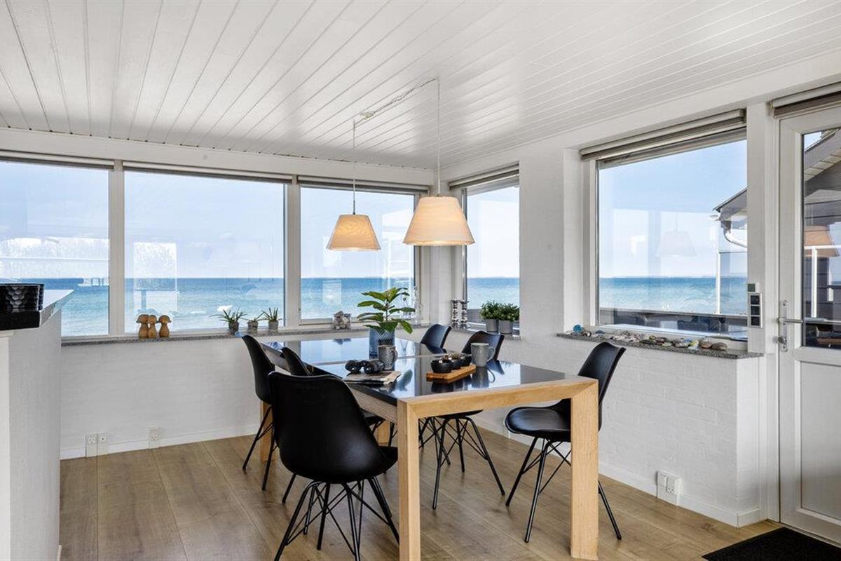 Dit moderne vakantiehuis ligt direct aan het Hasmark-strand op Funen en is perfect voor een ontspannen vakantie met het geluid van de golven op de achtergrond. Begin de dag met een kopje koffie en uitzicht op zee, binnen door de grote ramen of buiten op een van de beschutte terrassen. Geniet van de exclusieve locatie direct aan het strand, zonder doorgaand verkeer of buren in het zicht. De lichte woonkamer verwelkomt je met strakke lijnen, moderne meubels en een gezellige bank. Ga lekker zitten, kijk een film of ontspan met wat muziek. De keuken is open en biedt voldoende ruimte om te koken. Eet je maaltijden aan de eettafel met direct uitzicht op zee, terwijl de grote ramen zorgen voor veel licht en een gevoel van ruimte.