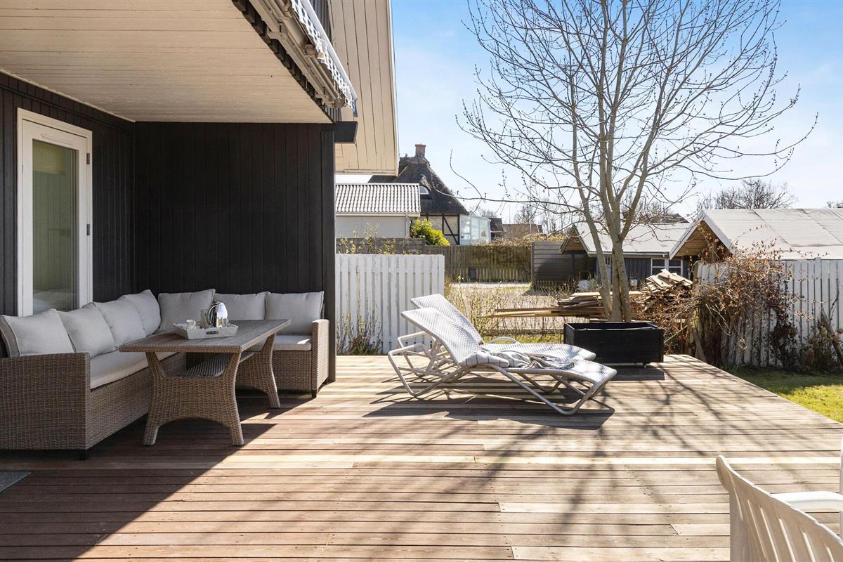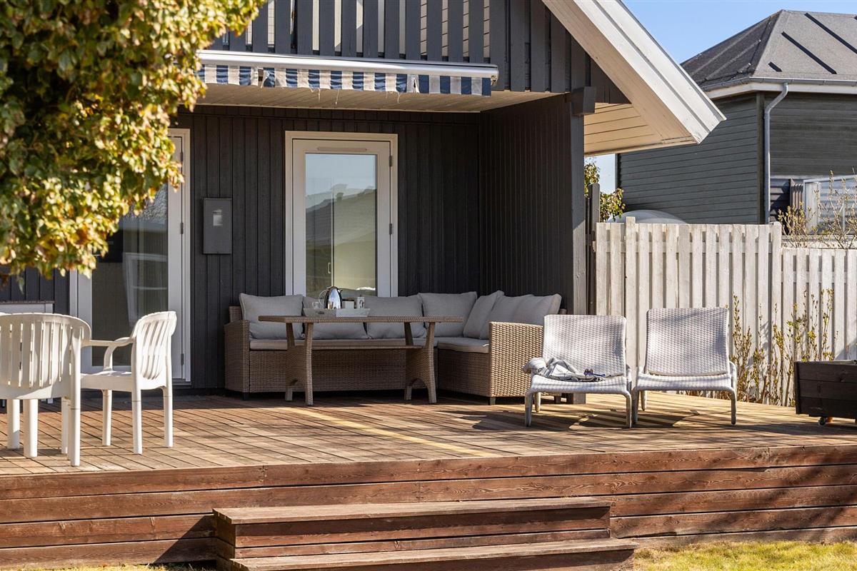 Buiten wacht een ruim houten terras met comfortabel tuinmeubilair en ligstoelen op je. Ontspan en kom tot rust terwijl je geniet van het directe uitzicht op het water. De goed onderhouden tuin biedt volop ruimte voor vrijetijdsbesteding en nodigt uit tot ontspannen barbecue-avonden. Je kunt 's ochtends wandelen op het zandstrand of een verfrissende duik in zee nemen.