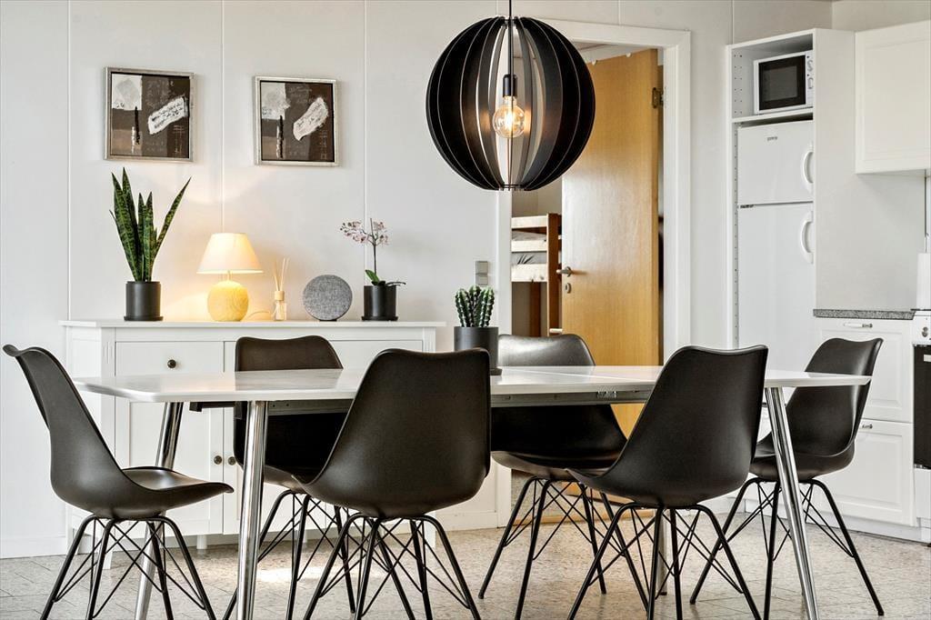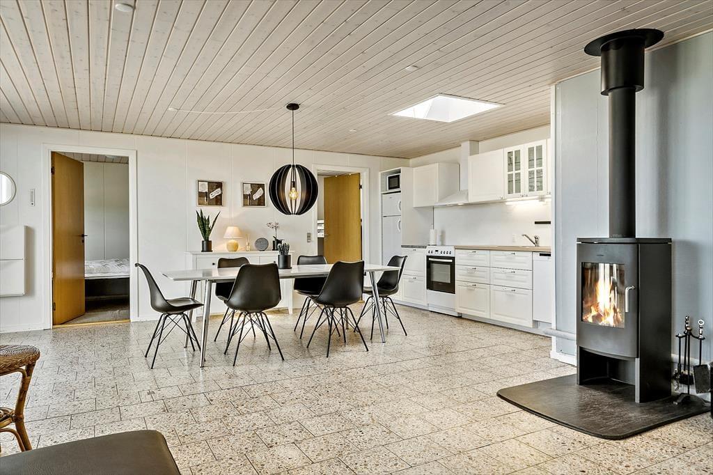 Die Wohnung ist modern und komfortabel eingerichtet. Hier können Sie sich auf einen großen, offenen Wohnbereich freuen, in dem Küche und Wohnzimmer ineinander übergehen. Die Küche ist ansprechend eingerichtet und bietet viel Platz, um gemeinsam leckere Mahlzeiten zu kochen, und dank der Spülmaschine müssen Sie Ihre kostbare Urlaubszeit nicht dem Abwasch opfern. Der Esstisch und die Sofalandschaft bieten viel Platz für Mahlzeiten und gesellige Abende, und mit einem Fernseher und Wi-Fi ist für Unterhaltung gesorgt. Oberlichter und bodentiefe Fenster sorgen für einen wunderbaren Lichteinfall sowie einen herrlichen Ausblick auf die Natur. Die Wärmepumpe und der Kaminofen sorgen für behagliche Wärme. Die zwei Schlafzimmer bieten Platz für bis zu fünf Personen. Vervollständigt wird die Wohnung durch ein Badezimmer mit Dusche.
