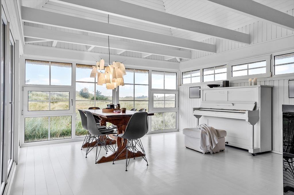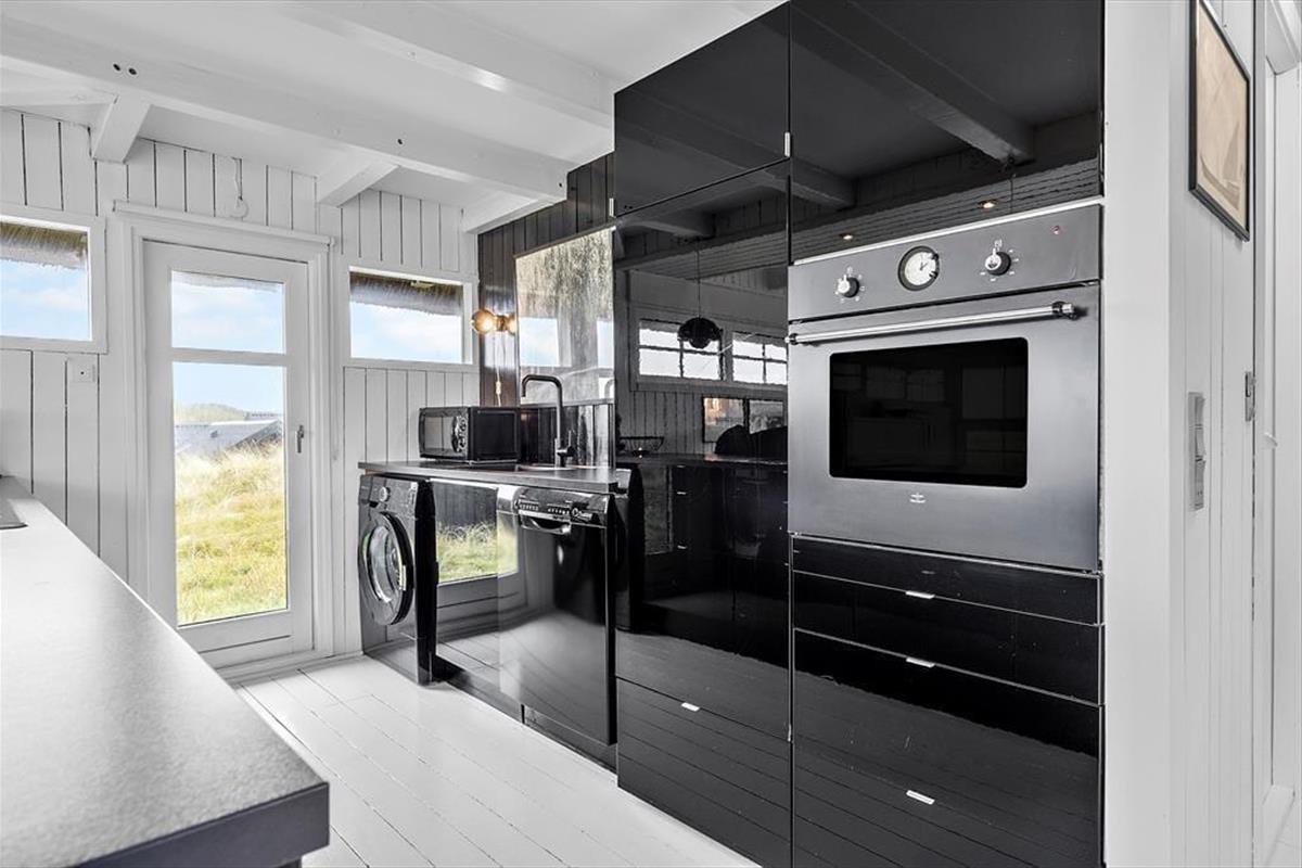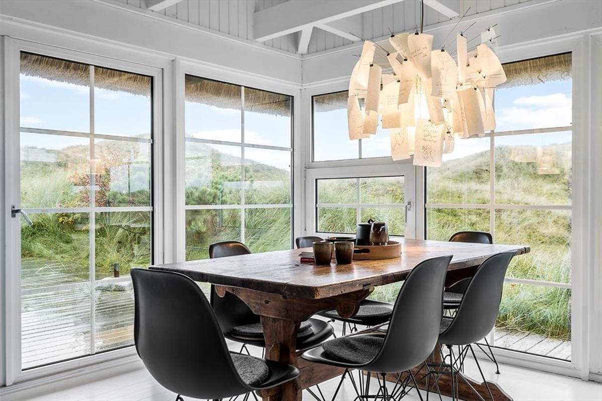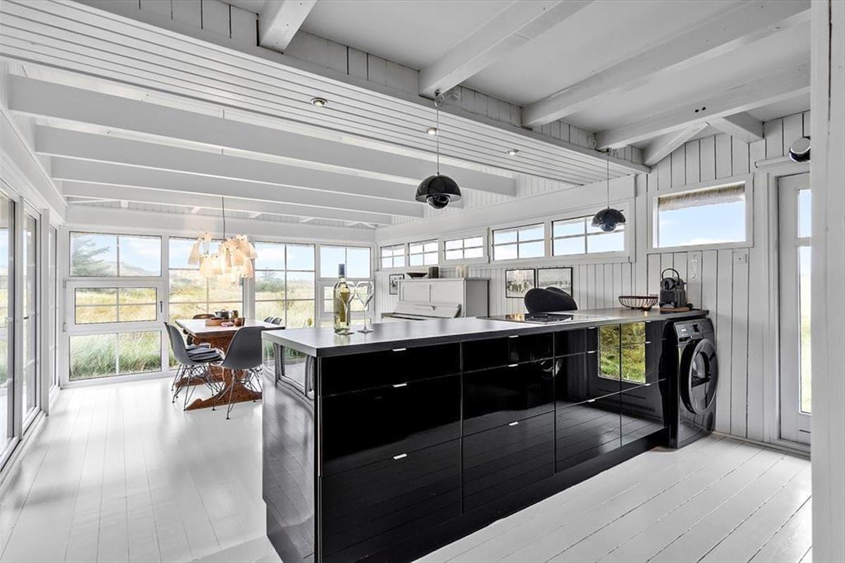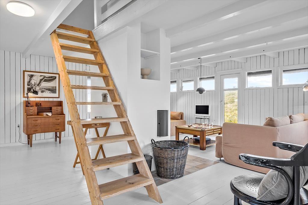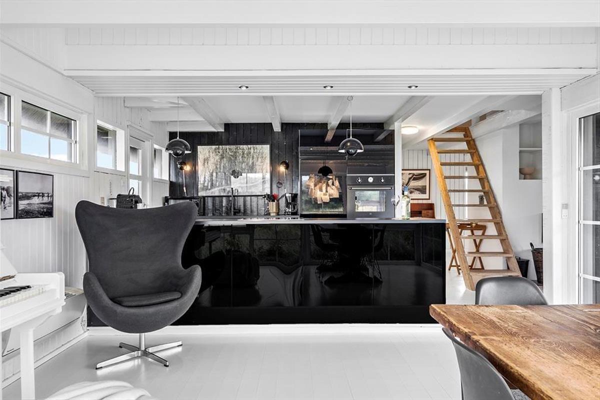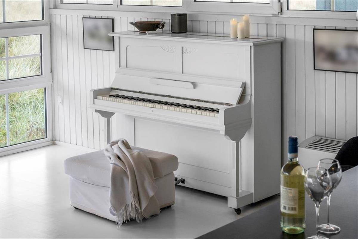 Unmittelbar nach dem ersten Betreten wirst du dich in deinem hellen, einladenden Ferienhaus heimisch und wohl fühlen. Die 100 m² umfassende Wohnfläche erstreckt sich über zwei Etagen und eignet sich gut für eine kleine Familie. Auch wenn du nur mit deiner besseren Hälfte anreist, werdet ihr euch im Haus ausgesprochen wohlfühlen. Im Erdgeschoss erwartet dich eine schöne, gut ausgestattete Küche, die sich offen in den Aufenthaltsbereich einfügt. Neben der Küche stehen an einer Seite eine gemütliche Polstersitzgruppe und ein Einbaukaminofen bereit. An der andern Seite laden ein Klavier und ein Essplatz zu geselligen Stunden ein. Aufgrund der großen Fensterpartien erinnert der Essbereich an einen Wintergarten. Freu dich darauf, dich hier in Ruhe niederzulassen und den freien Ausblick auf die bezaubernde Dünenlandschaft zu genießen! Das Badezimmer mit einer kleinen Badewanne ist ebenfalls im Erdgeschoss untergebracht. Im ersten Stock erwarten dich vier Schlafplätze. Beachte bitte, dass die beiden Schlafbereiche offen miteinander verbunden, beziehungsweise nur durch eine halbhohe Mauer voneinander getrennt sind. Durch die kleinen Fenster des Obergeschosses blickst du auf den Fjord.