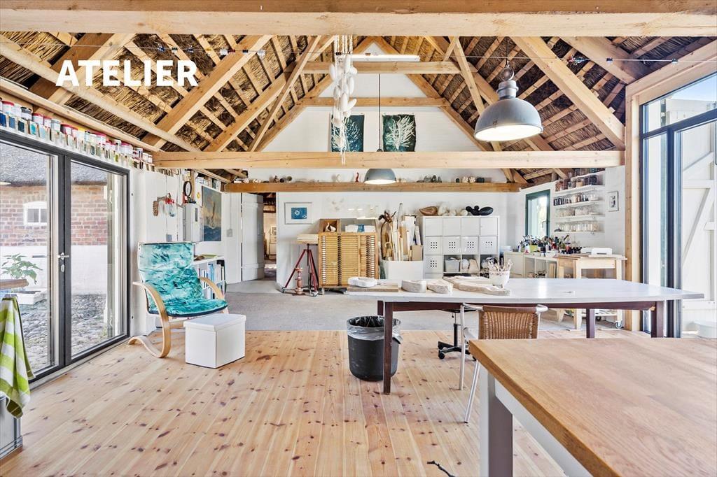 Künstlerflair und kreative Inspiration erwarten Sie direkt auf dem Hof. Wenn Sie um das Gebäude herumgehen, erreichen Sie das Atelier und die Werkstatt der international anerkannten Künstlerin Doris Leuschner, die auf diesem Hof ansässig ist. Doris Leuschner öffnet ihre Türen für Ausstellungen und für Kreativworkshops, die von Ihnen belegt werden können. In nördlicher Richtung freut sich der populäre und interessante Fischereihafenort Hvide Sande auf Ihren Besuch. In Hvide Sande laden gute Restaurants, Fischräuchereien und interessante Geschäfte zum Bummeln und Verweilen ein. An der bei Anglern überaus beliebten Schleuse des Ortes können Sie selbst Ihre Angelruten auswerfen. Gemütliche Bootsfahrten im Hafen und Hochseeangeltouren werden angeboten.
