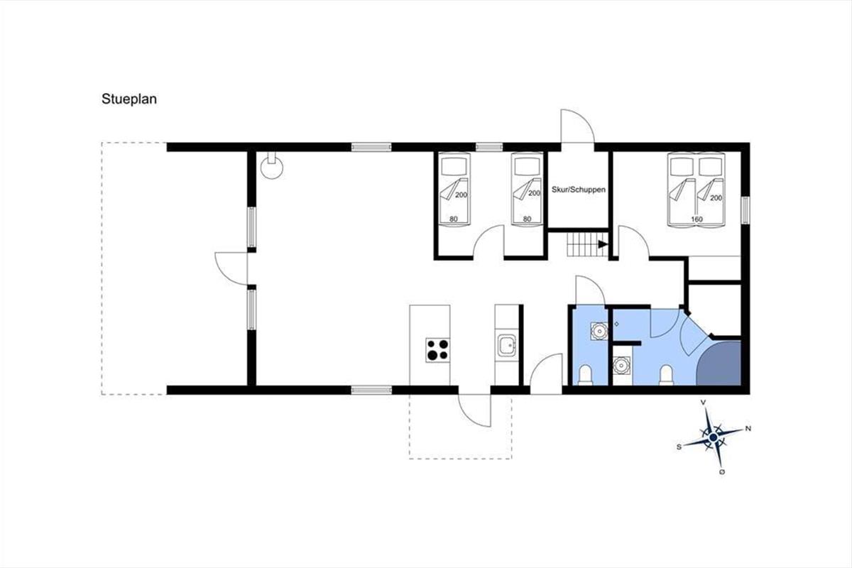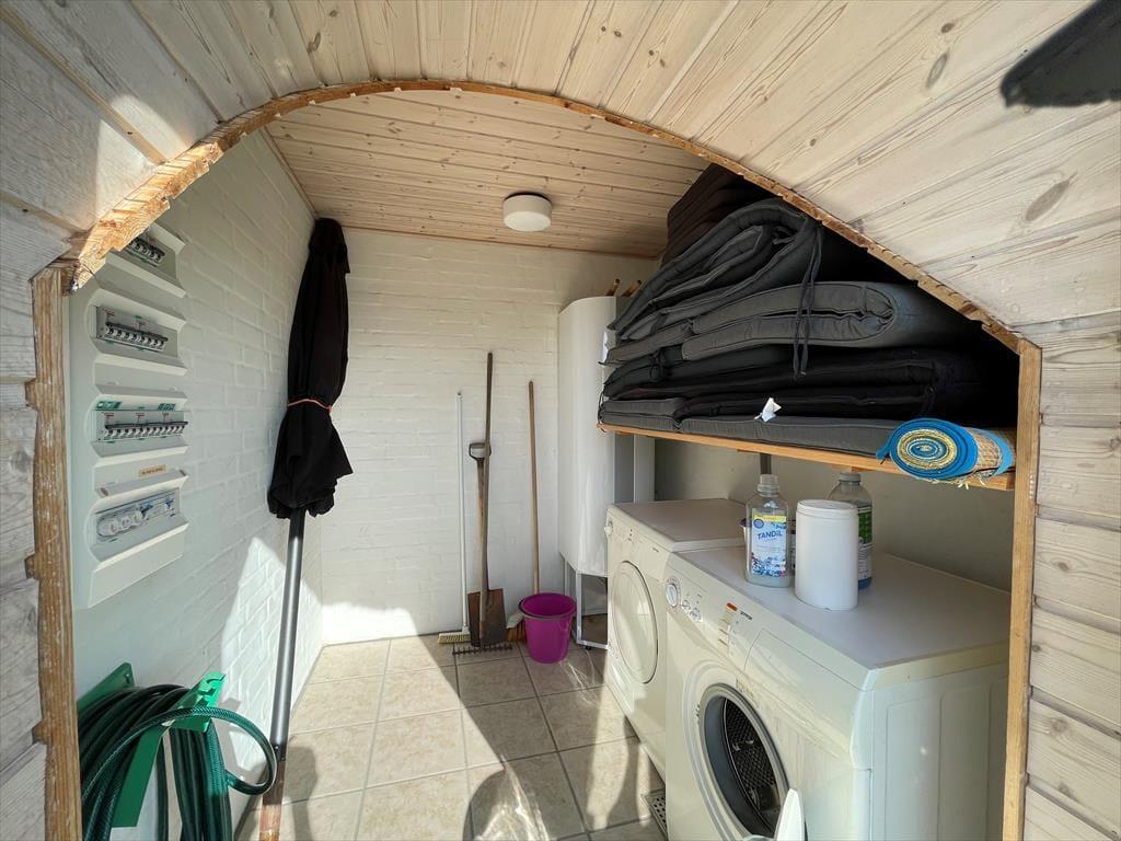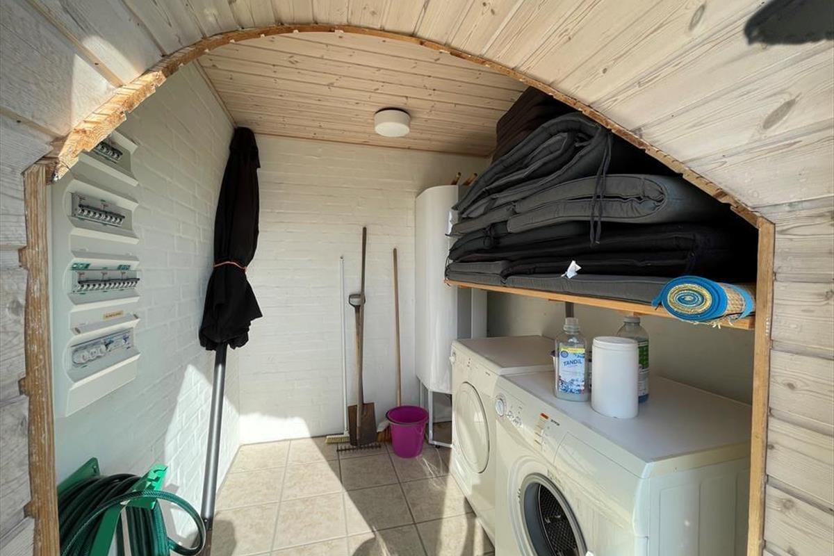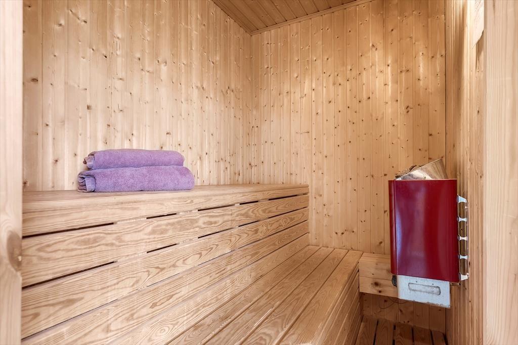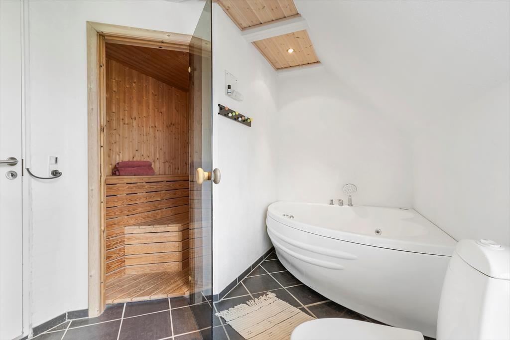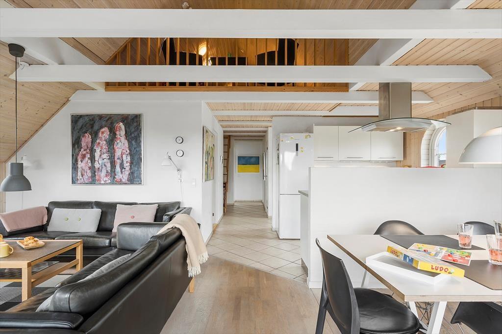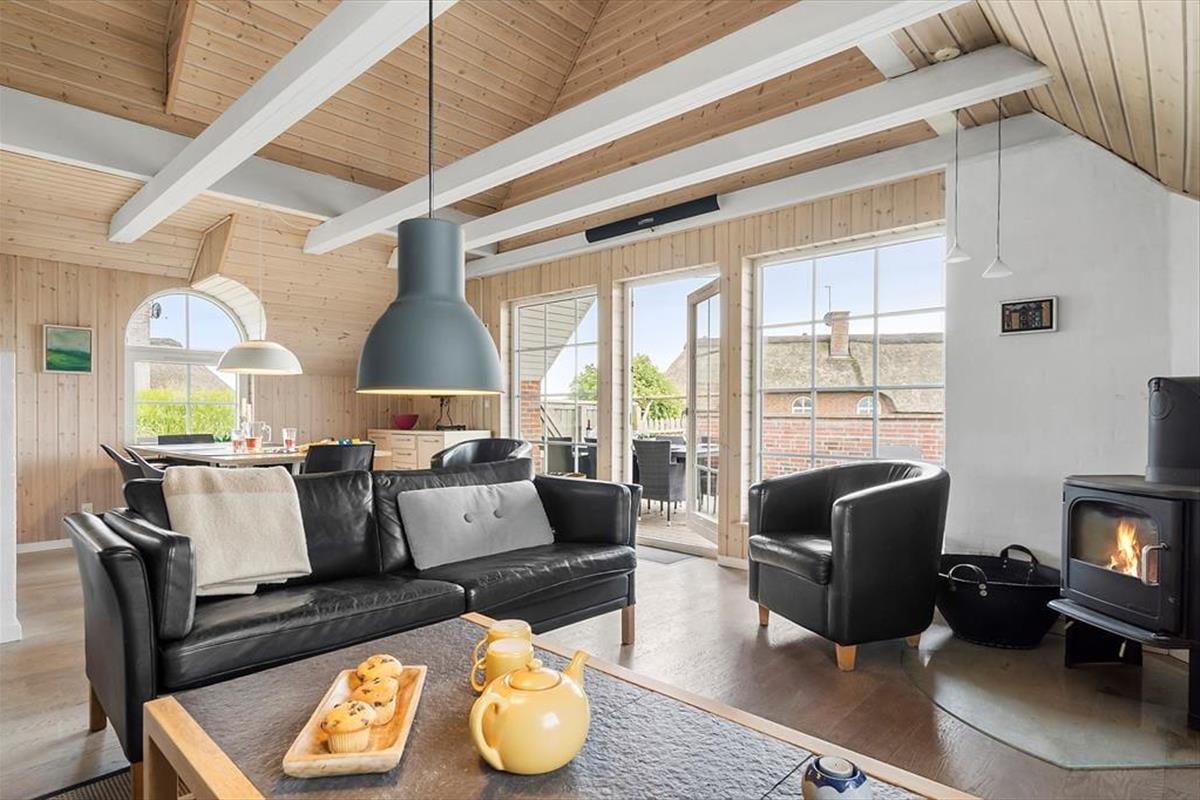 Hinter der soliden Steinfassade deines Ferienhauses erwarten dich helle, einladende Räumlichkeiten. Der Wohnraum besticht mit hohen Decken und einer offenen Balkenlage. Die Holzvertäfelung der Wände trägt zusammen mit dem Kaminofen und dem komfortablen Mobiliar maßgeblich zur gemütlichen, klassisch dänischen Ferienhausatmosphäre bei. Die Küche fügt sich offen in den Wohn- und Essbereich ein, sodass du selbst während der Zubereitung der Mahlzeiten Teil des Familiengeschehens bleibst. Nach dem Abendessen laden der Whirlpool und die Sauna im großen Badezimmer zum erholsamen Ausklang eines aktiven, erlebnisreichen Tages ein. Ein Gäste-WC ist praktischerweise vorhanden. Gleiches gilt für zwei schöne Schlafräume und für einen tollen, gemütlichen Schlafboden mit zusätzlichen Schlafplätzen.