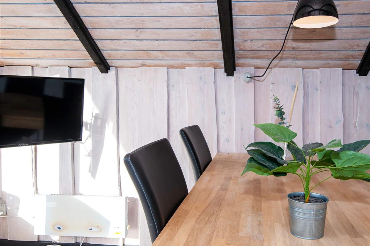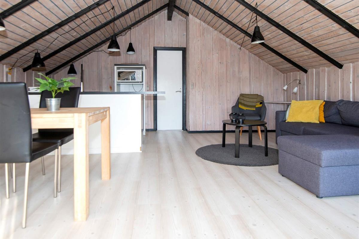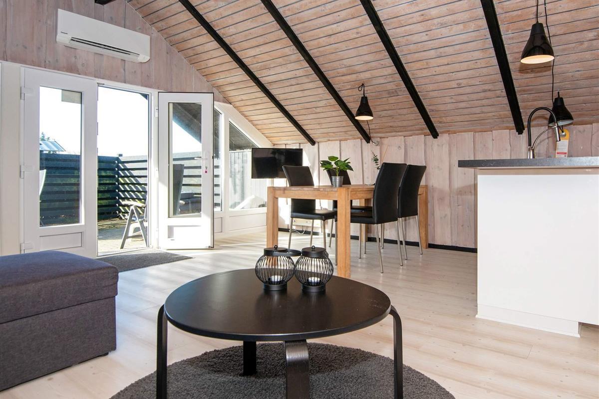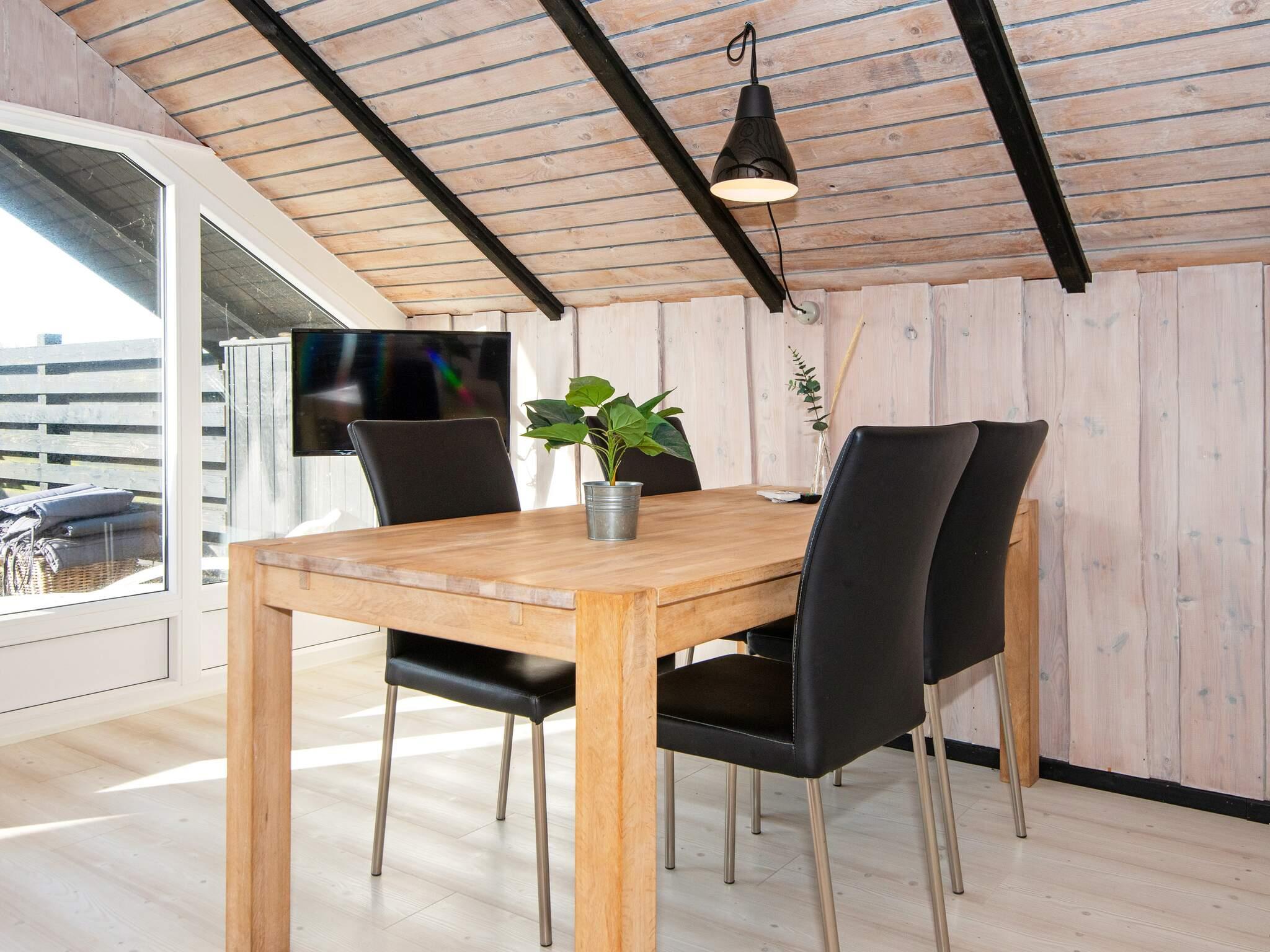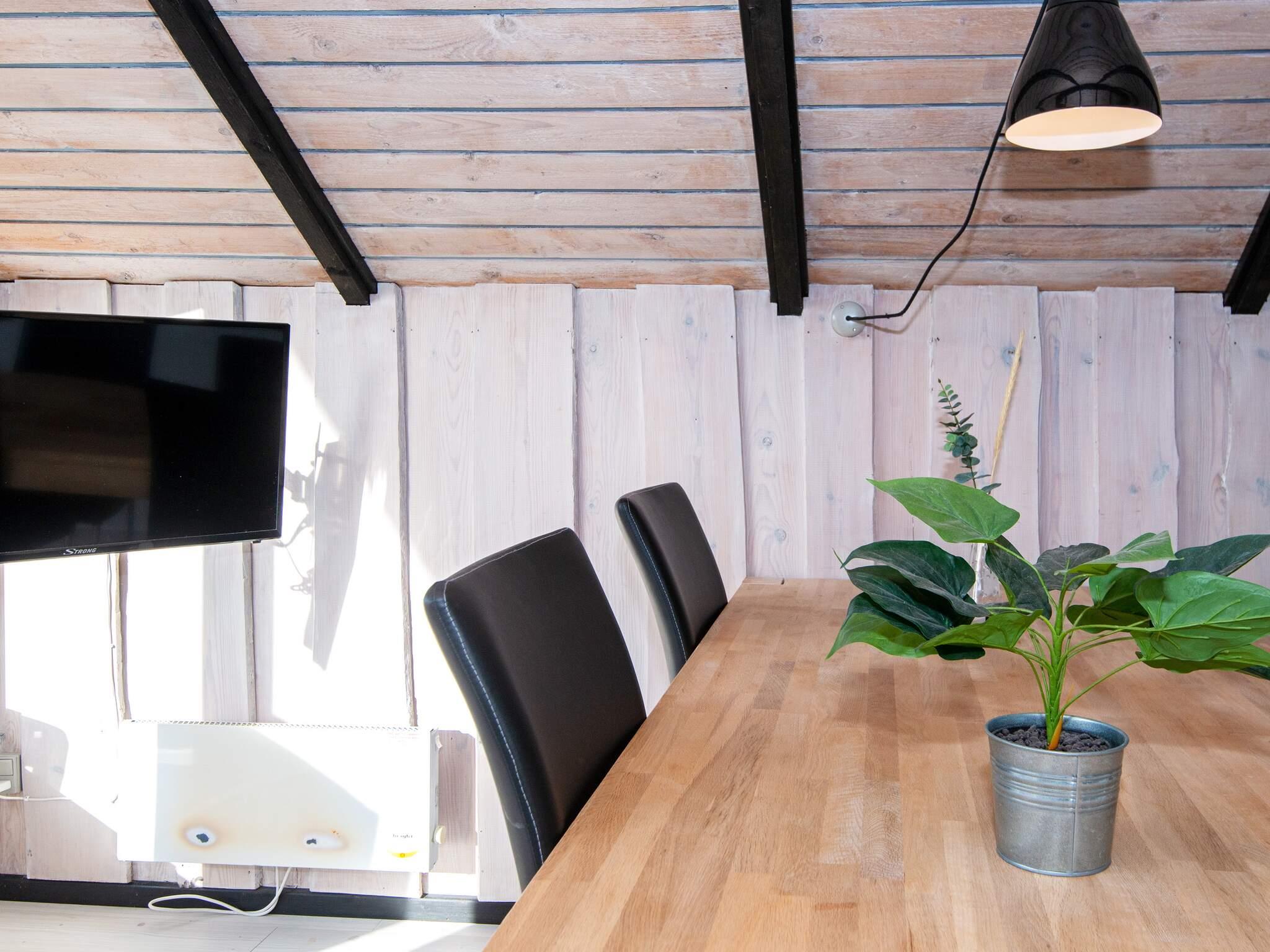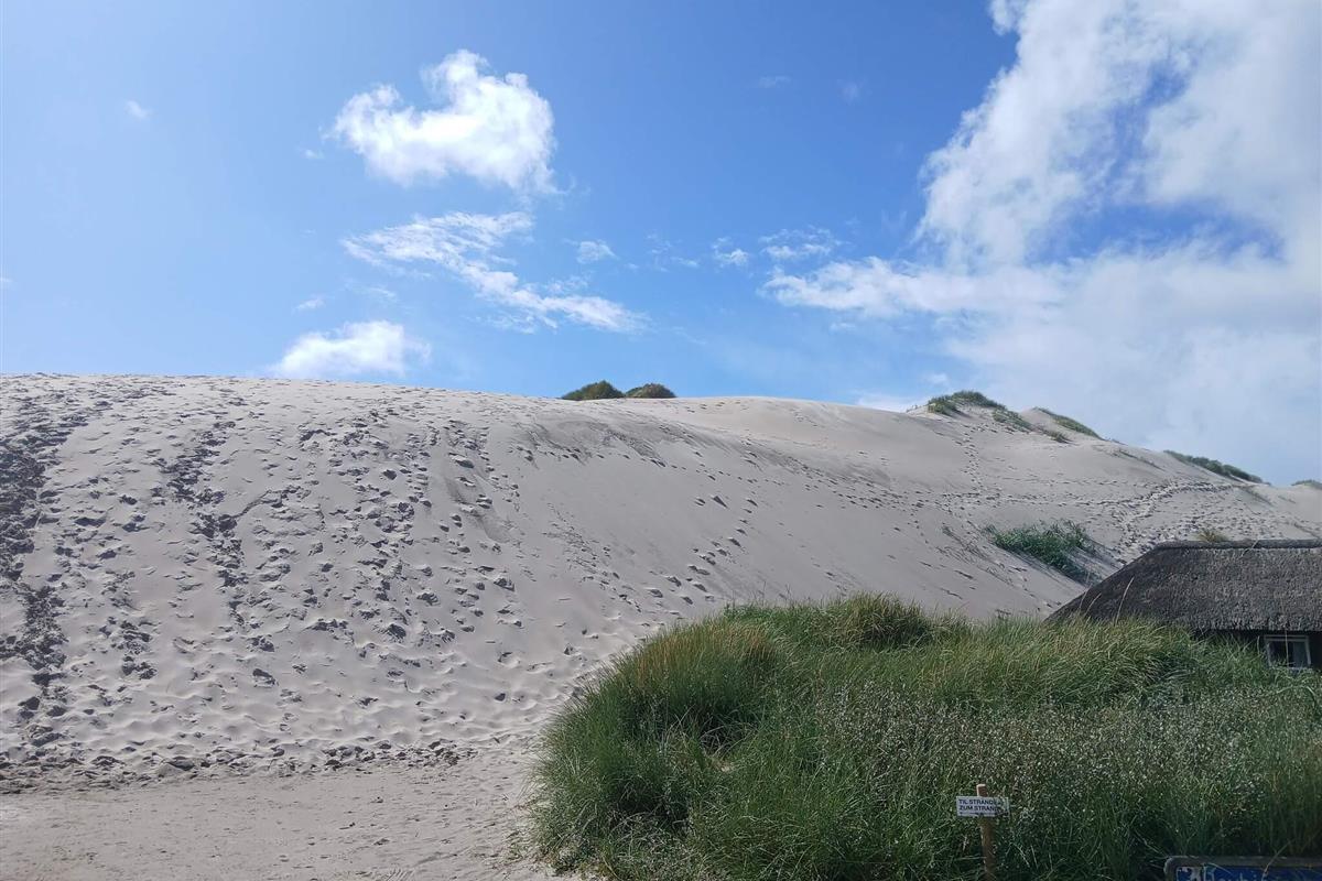 Innen gibt es einen offenen Küchen-/Wohnbereich mit Essecke und großer Fensterfläche sowie Zugang zur Südterrasse des Hauses, von der Sie herrlichen Ausblick zur umliegenden Dünenlandschaft haben.