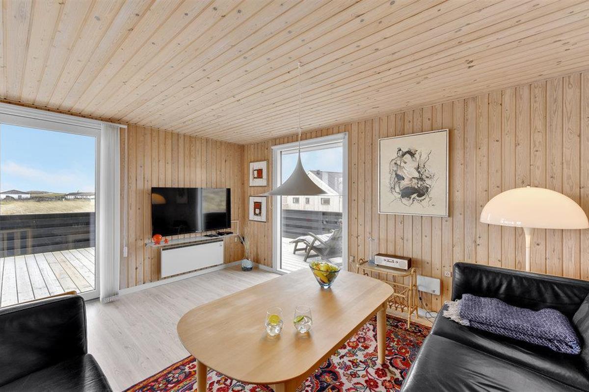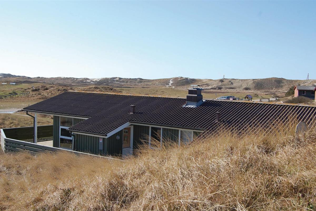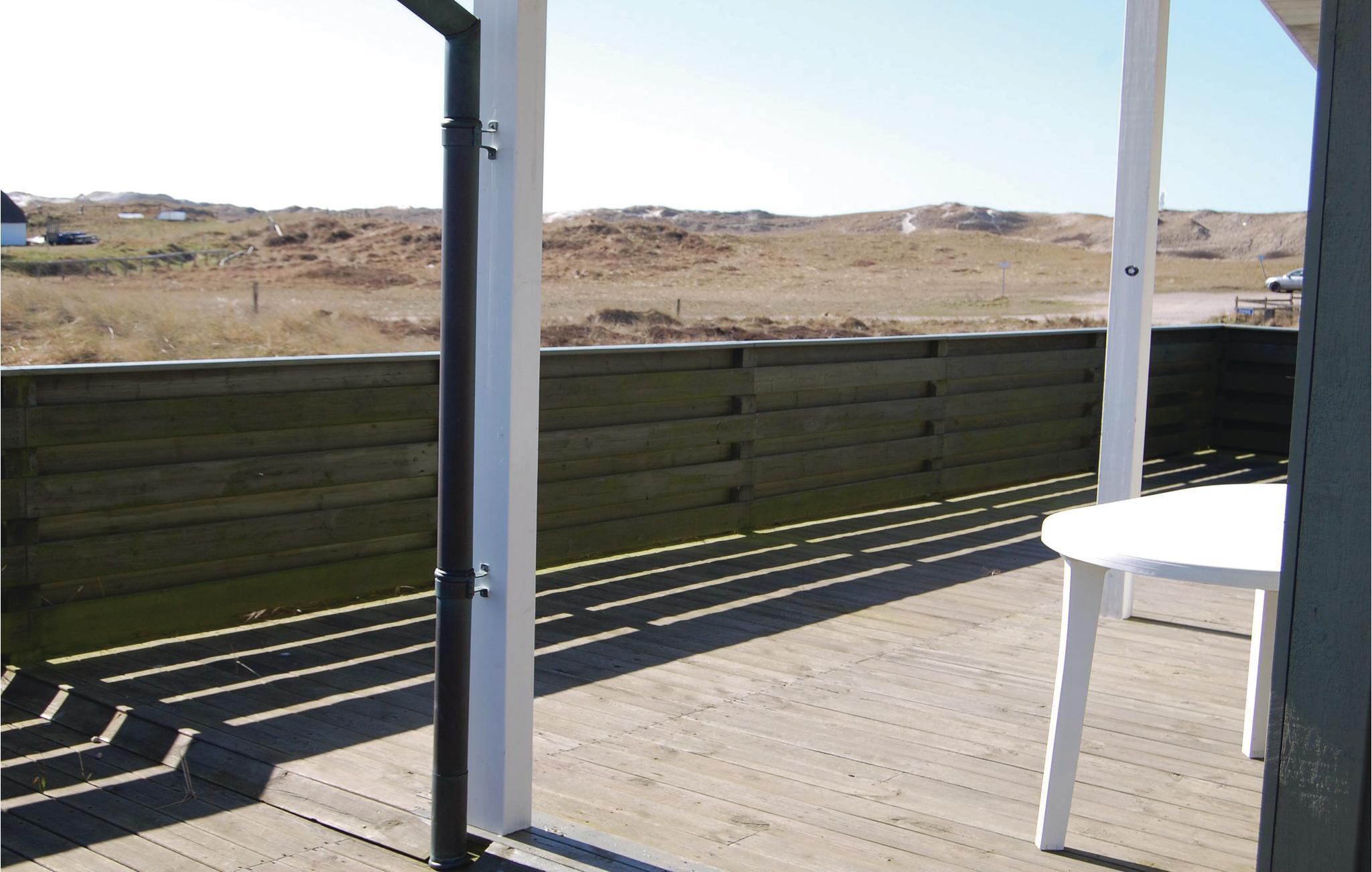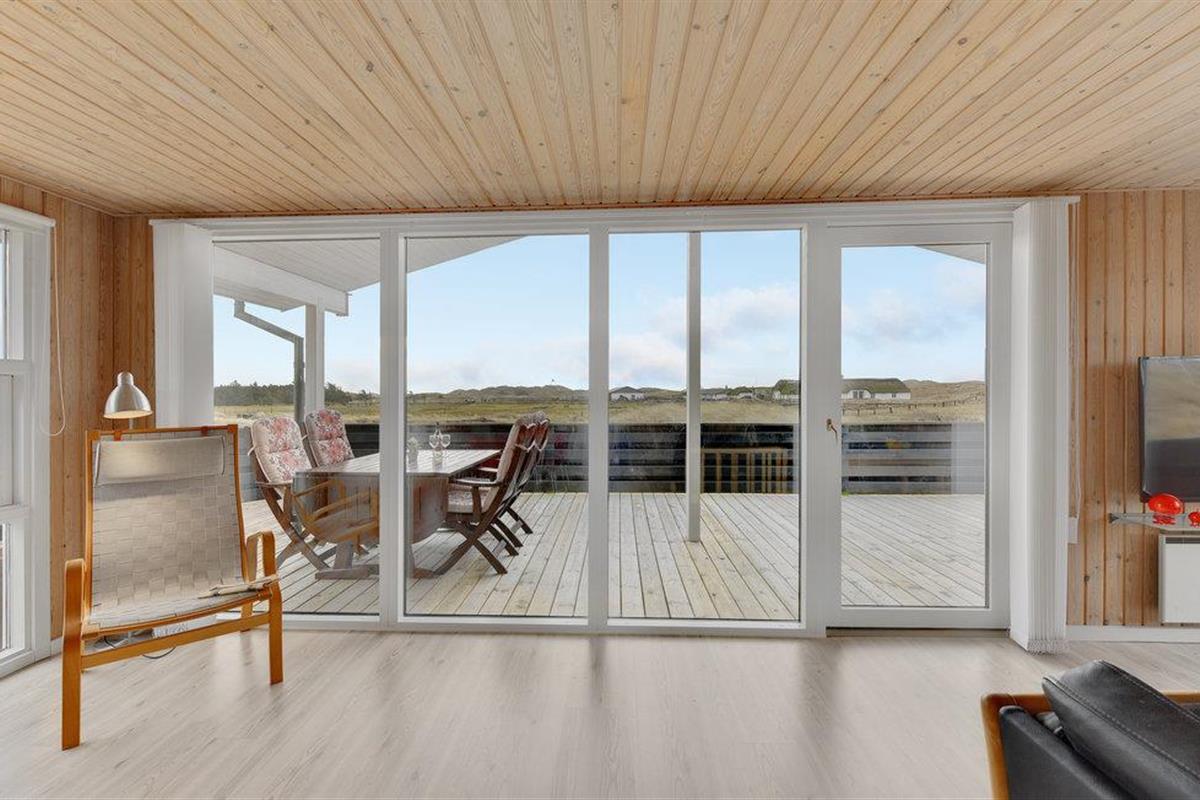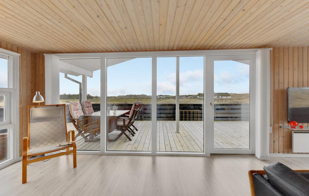 Comfortabel houten vakantiehuis in Hvide Sande met omheind terras en uitzicht op duinen.