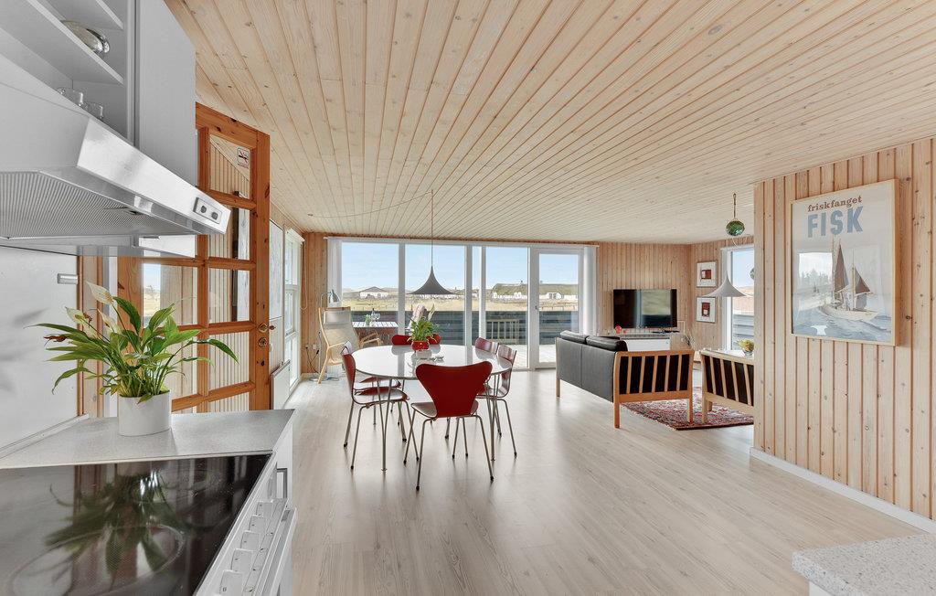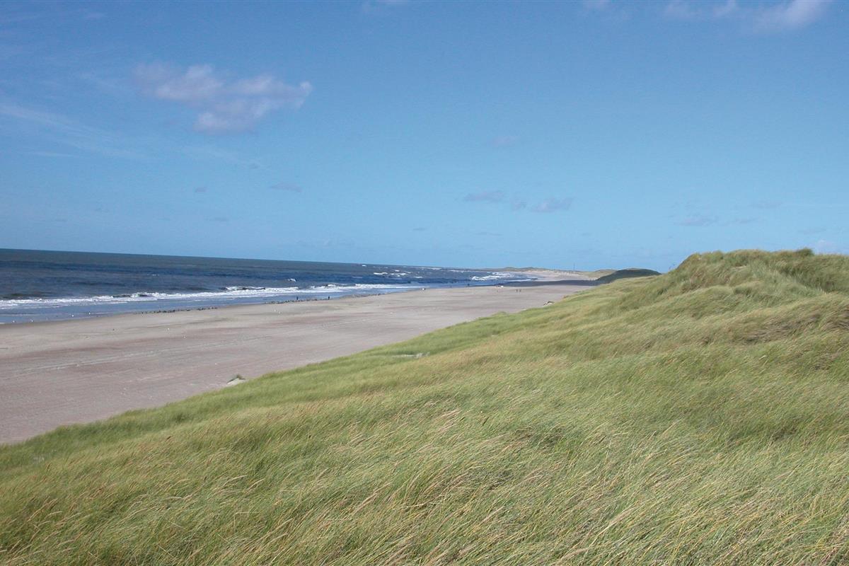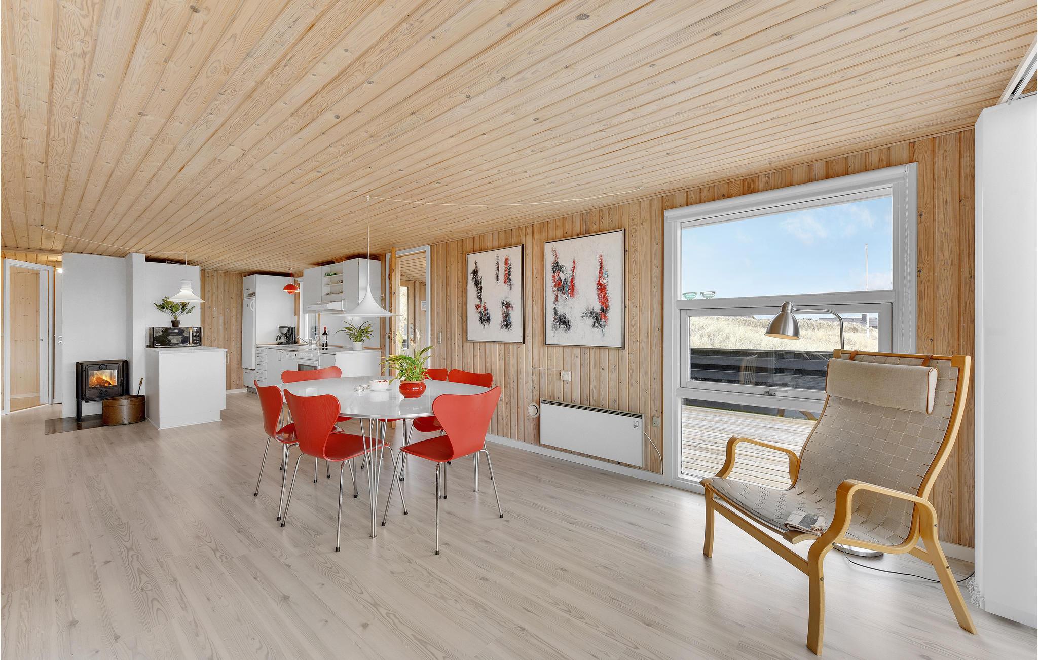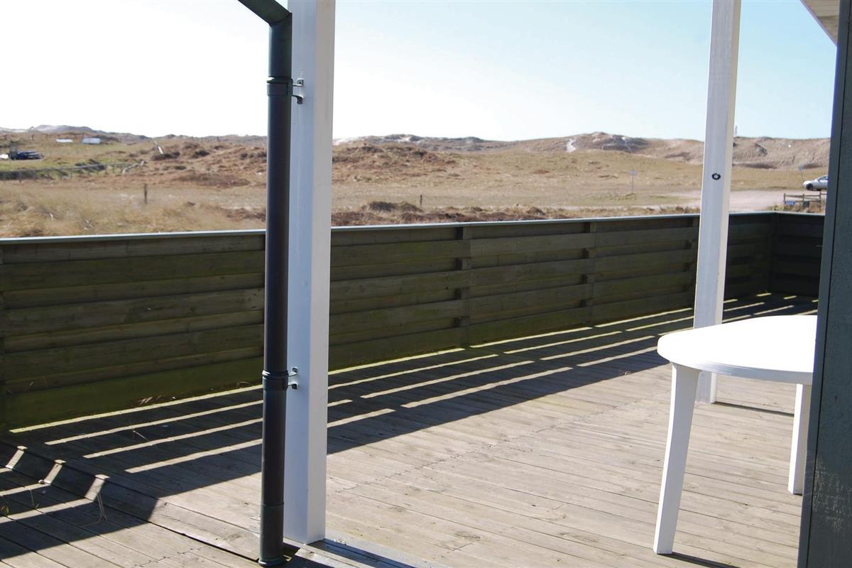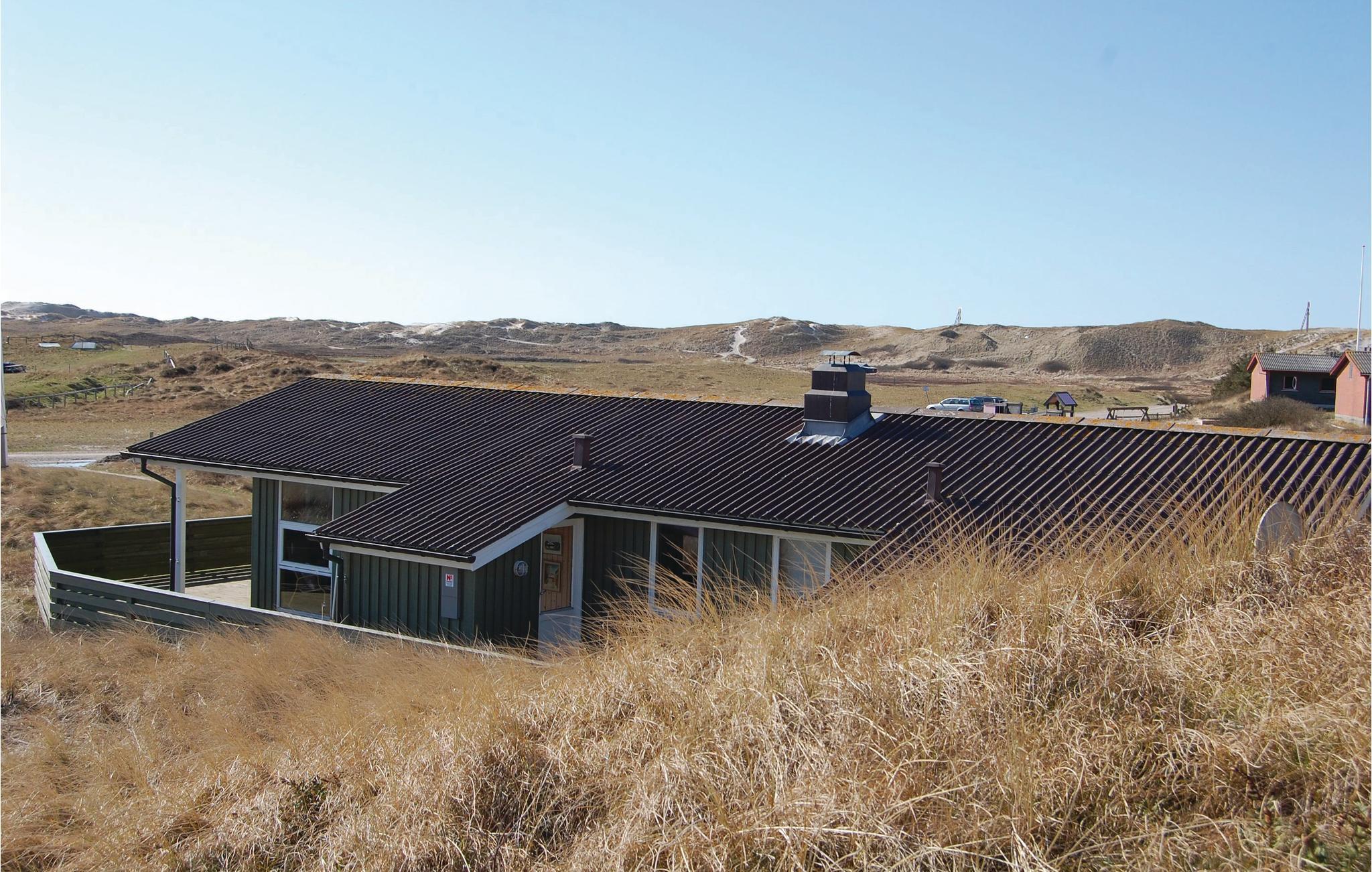 Comfortabel houten vakantiehuis in Hvide Sande met omheind terras en uitzicht op duinen.