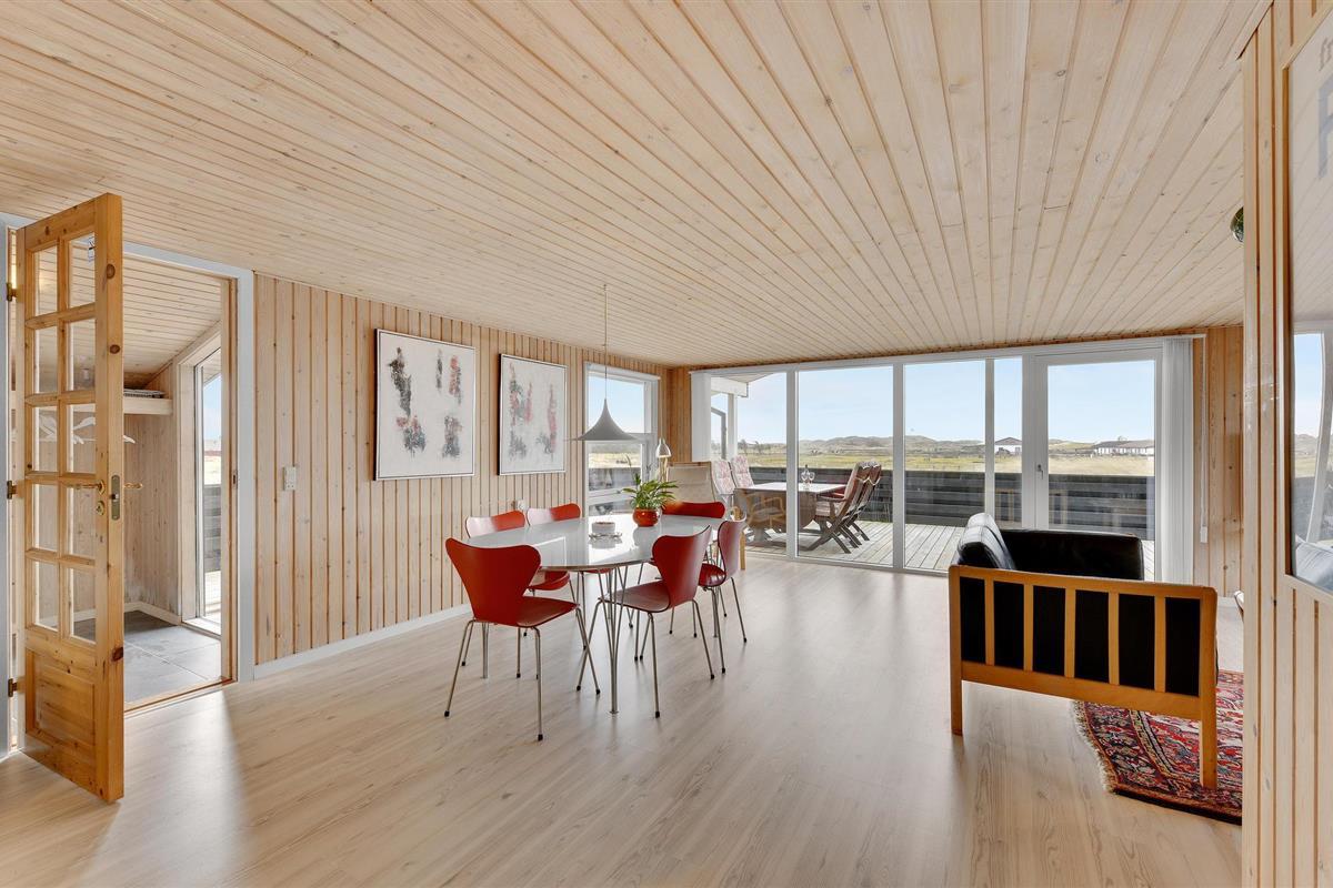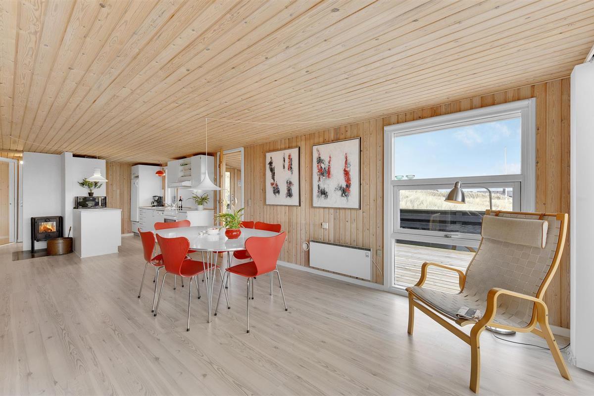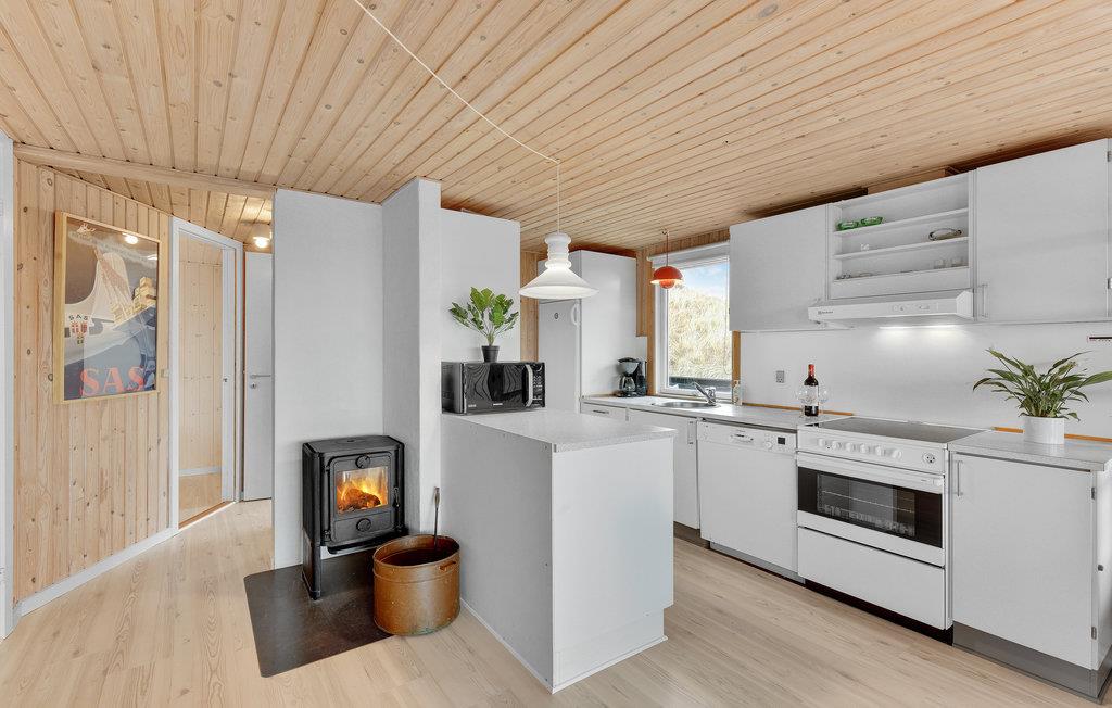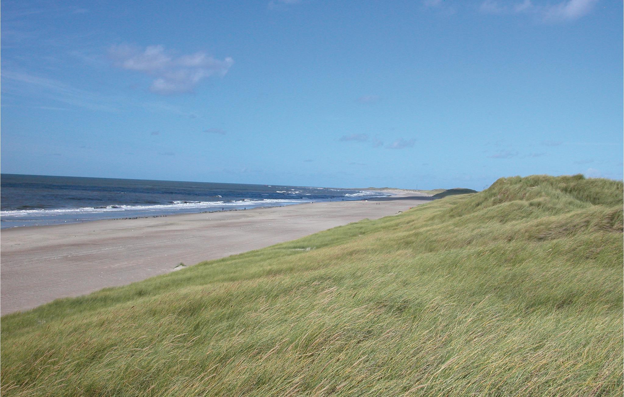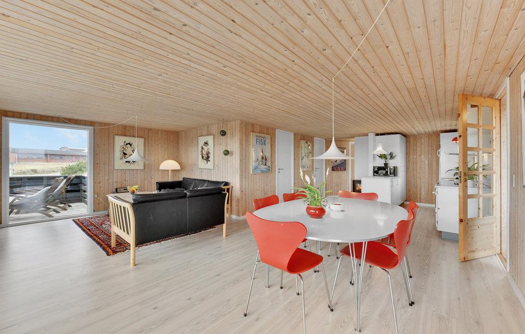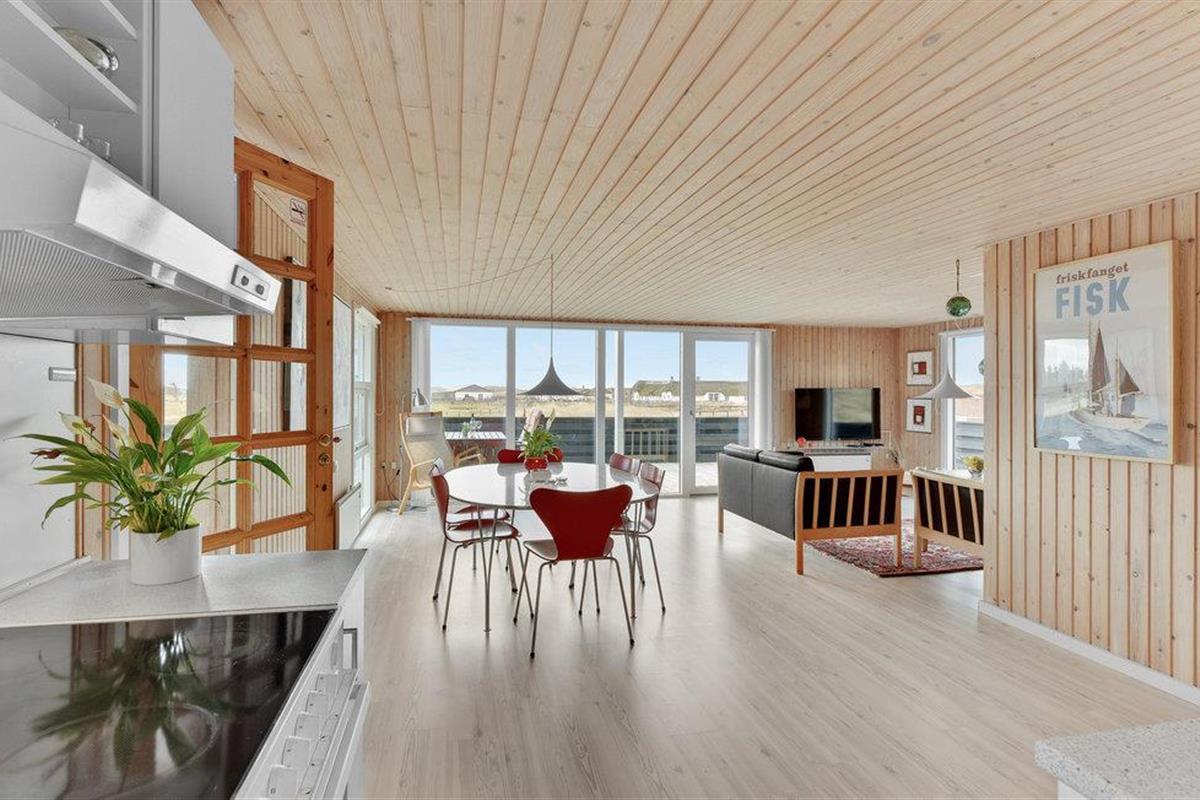 Comfortabel houten vakantiehuis in Hvide Sande met omheind terras en uitzicht op duinen.