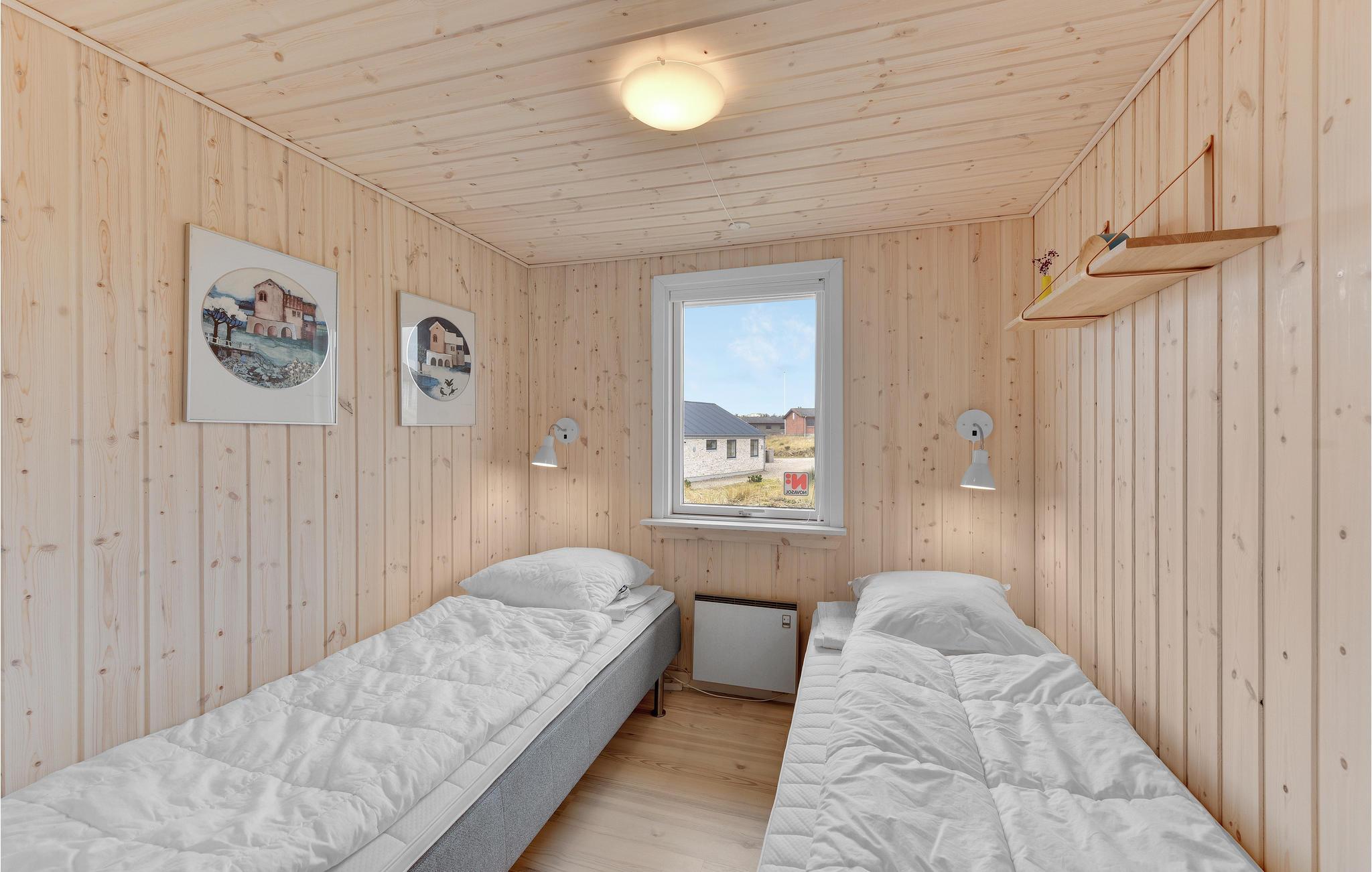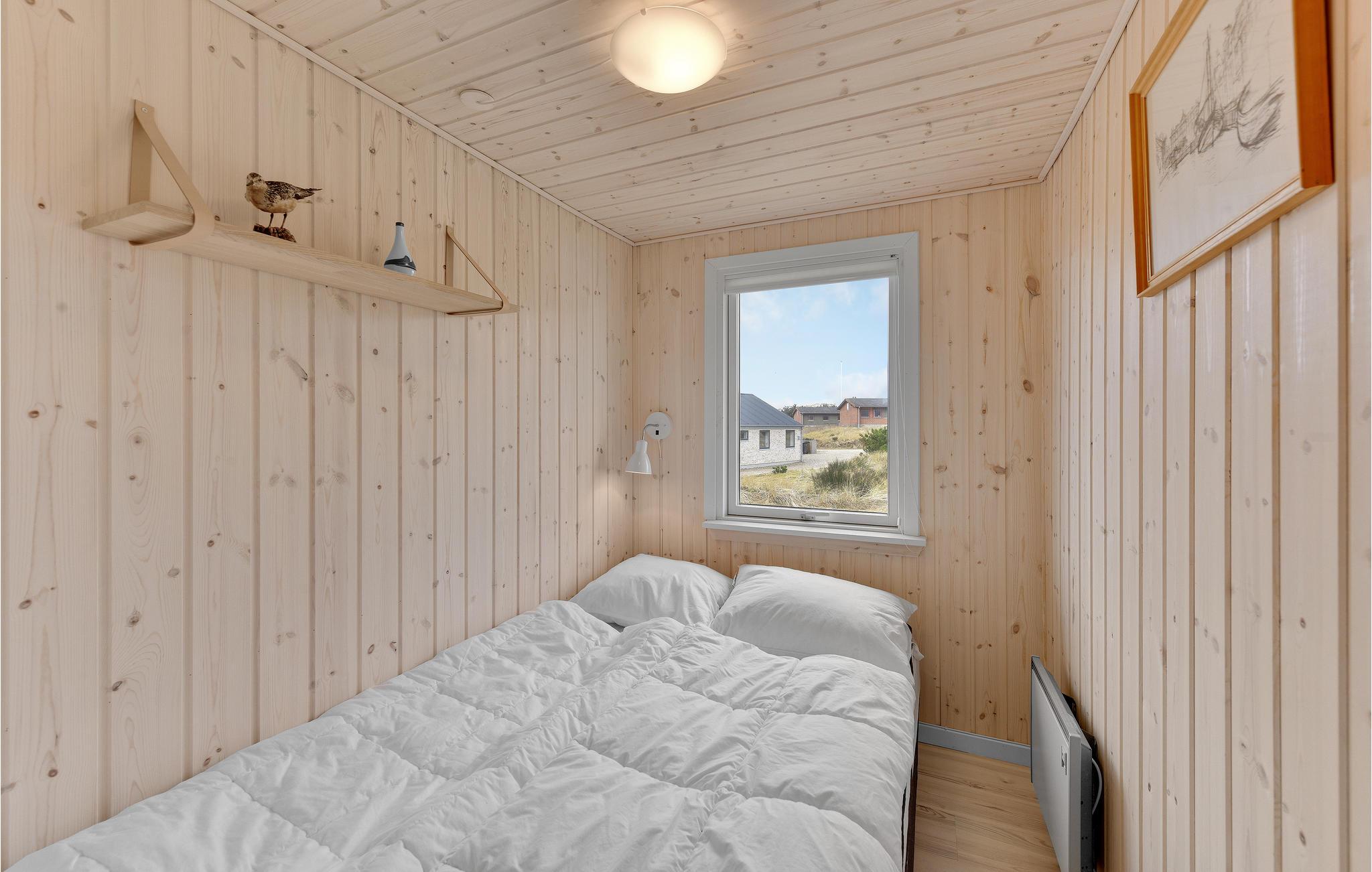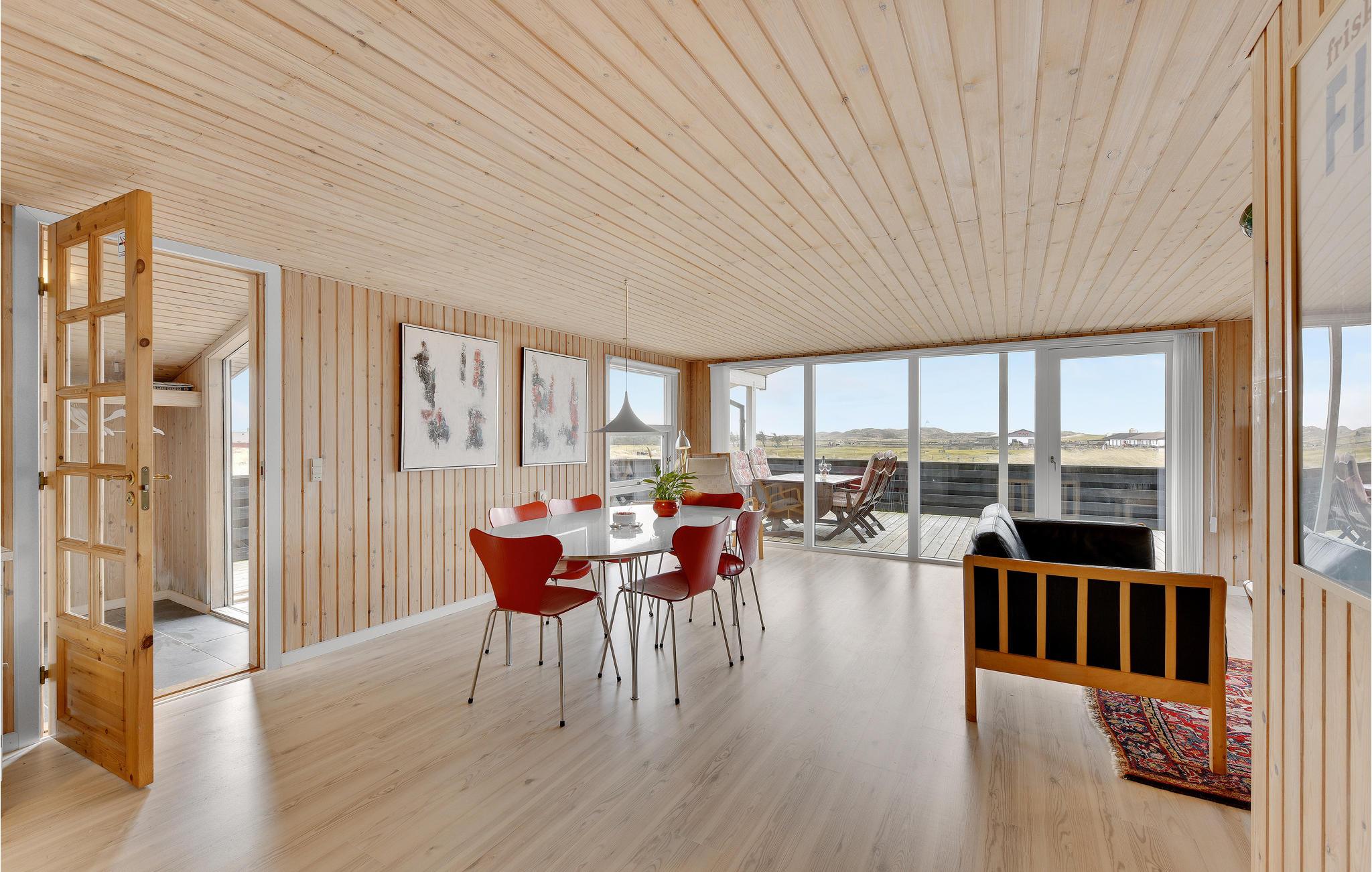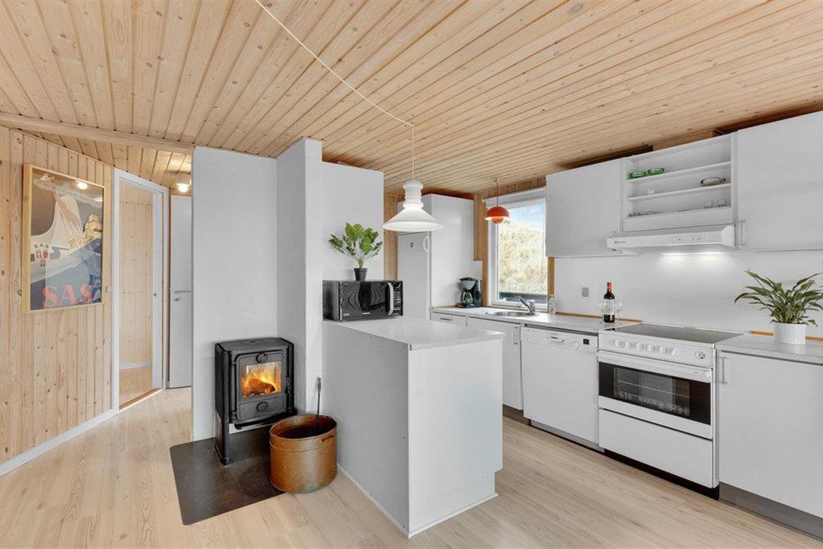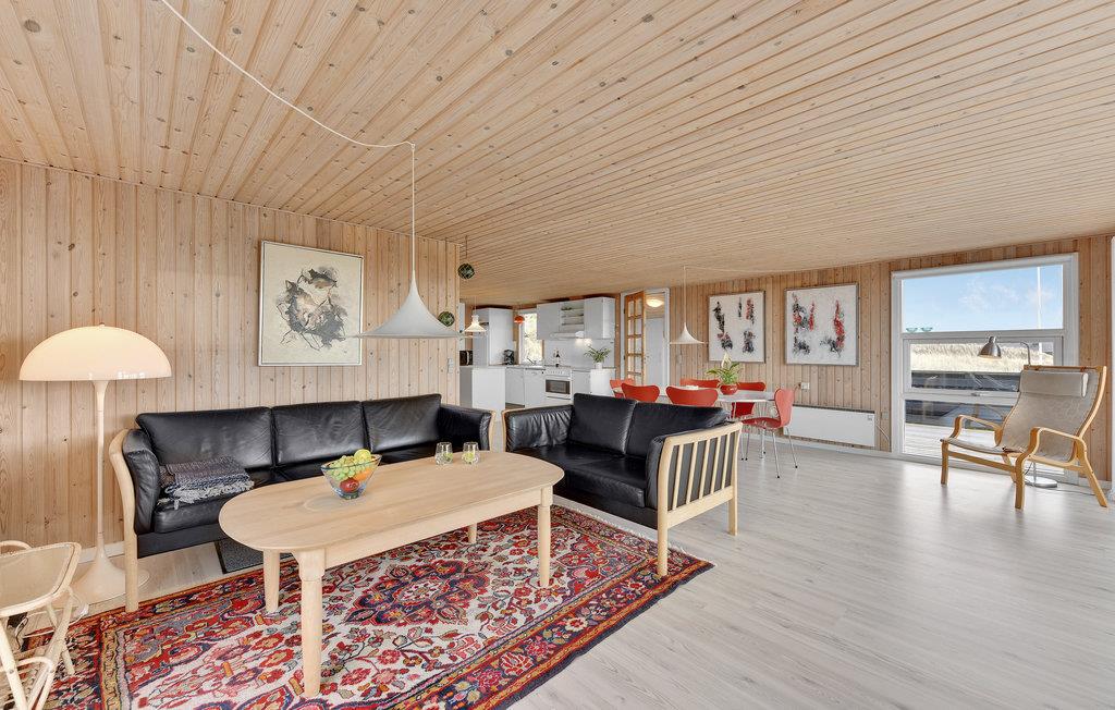 Comfortabel houten vakantiehuis in Hvide Sande met omheind terras en uitzicht op duinen.