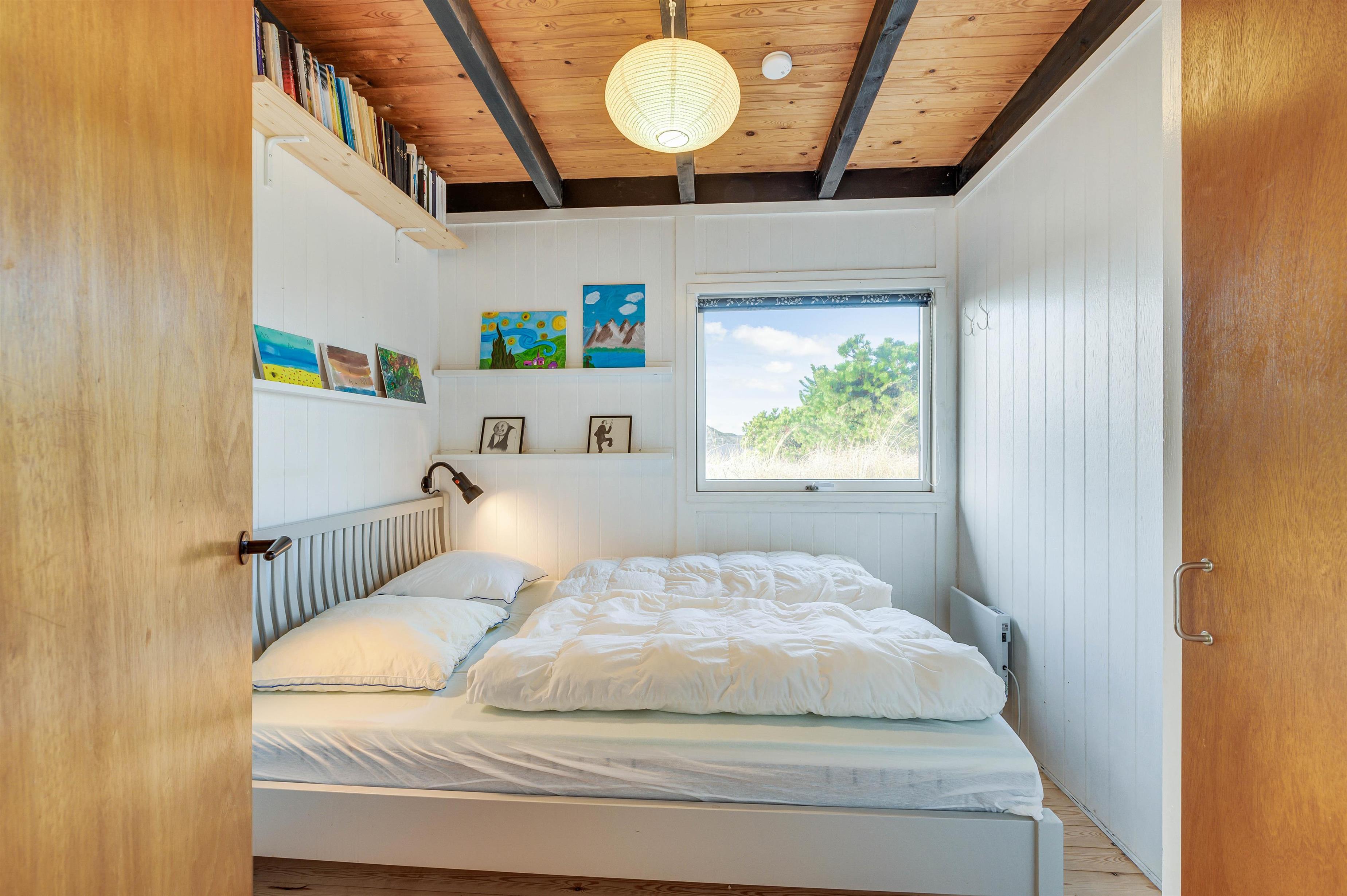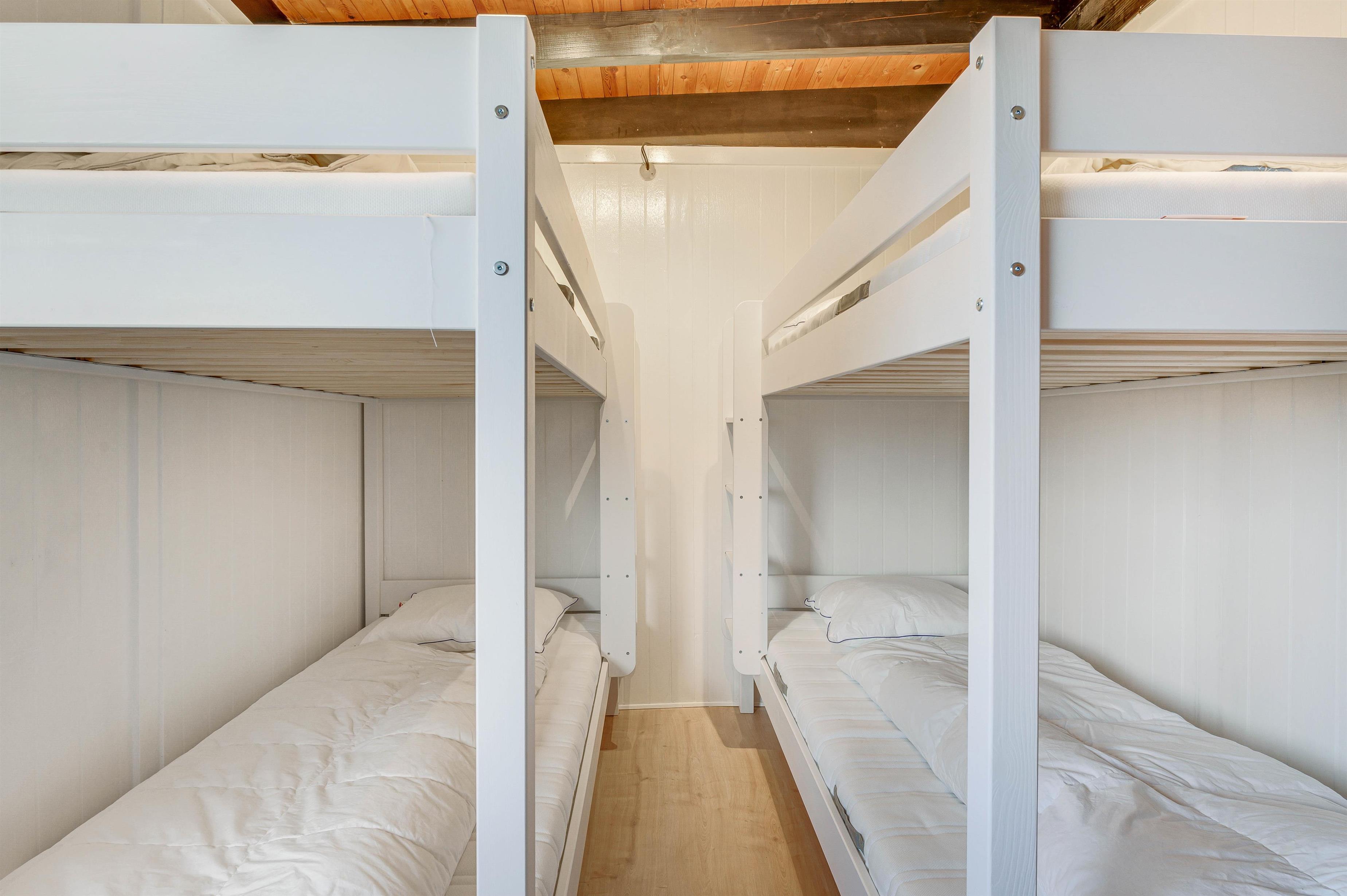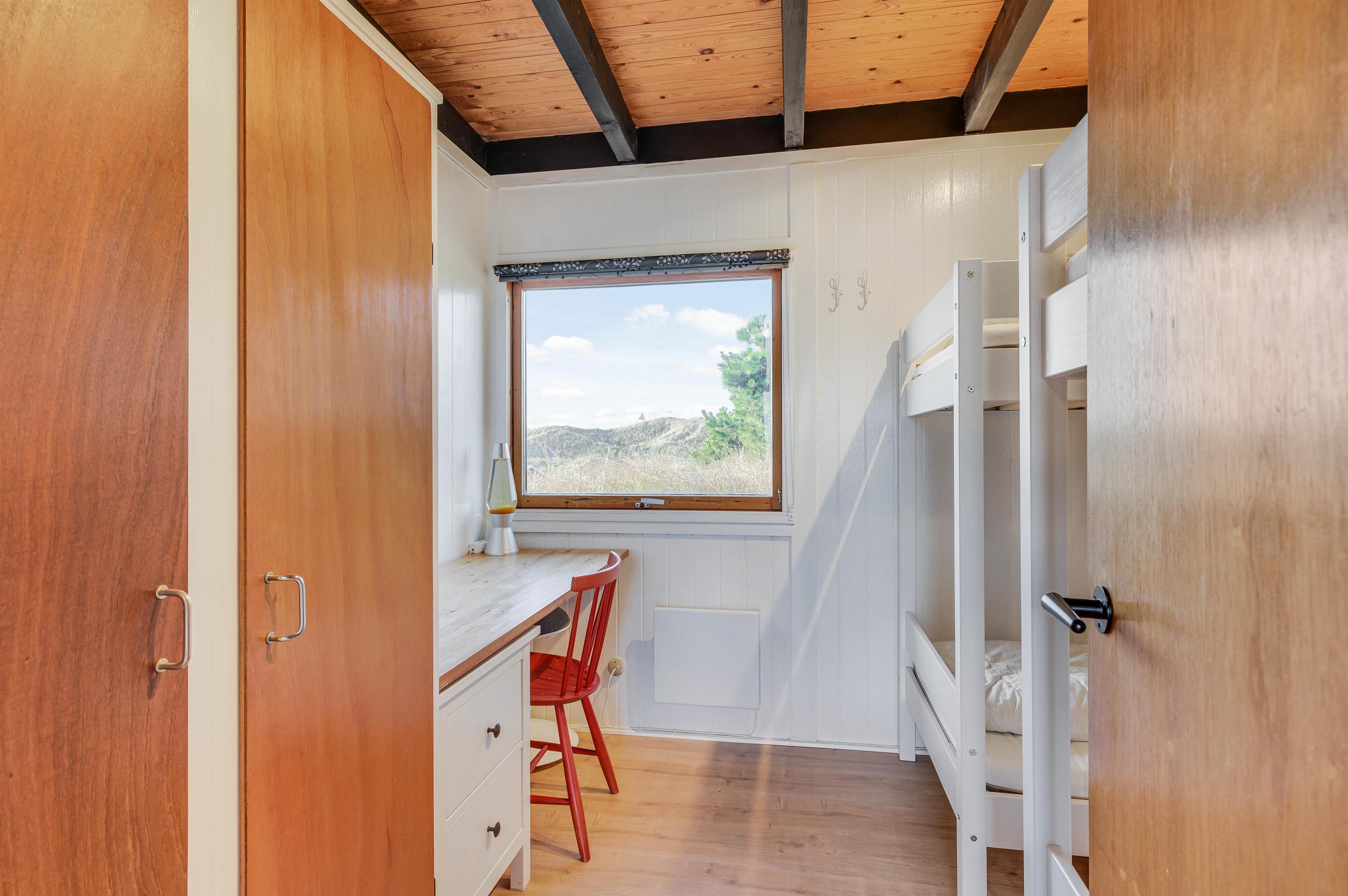 The holiday home is comfortably and family-friendly furnished. There are two bedrooms - one with a comfortable double bed and another with two bunk beds perfect for children. A small desk provides space for drawing and playing.