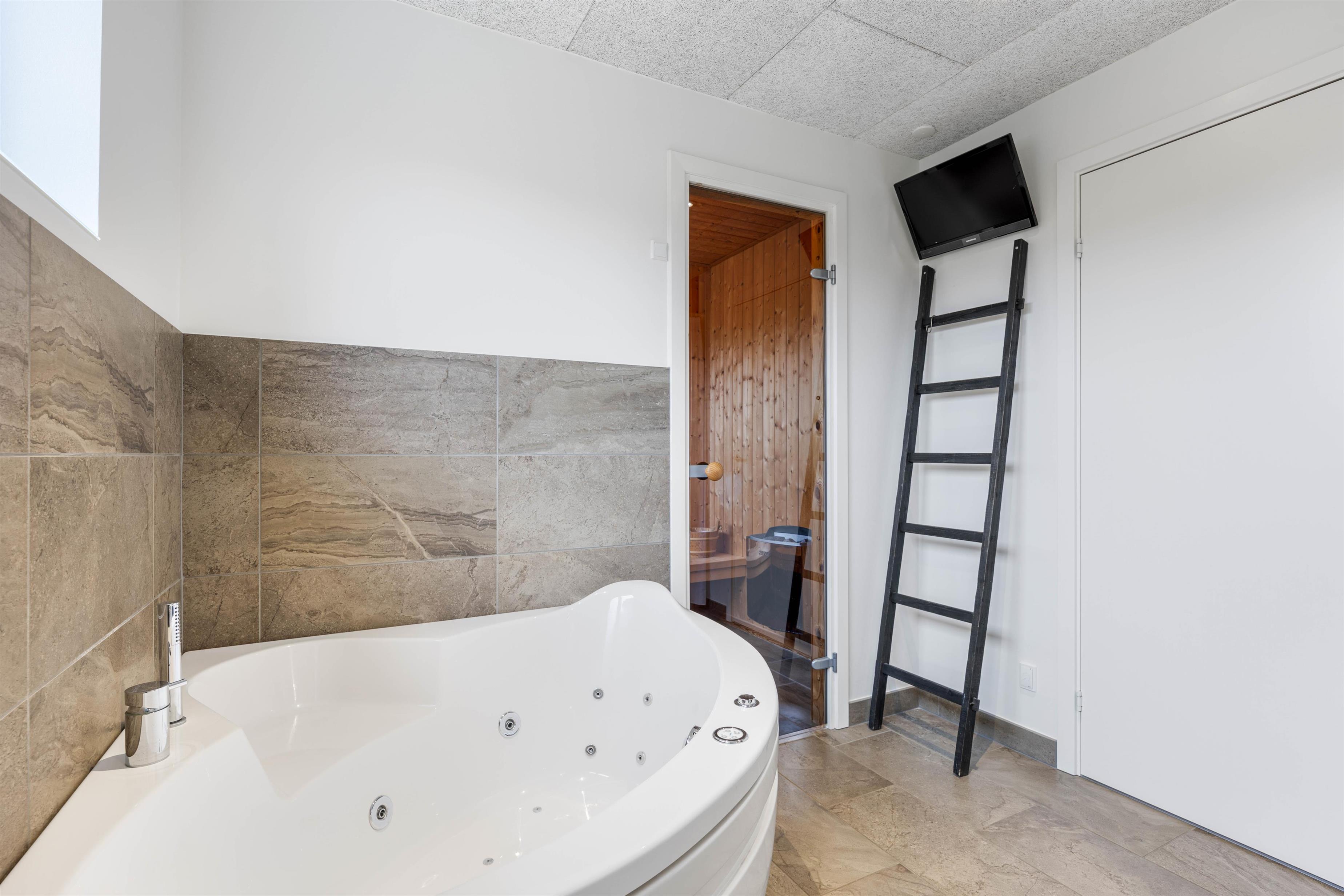This modern holiday home focuses on ensuring you enjoy your much-needed holiday, offering extra wellness facilities. From the largest of the three bathrooms, you have access to your private wellness area with a sauna and hot tub where you can unwind.