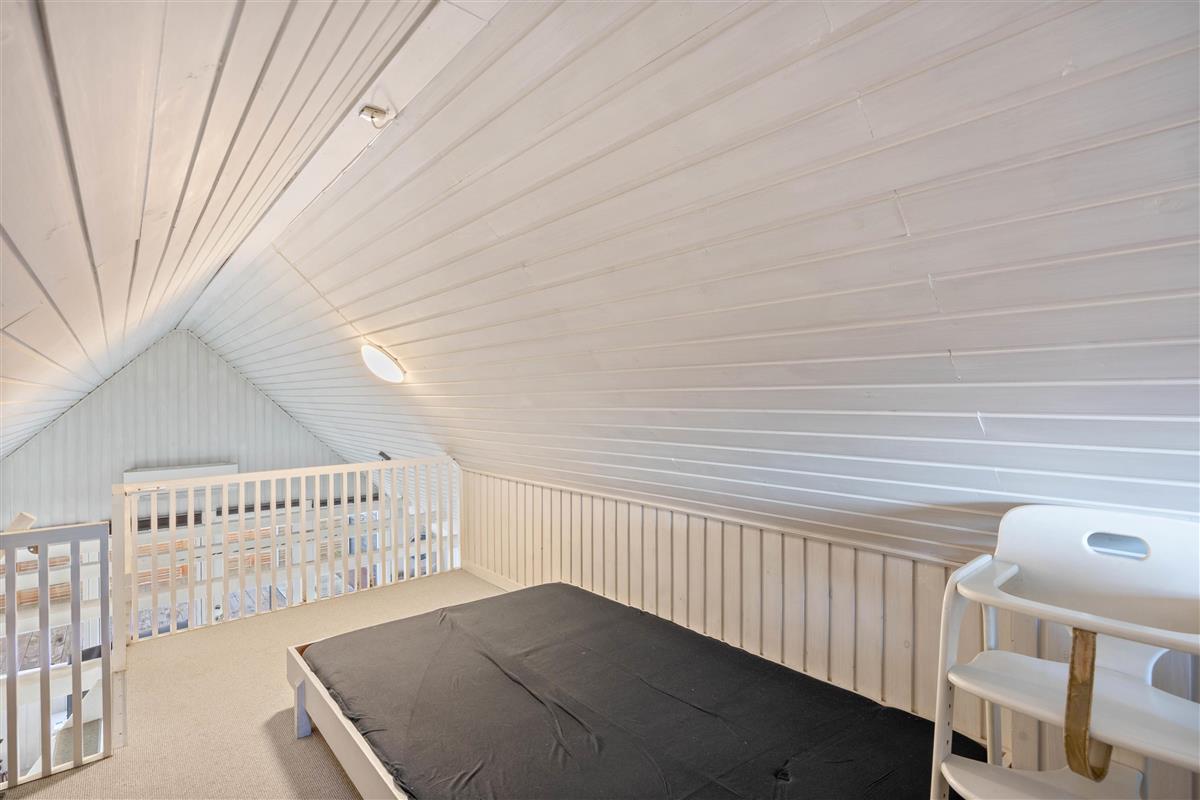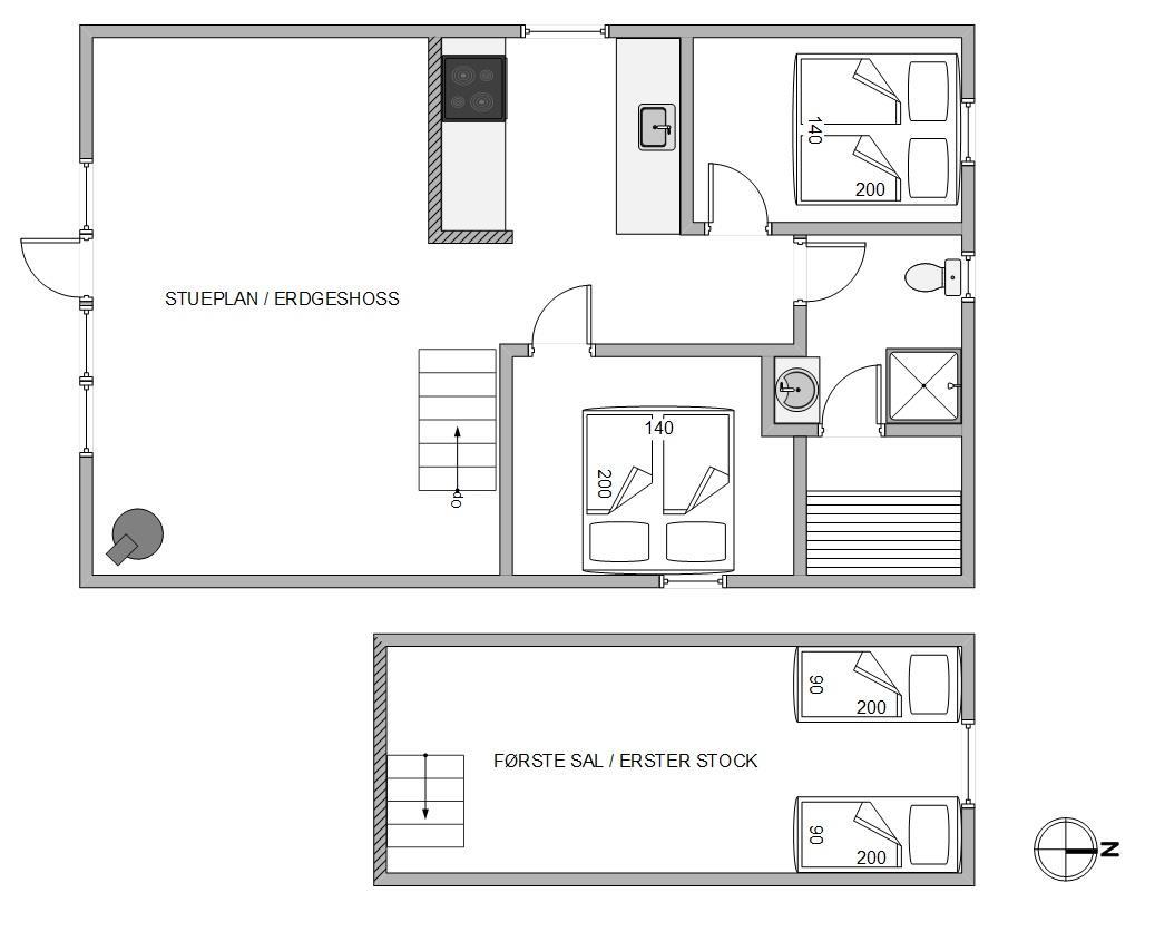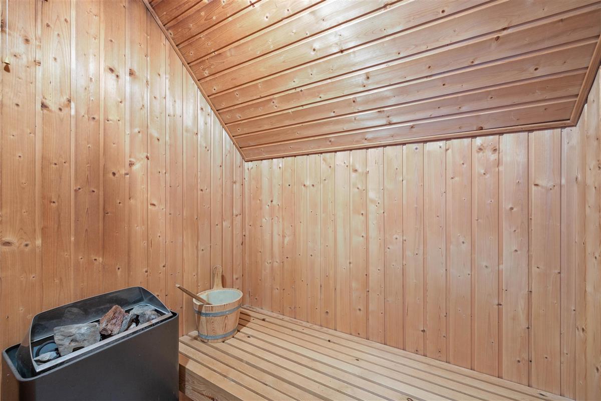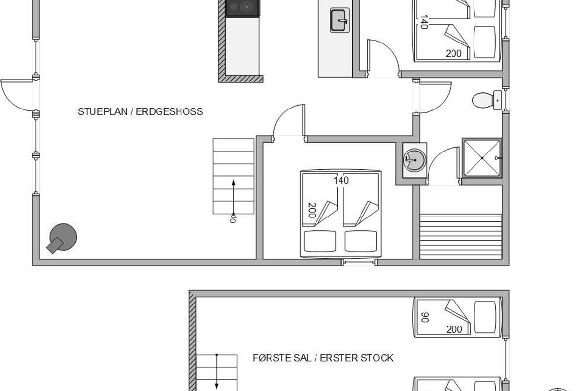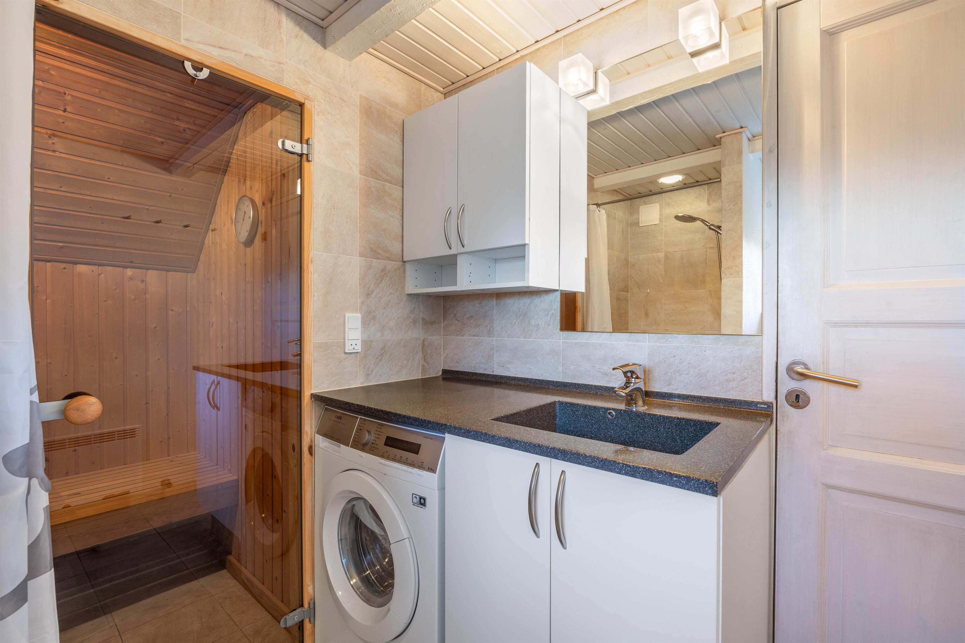 The holiday home has two bedrooms, both with double beds. Additionally, there's a large mezzanine sleeping area with two single beds. The bathroom features underfloor heating, a shower, and a sauna where you can enjoy relaxing wellness moments.