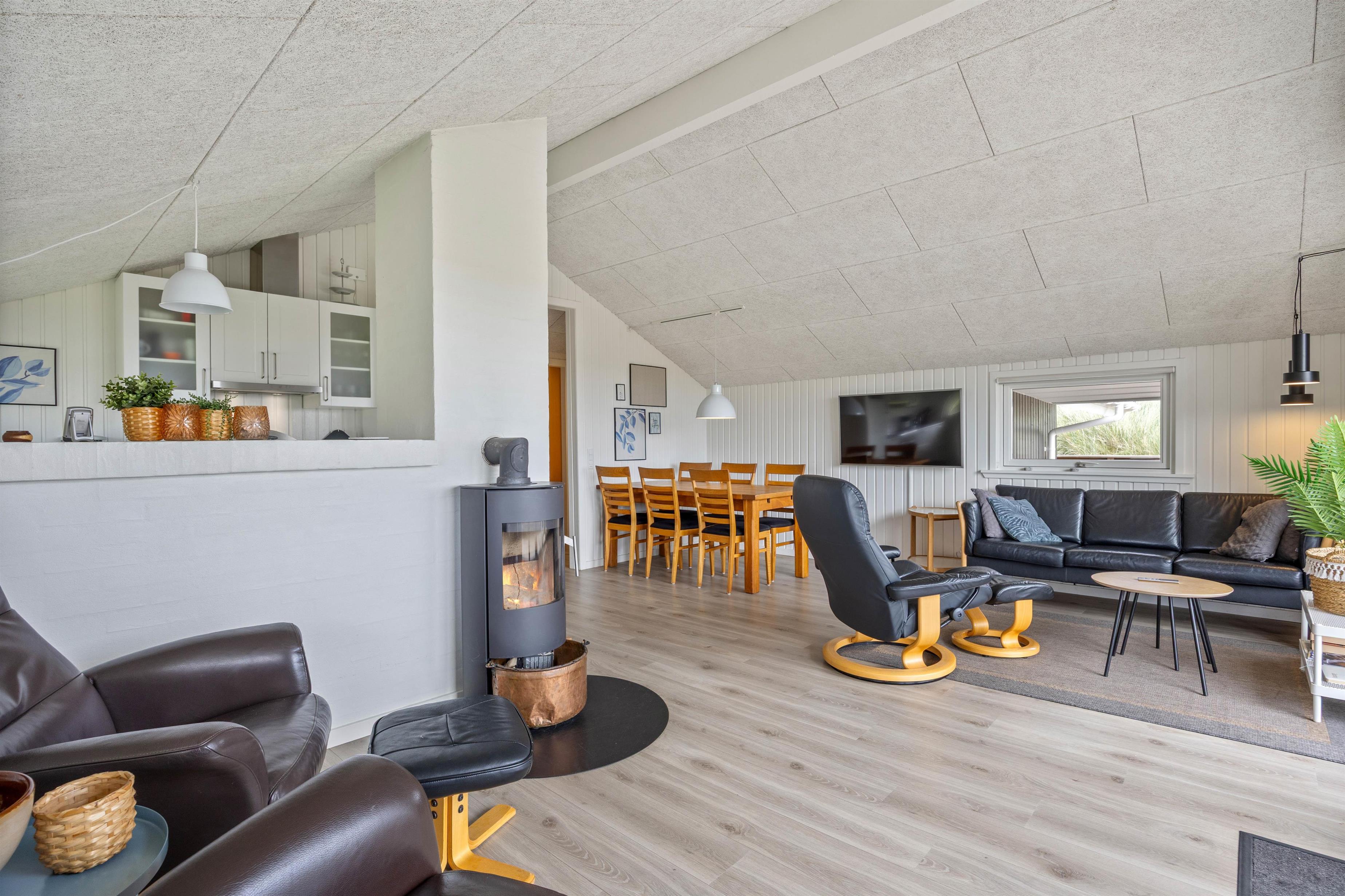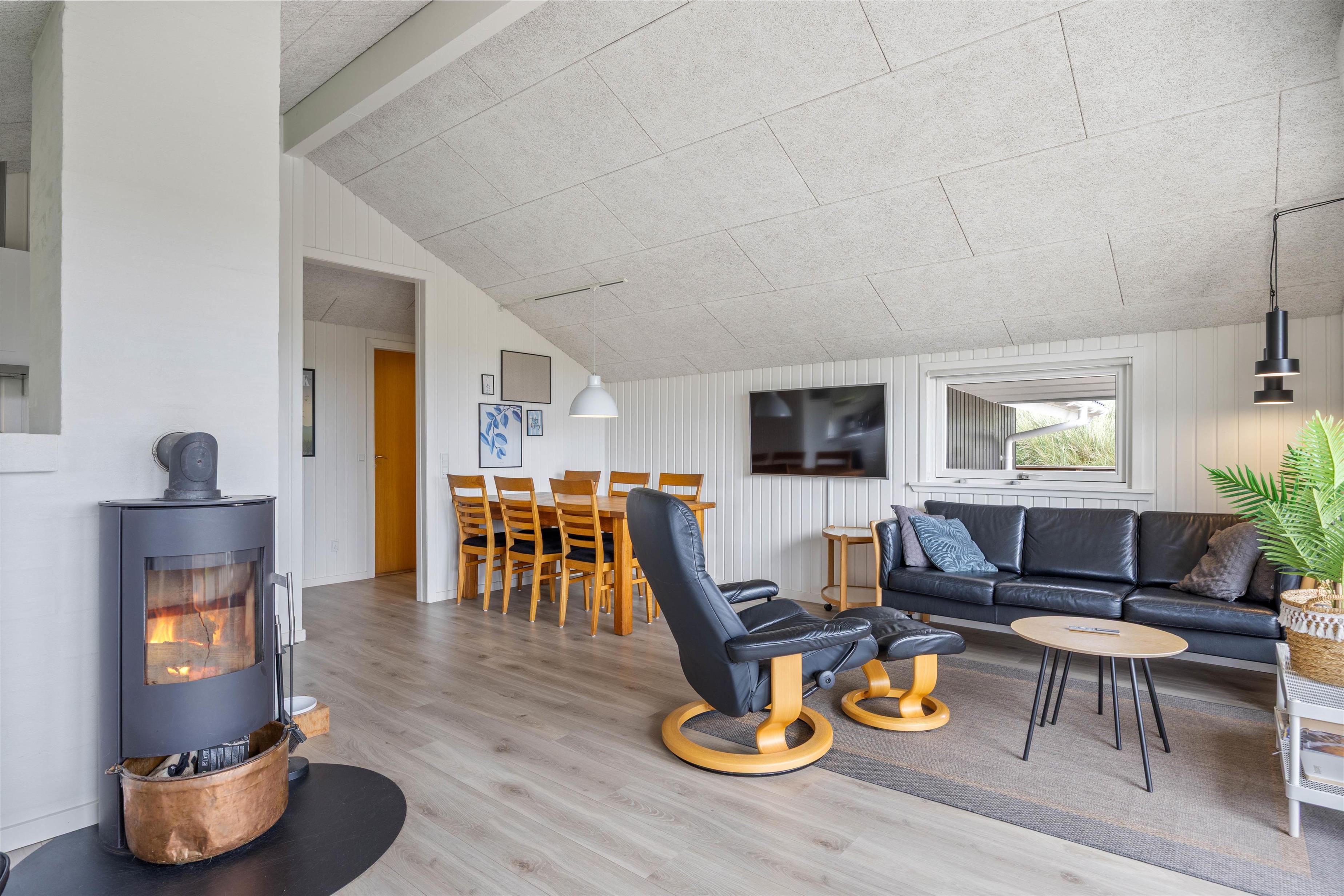 While children draw at the dining table, cooks can prepare meals in the kitchen. The well-equipped kitchen features a dishwasher and microwave for when you need quick meal solutions. From the sofa, you can stream your favourite films while the wood-burning stove crackles away on cooler evenings. Besides the wood-burner, there's also an energy-efficient air-source heat pump.