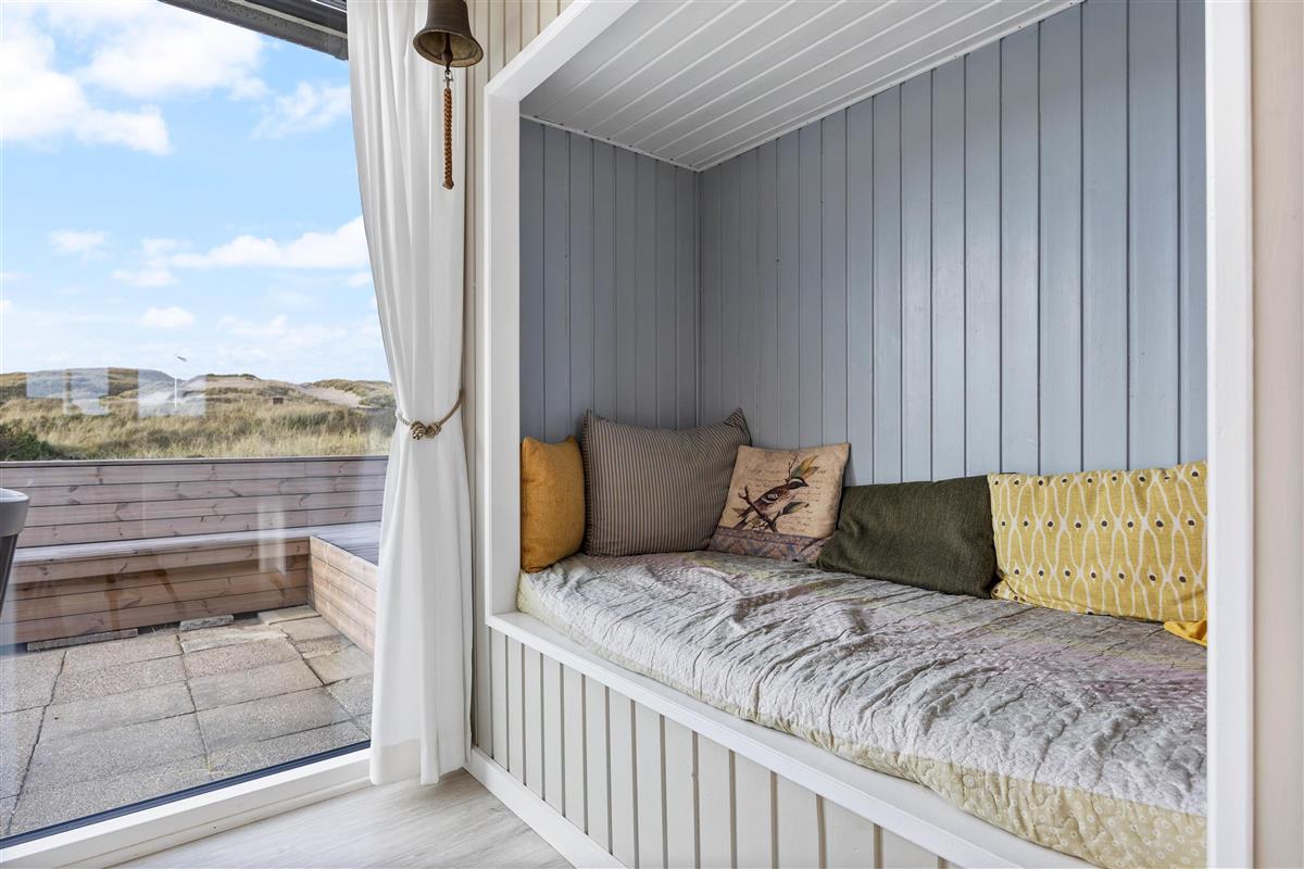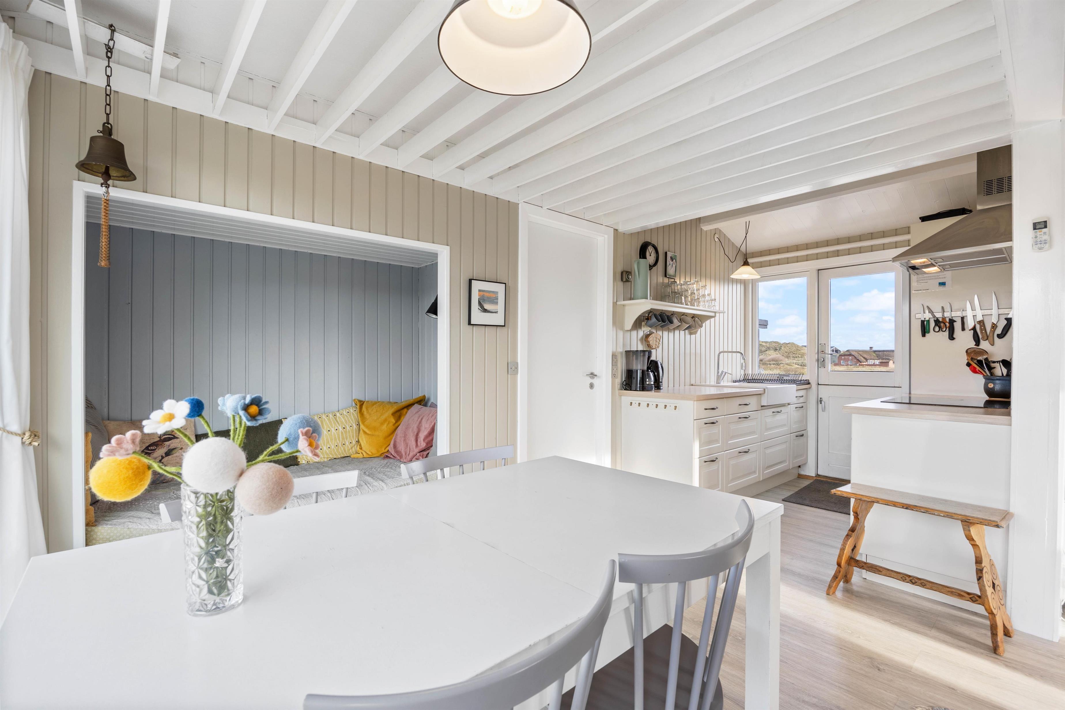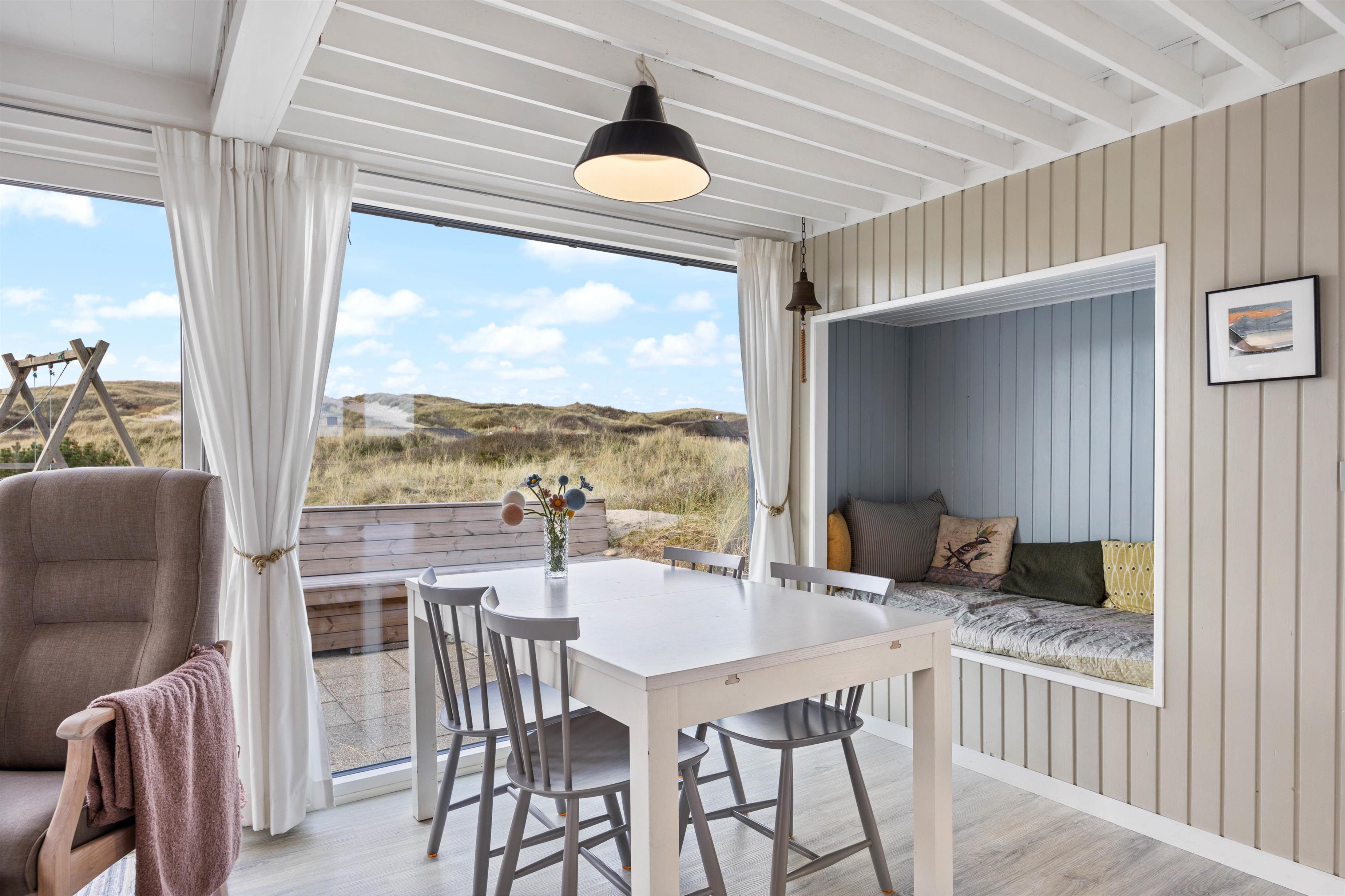 A particularly cosy feature is the sleeping alcove in the living area, offering magnificent panoramic views across the surrounding dune landscape. The well-equipped kitchen with adjacent dining area opens onto the living space. Here you can cook together and end the day with board games.