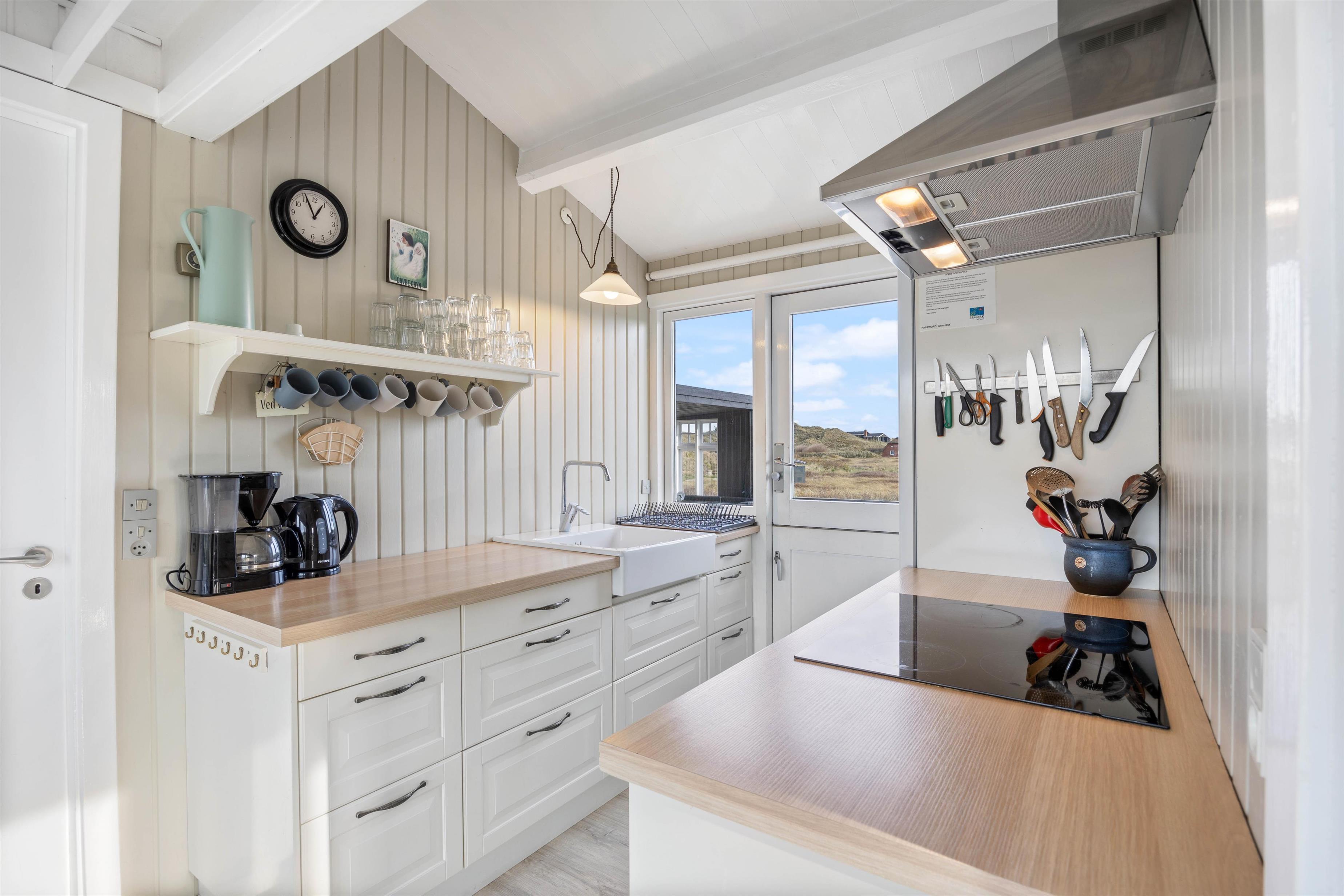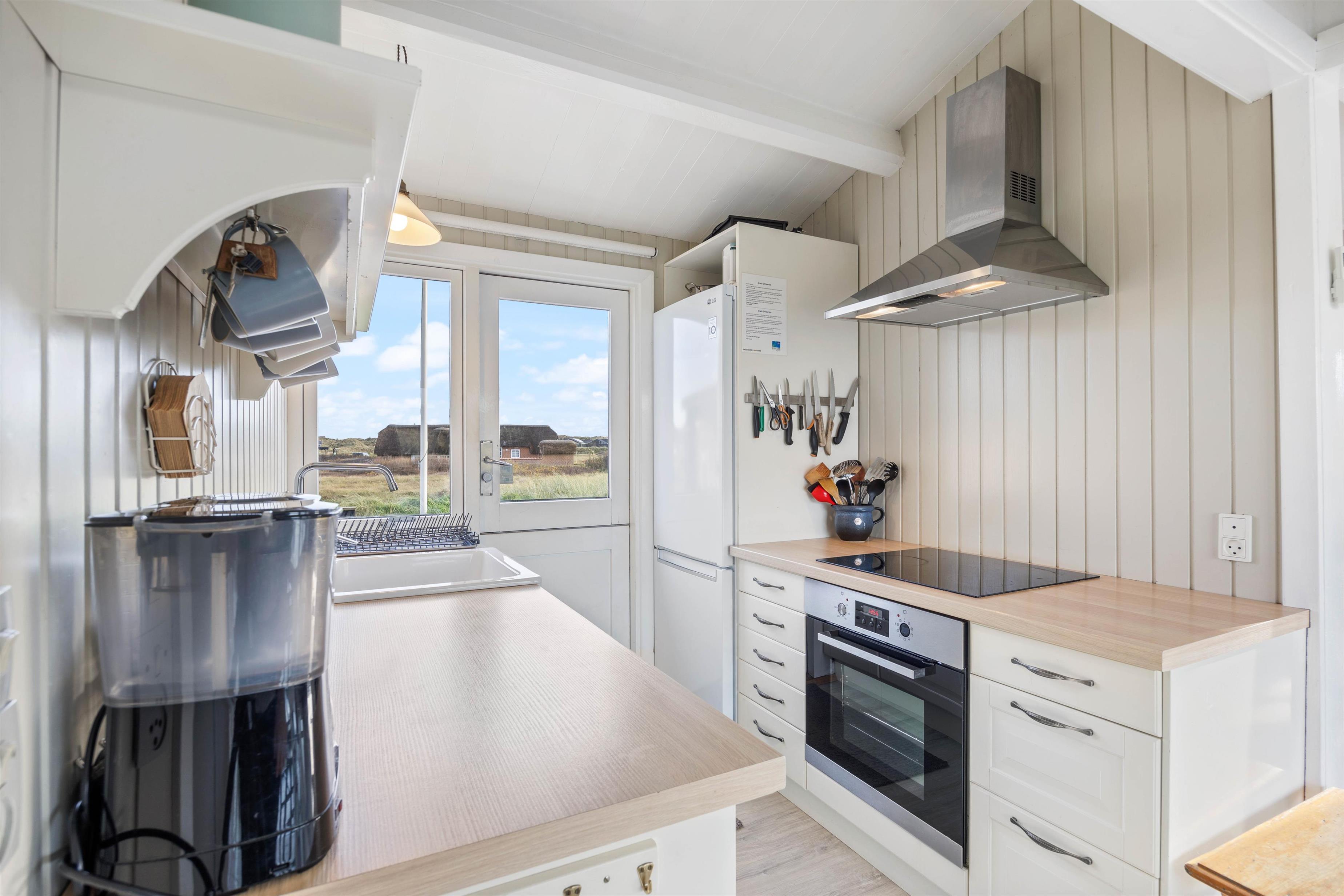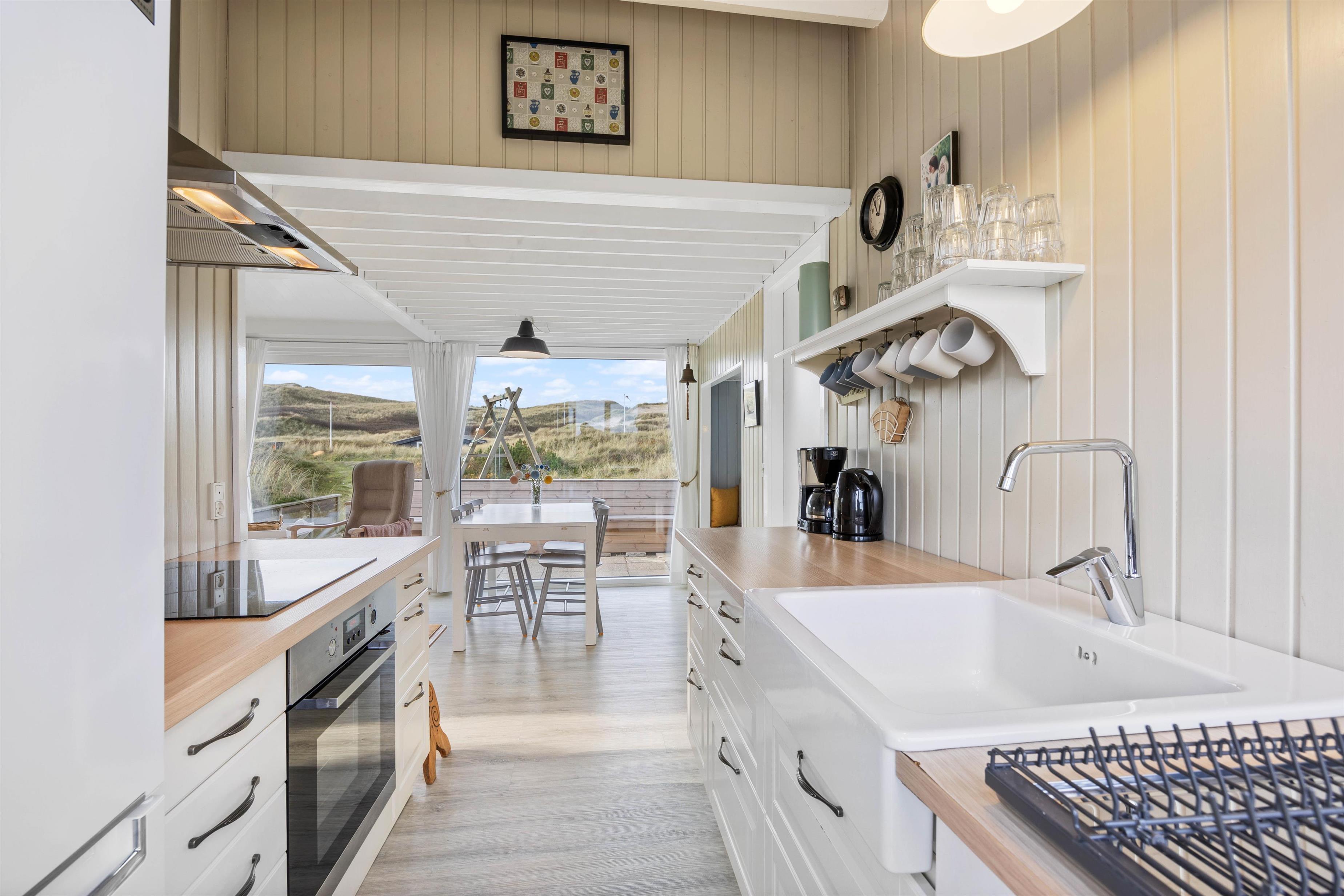 A particularly cosy feature is the sleeping alcove in the living area, offering magnificent panoramic views across the surrounding dune landscape. The well-equipped kitchen with adjacent dining area opens onto the living space. Here you can cook together and end the day with board games.