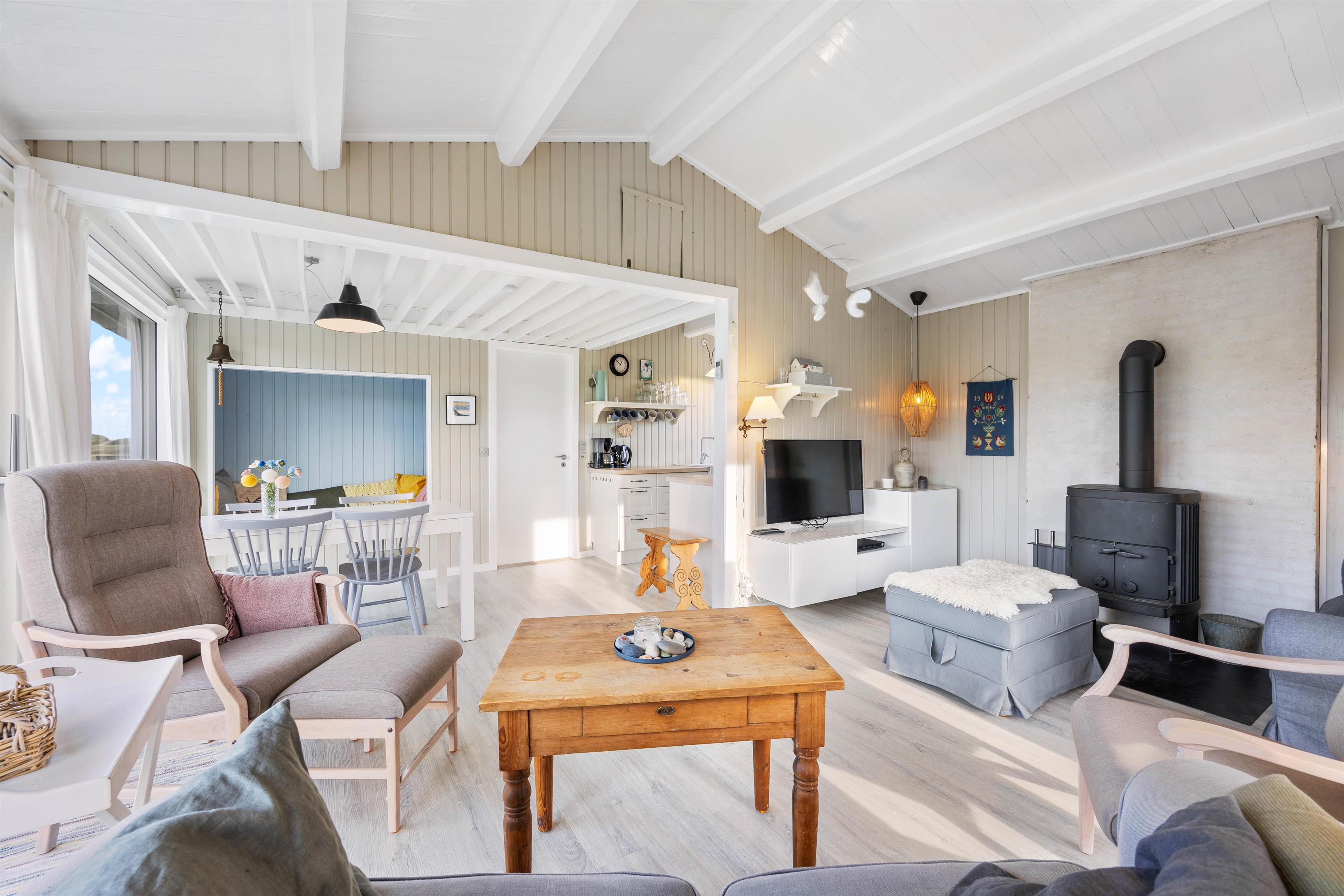 Your holiday home exudes cosiness and holiday atmosphere. Curl up on one of the sofas in the spacious living area to watch DVDs or television. The crackling wood in the wood-burning stove adds extra cosiness, whilst an energy-efficient heat pump is also available for heating.