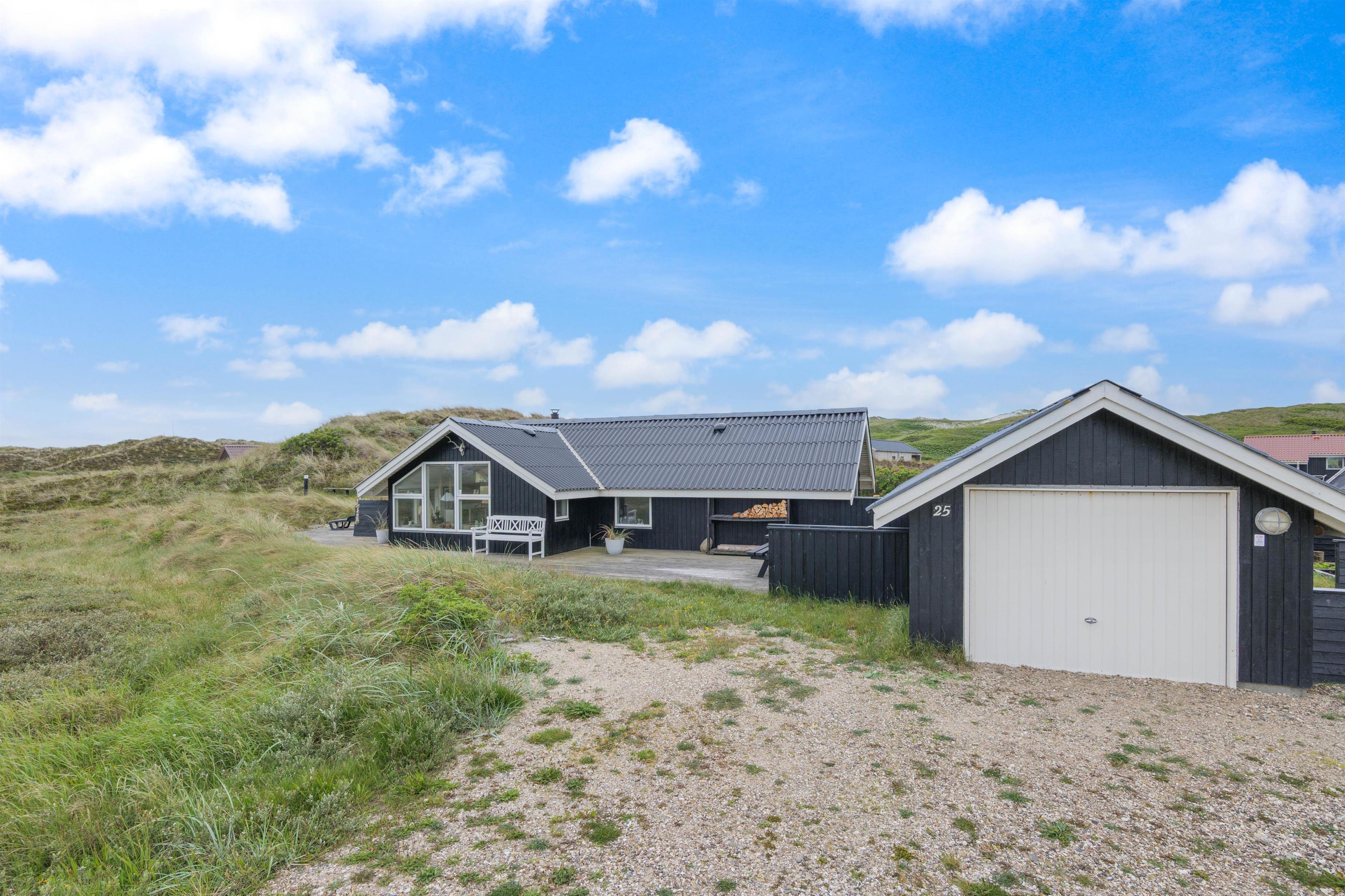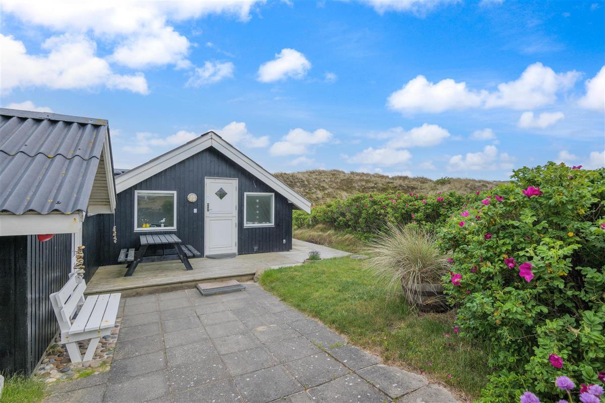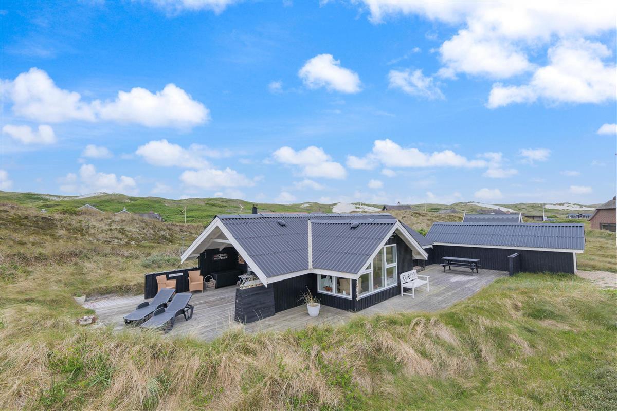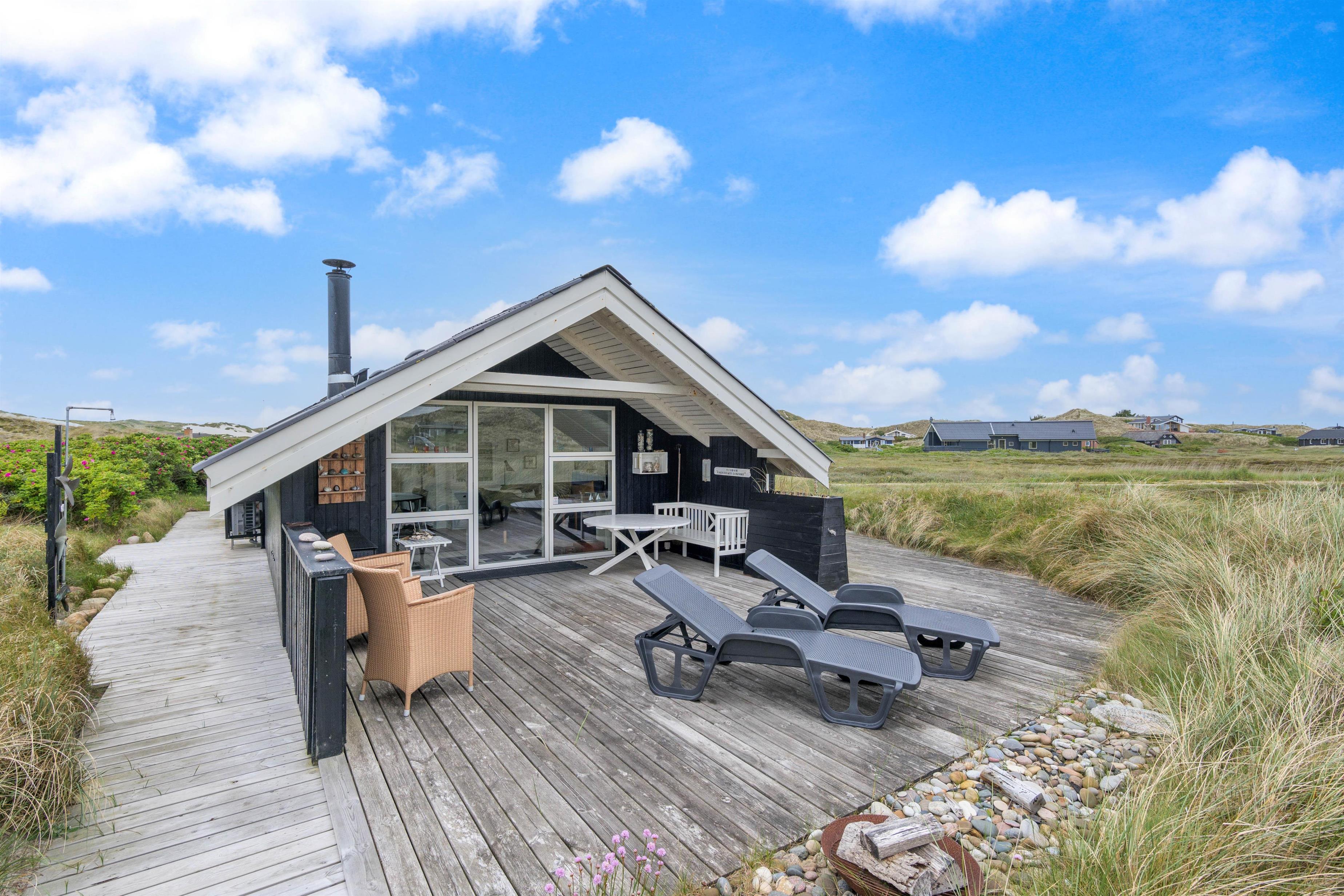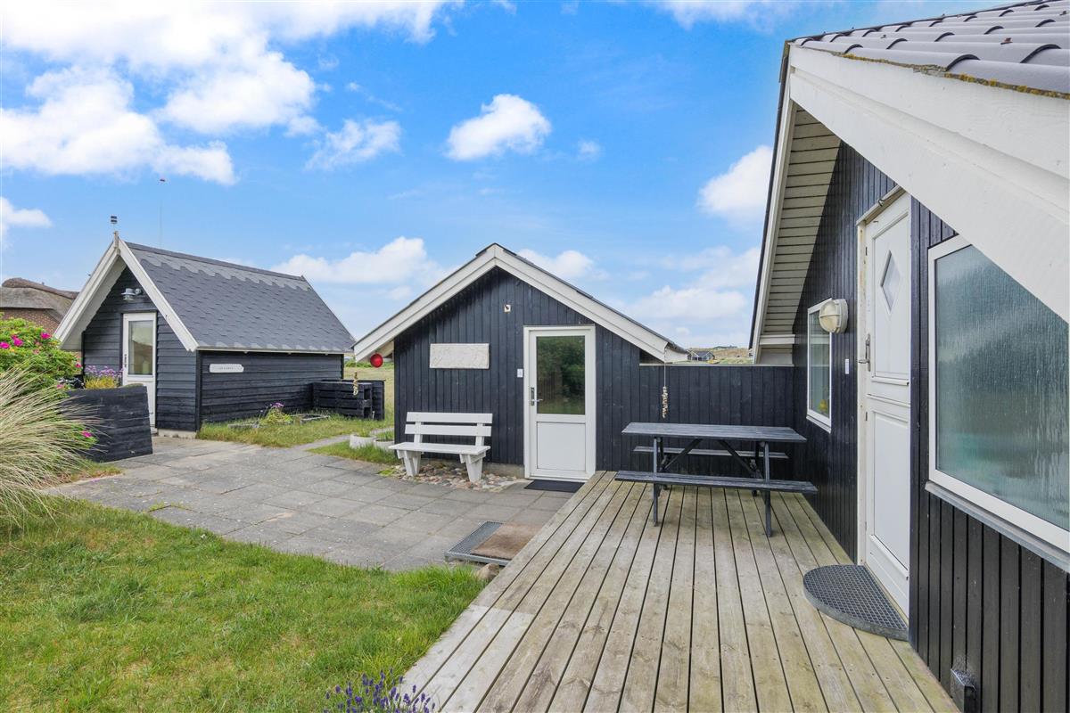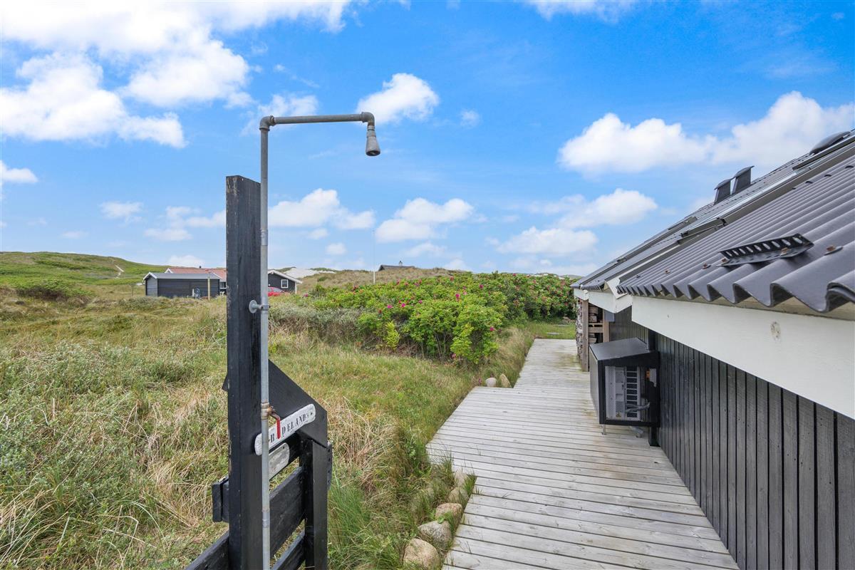 The spacious, sheltered and partially covered terrace is perfect for barbecues or sunbathing. The natural grounds include a shed and an outdoor shower (available April to November). The Danish west coast is just 550 metres away, as the holiday home sits in the second row behind the dunes.