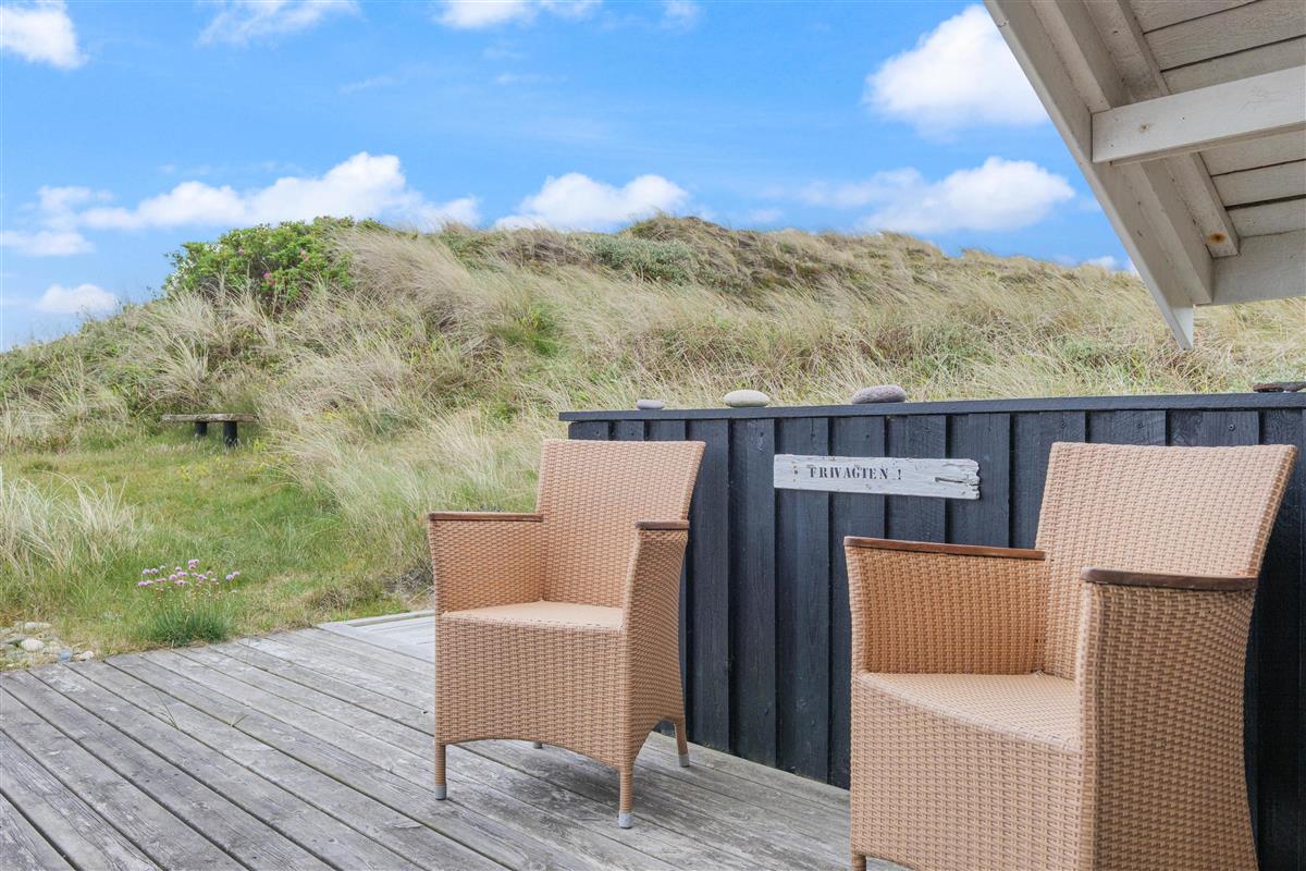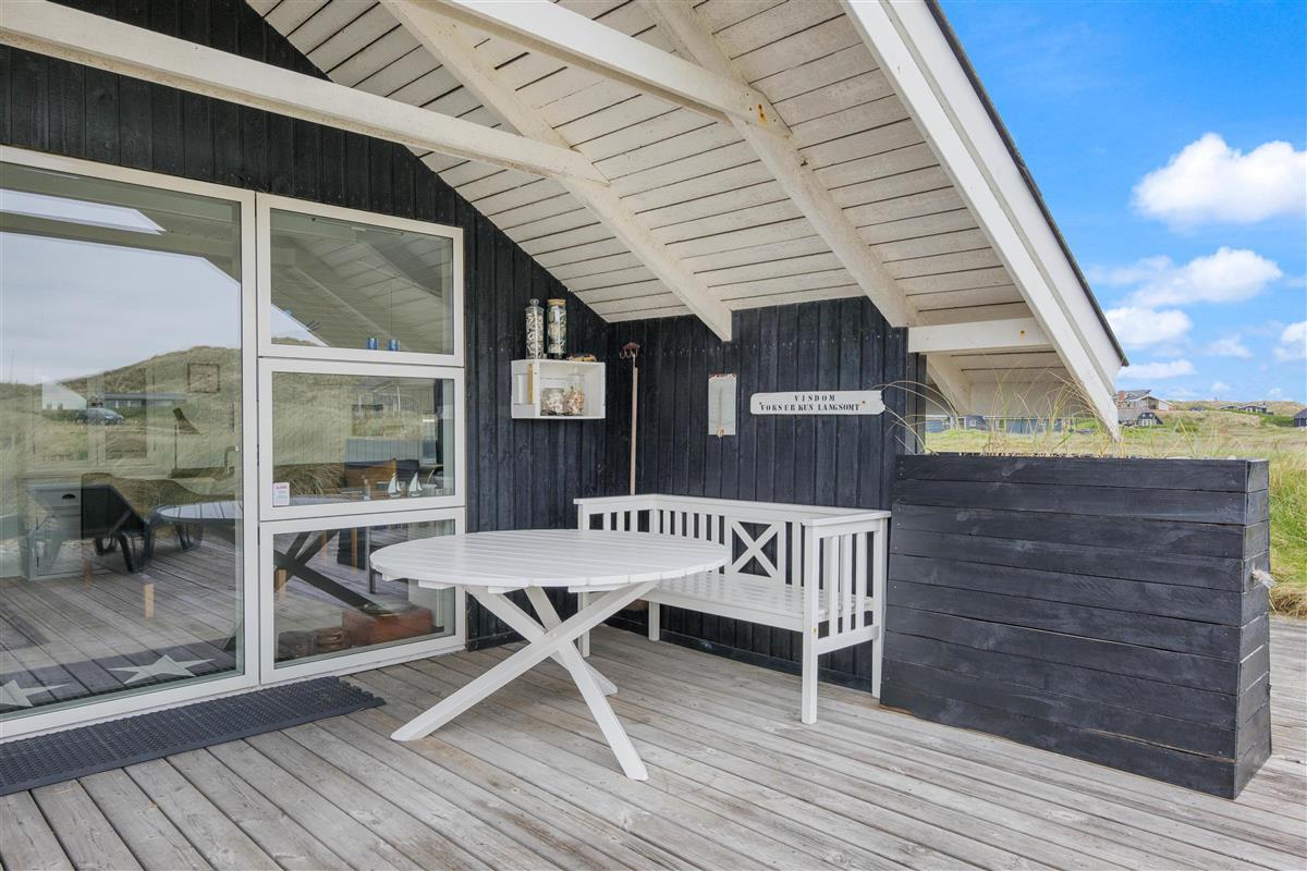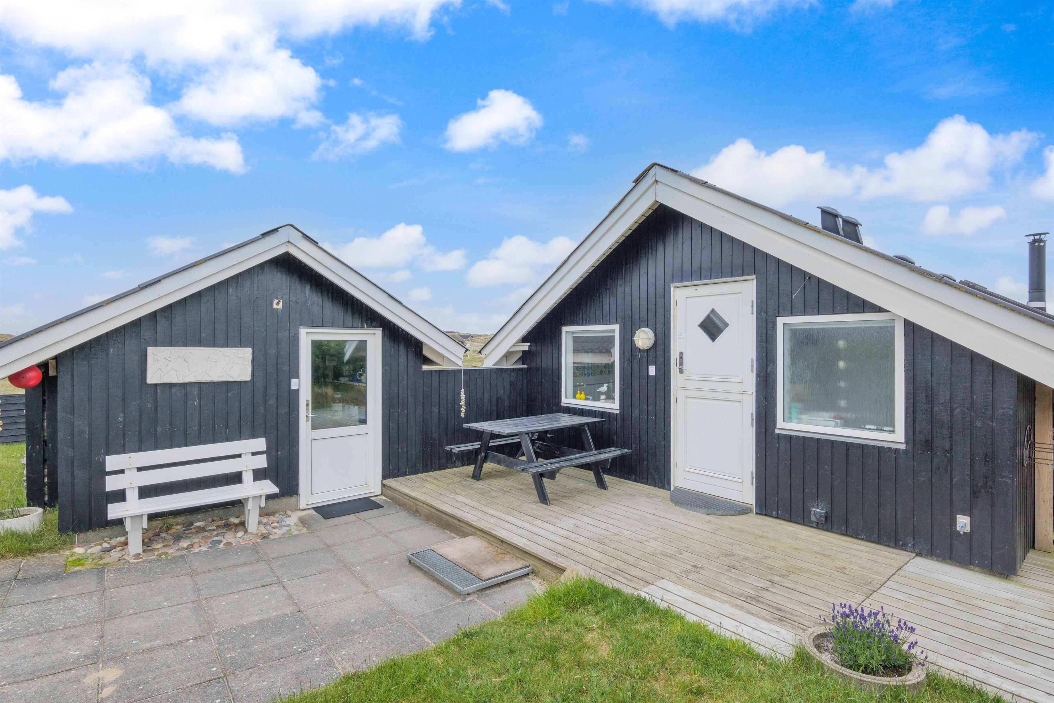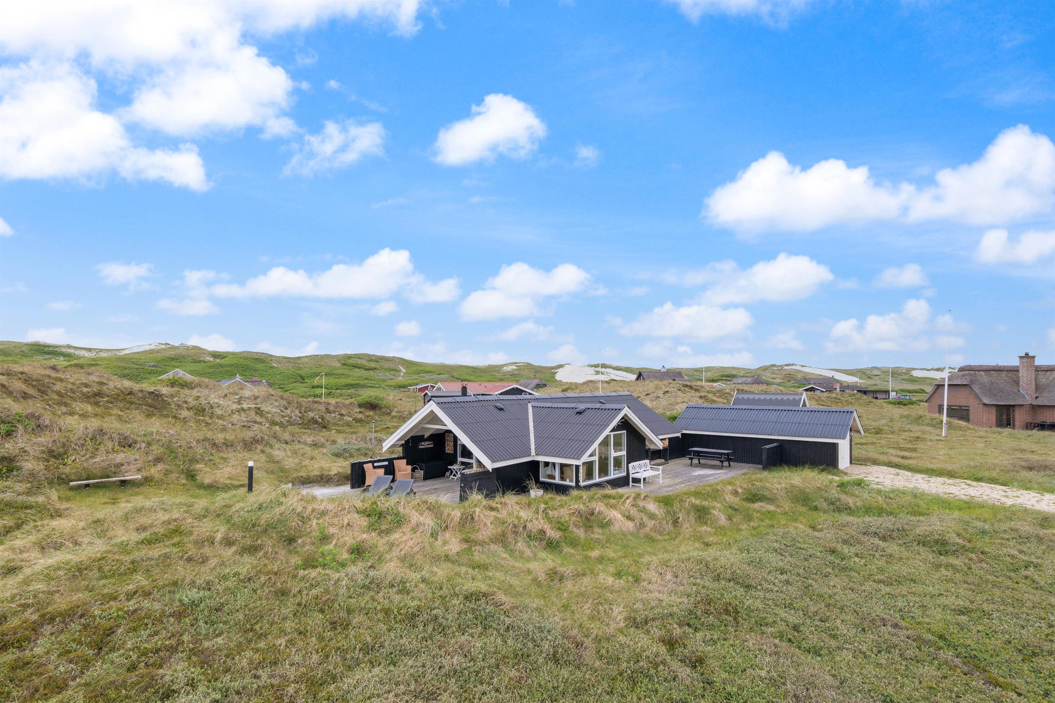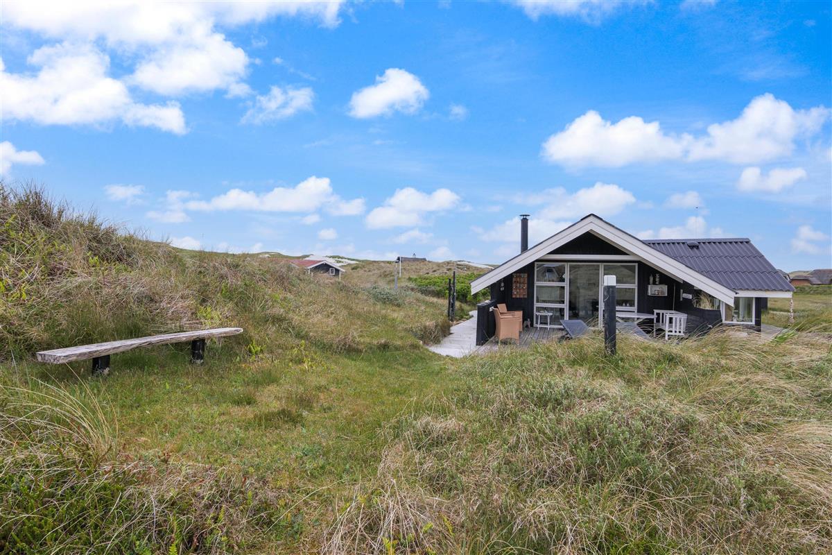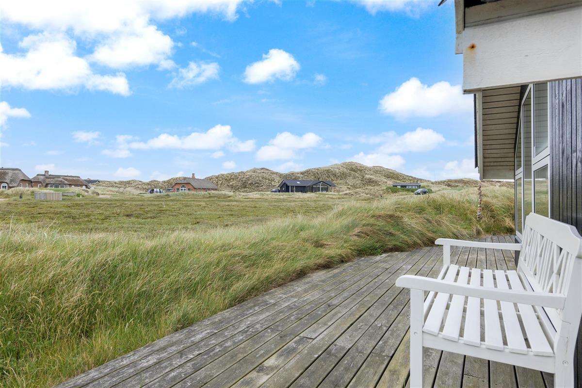 The spacious, sheltered and partially covered terrace is perfect for barbecues or sunbathing. The natural grounds include a shed and an outdoor shower (available April to November). The Danish west coast is just 550 metres away, as the holiday home sits in the second row behind the dunes.