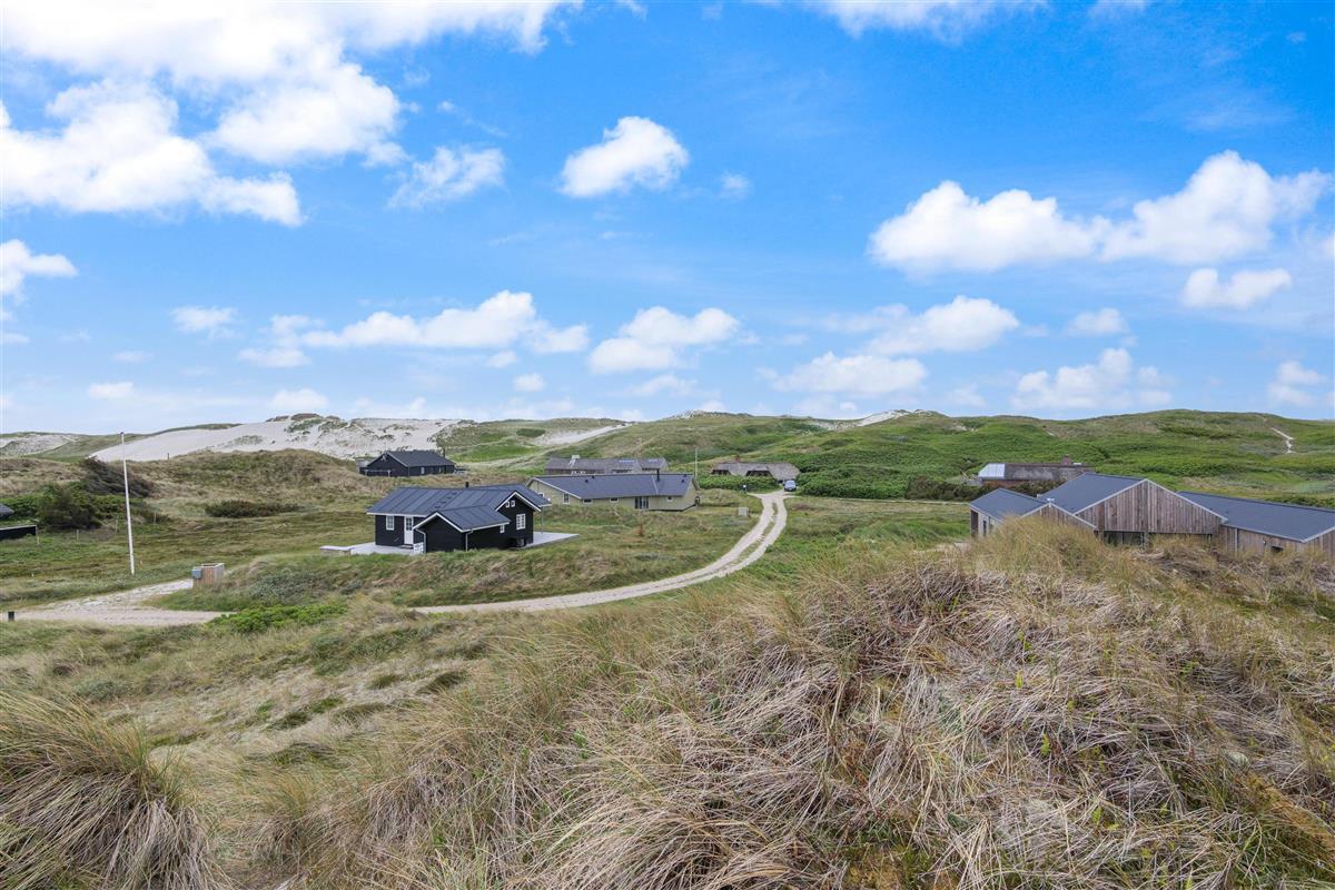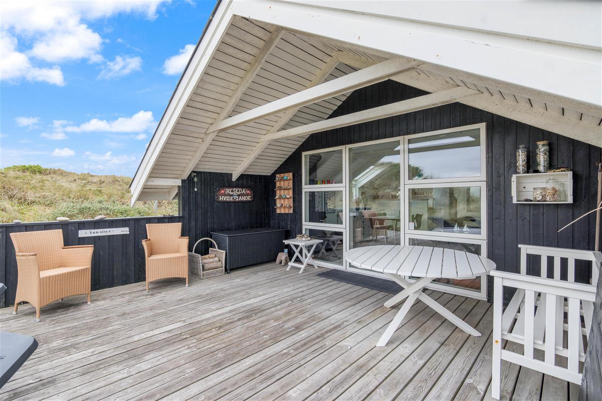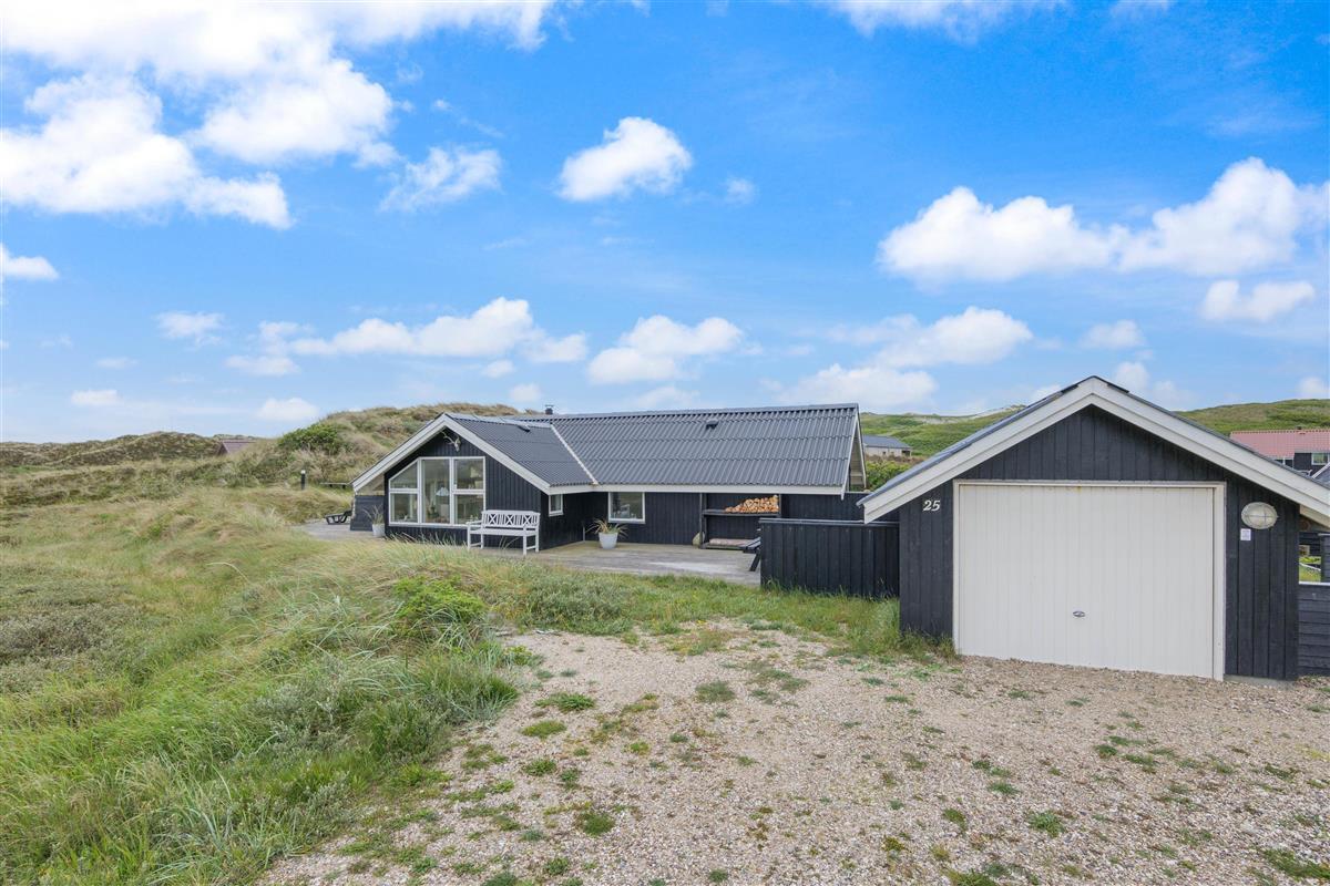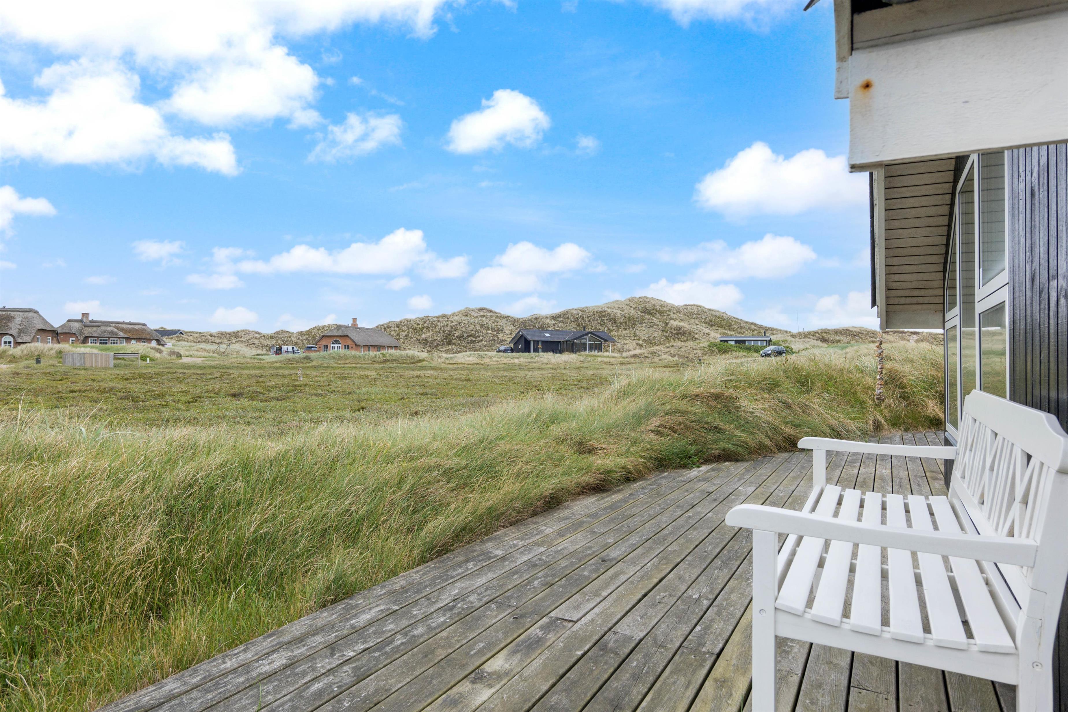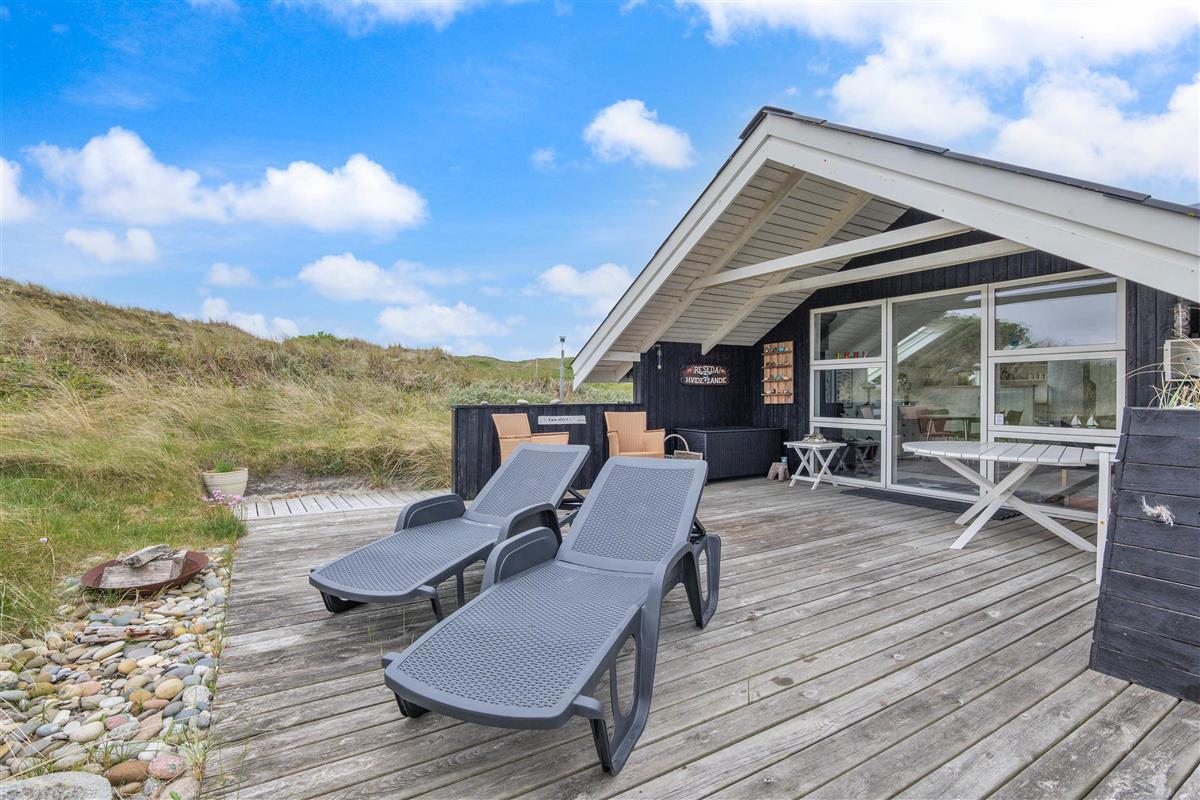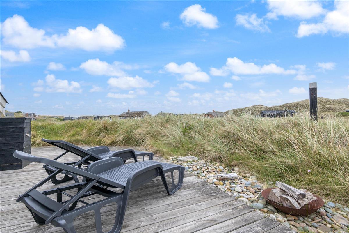 The spacious, sheltered and partially covered terrace is perfect for barbecues or sunbathing. The natural grounds include a shed and an outdoor shower (available April to November). The Danish west coast is just 550 metres away, as the holiday home sits in the second row behind the dunes.