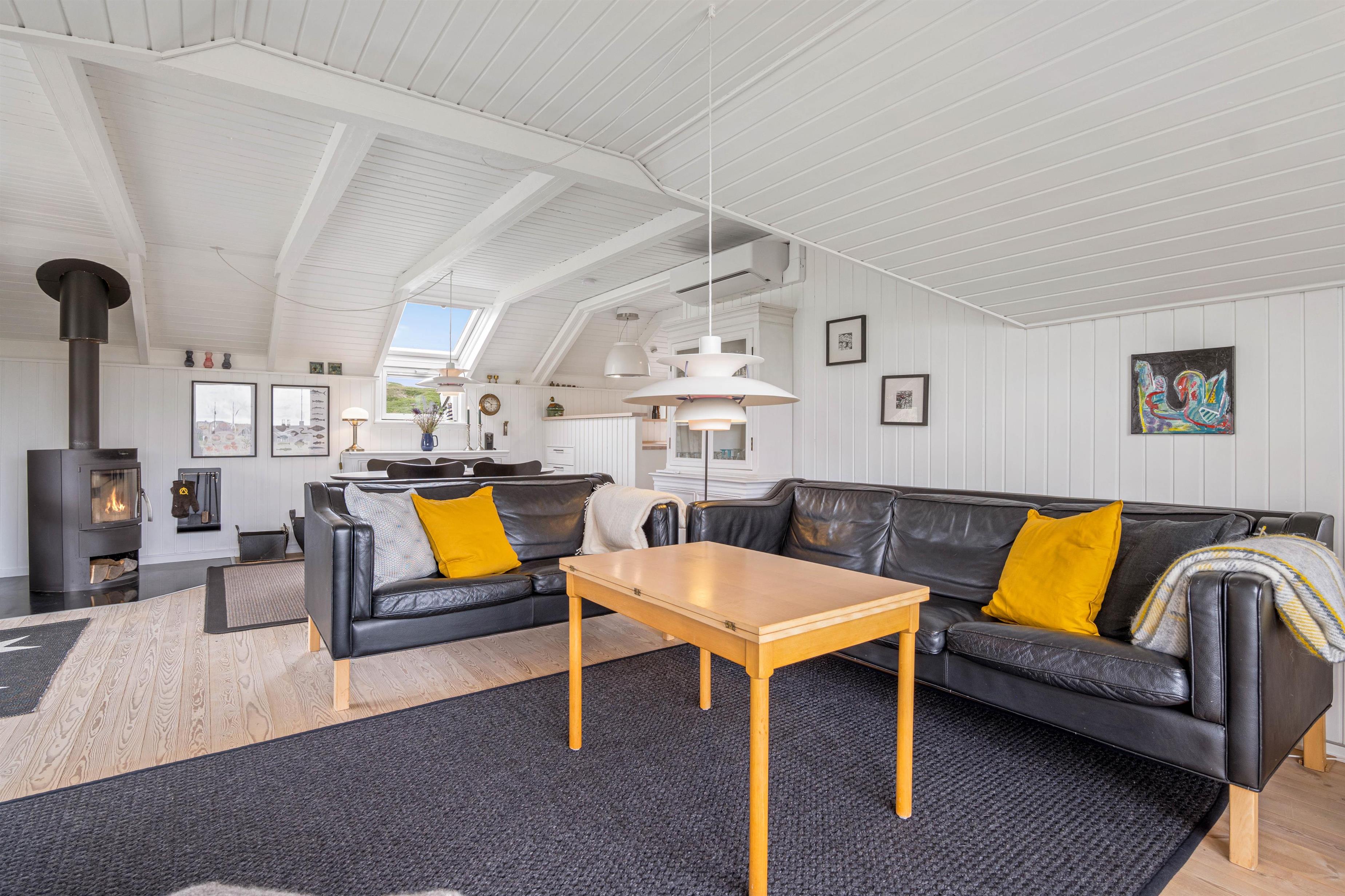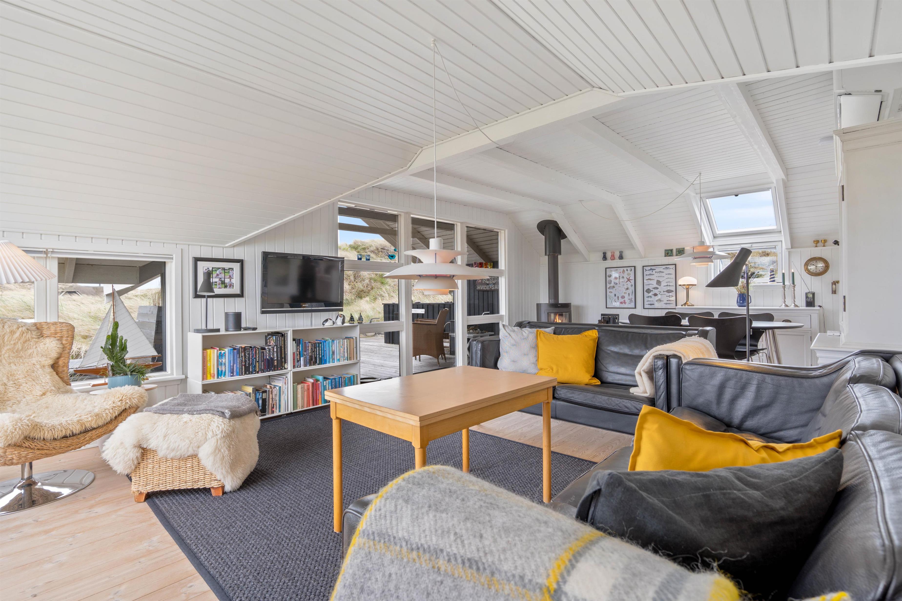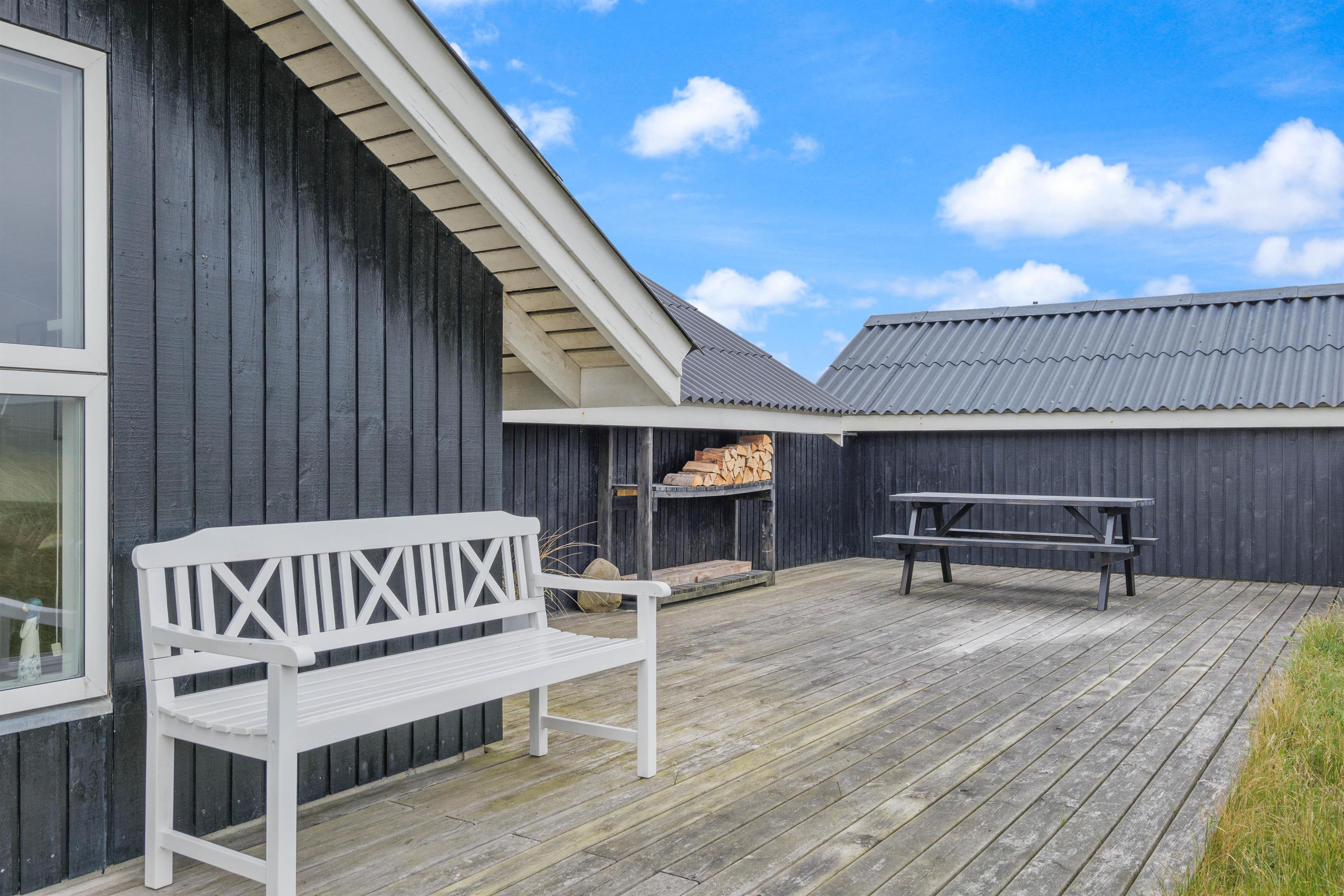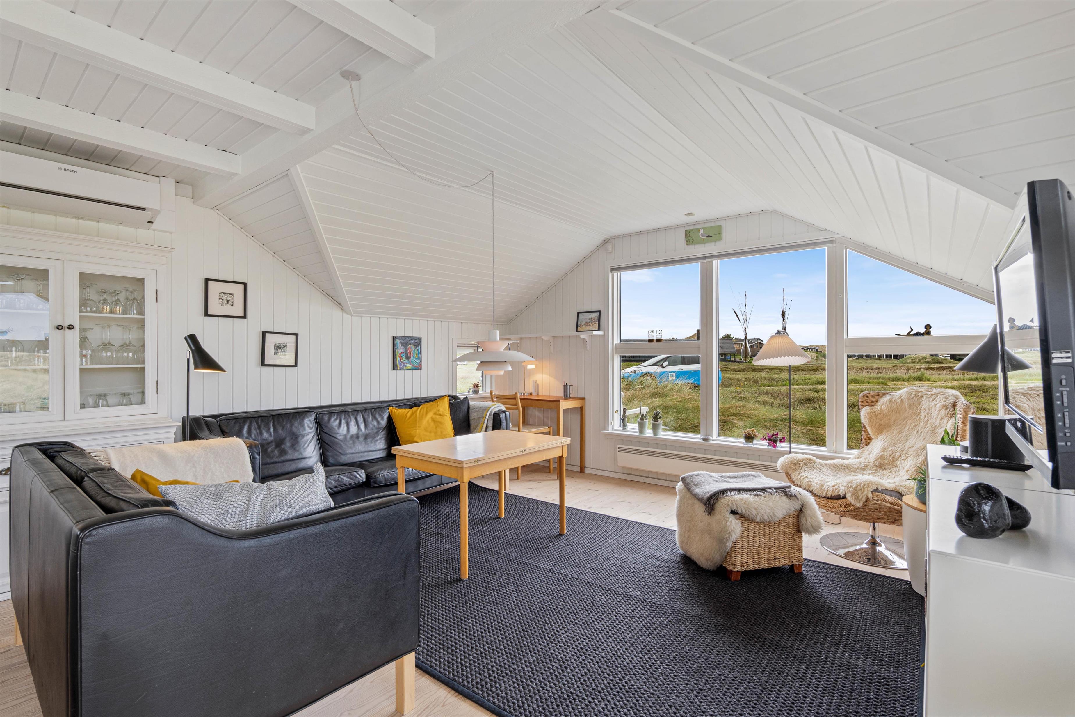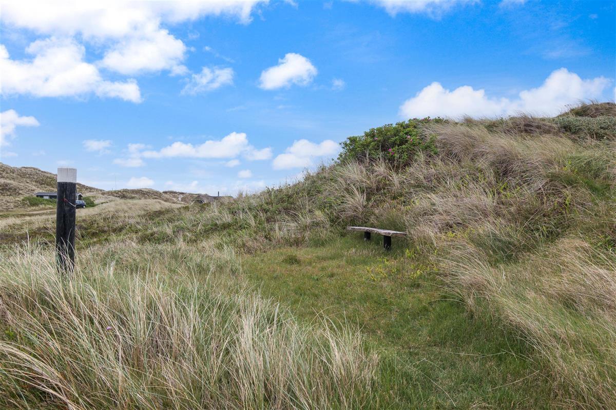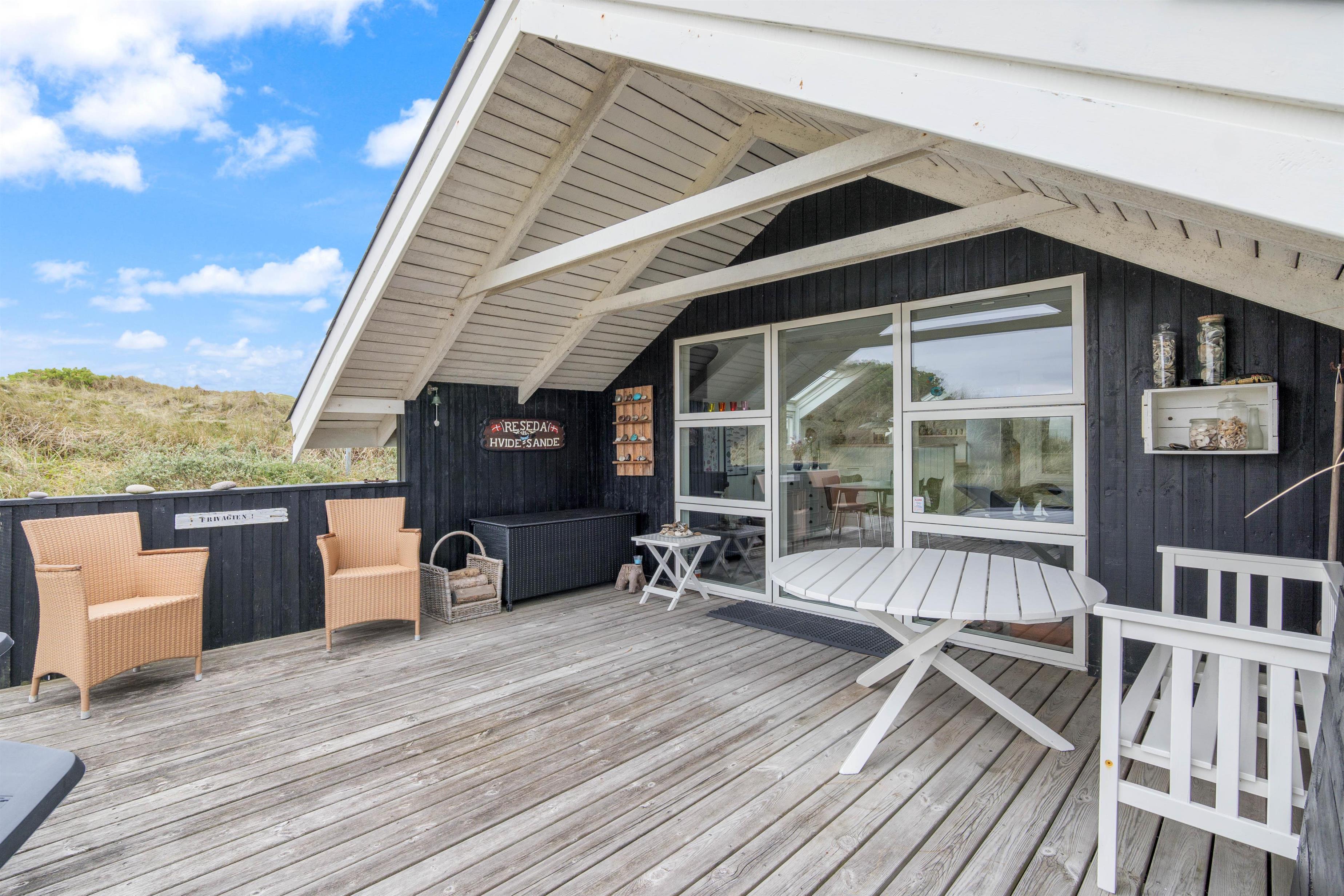 The spacious, sheltered and partially covered terrace is perfect for barbecues or sunbathing. The natural grounds include a shed and an outdoor shower (available April to November). The Danish west coast is just 550 metres away, as the holiday home sits in the second row behind the dunes.