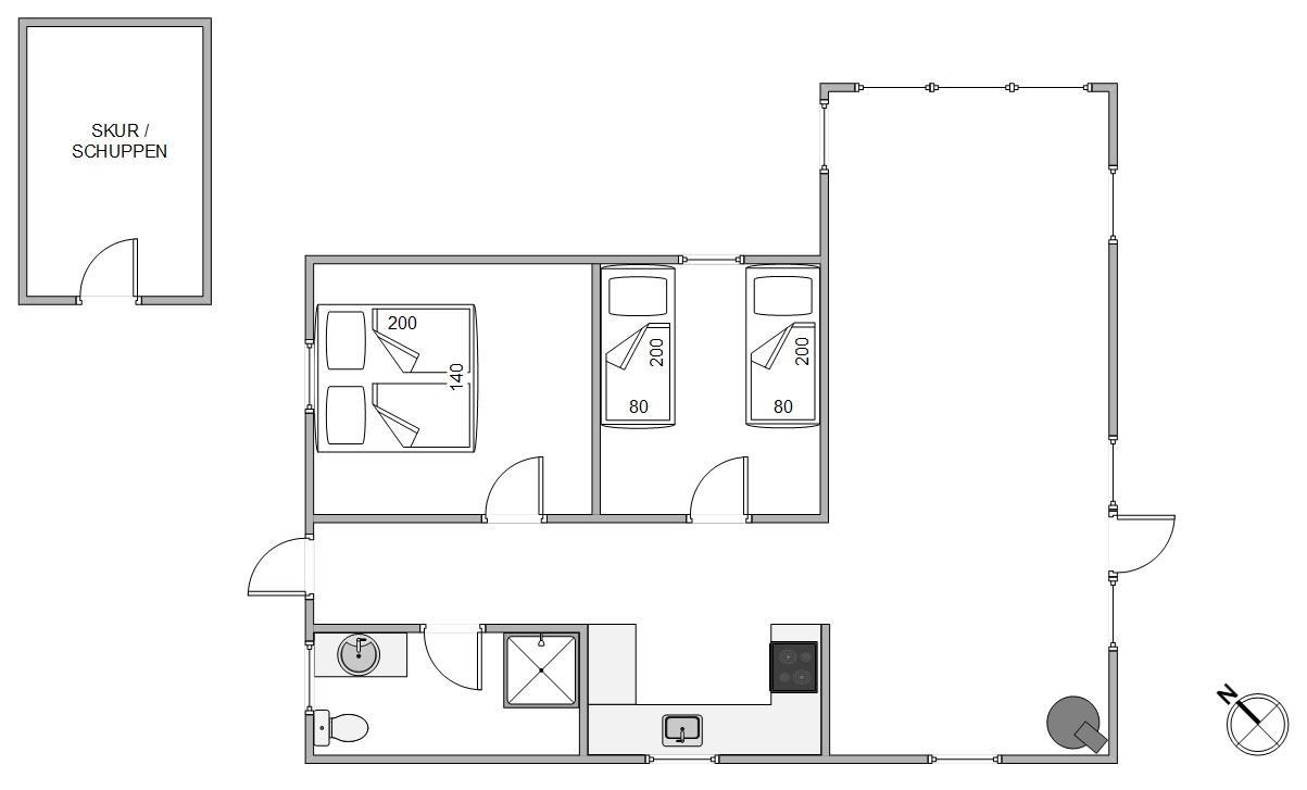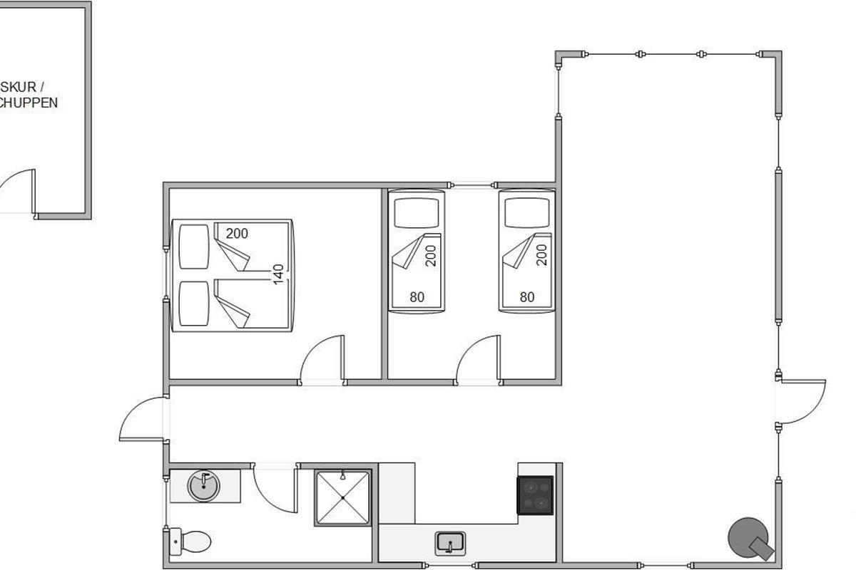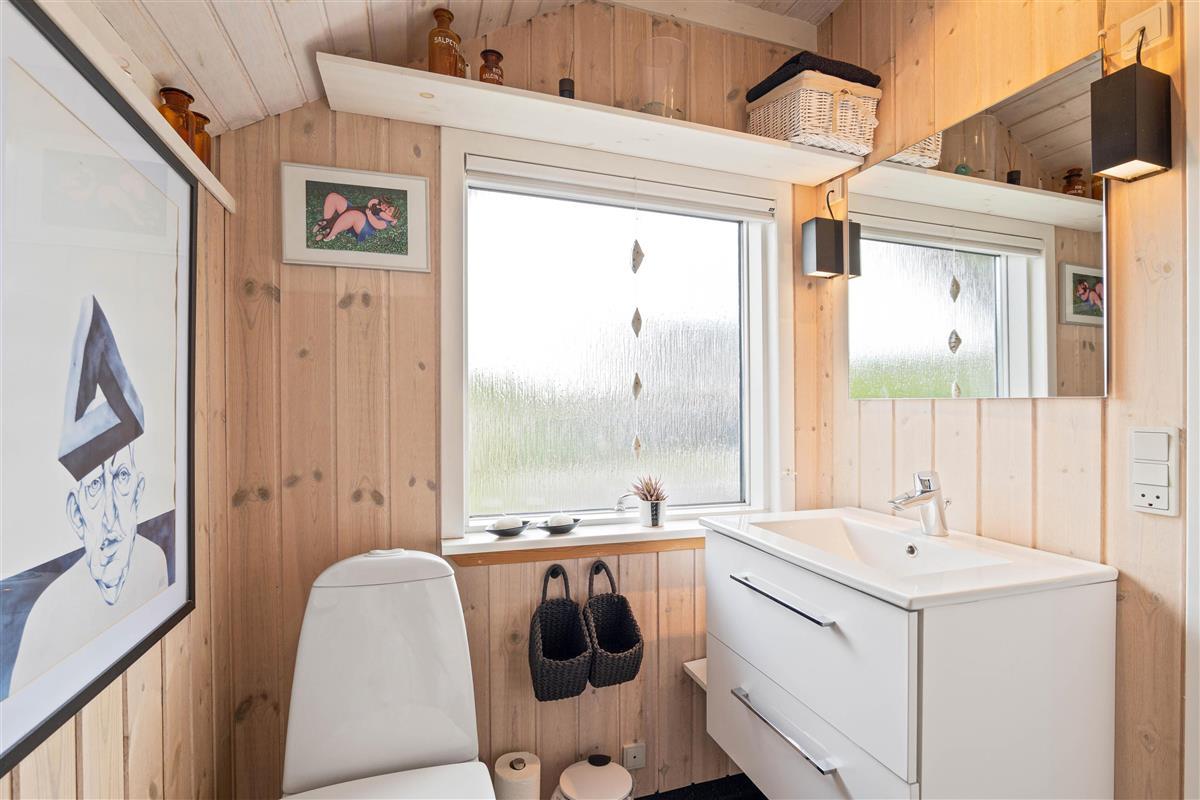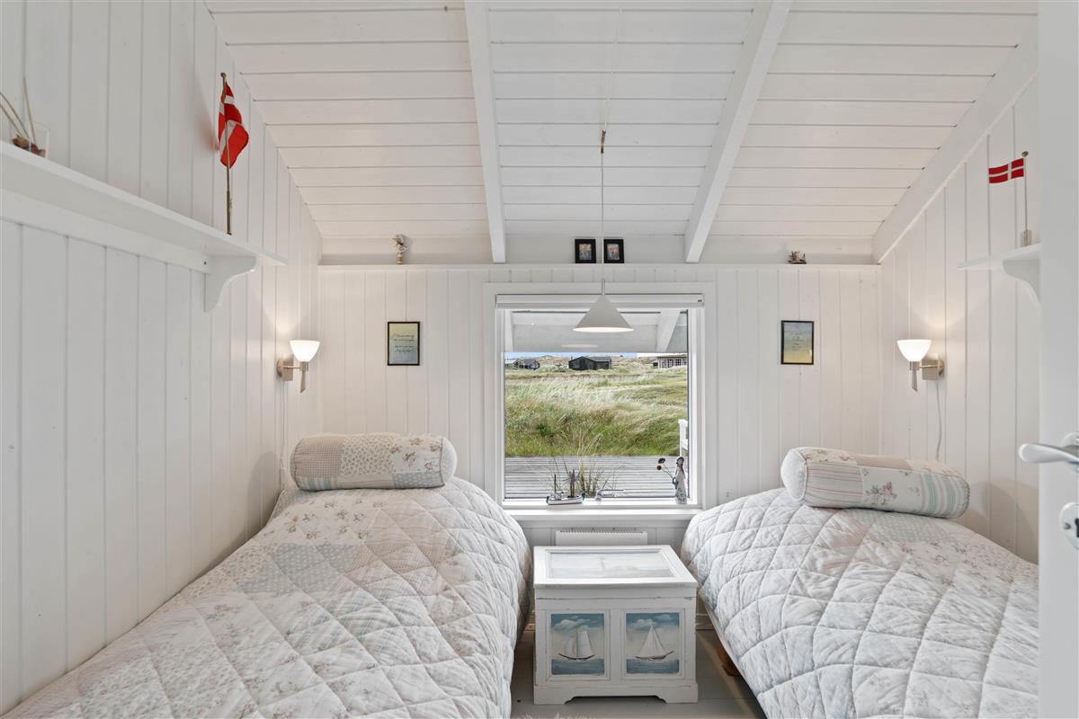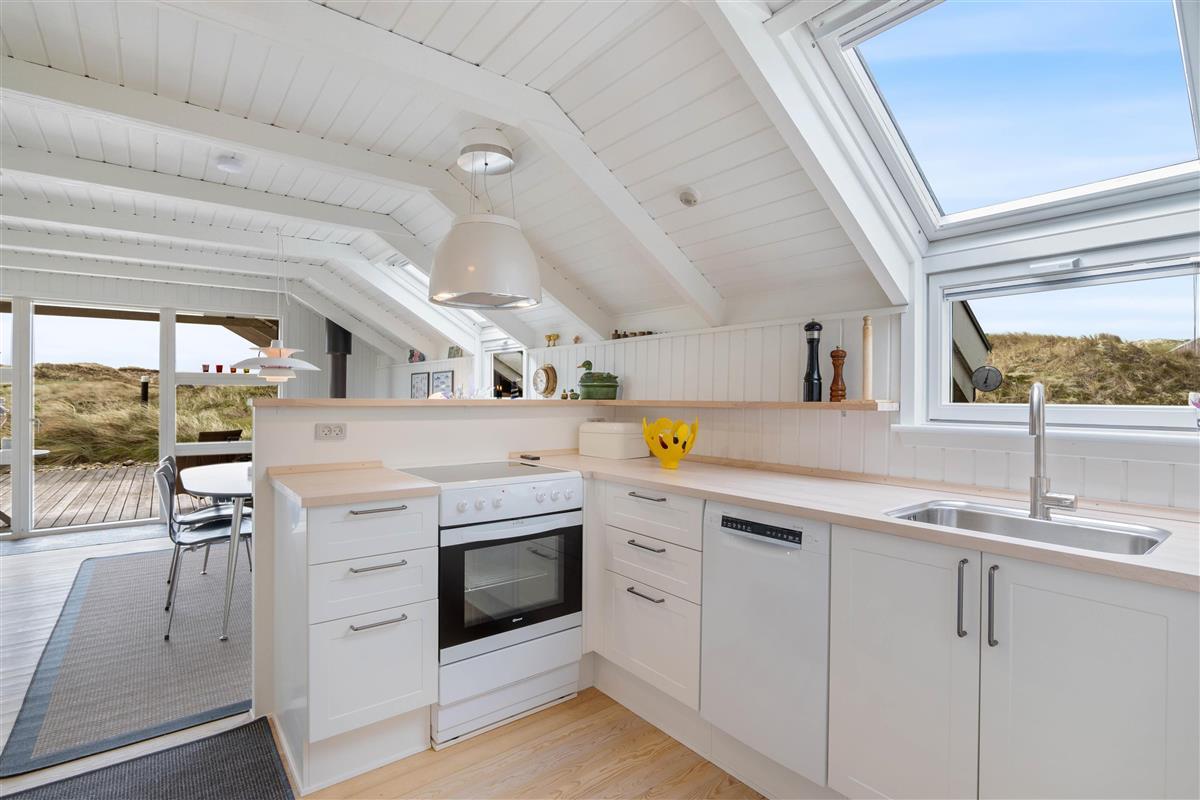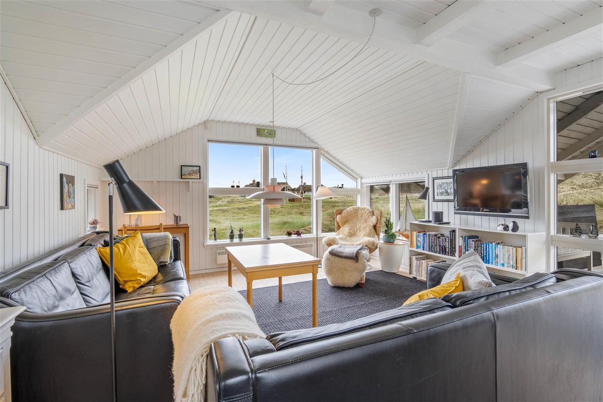 The spacious, sheltered and partially covered terrace is perfect for barbecues or sunbathing. The natural grounds include a shed and an outdoor shower (available April to November). The Danish west coast is just 550 metres away, as the holiday home sits in the second row behind the dunes.